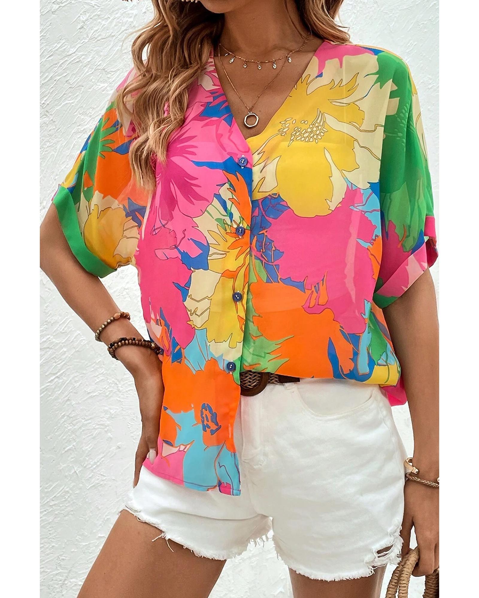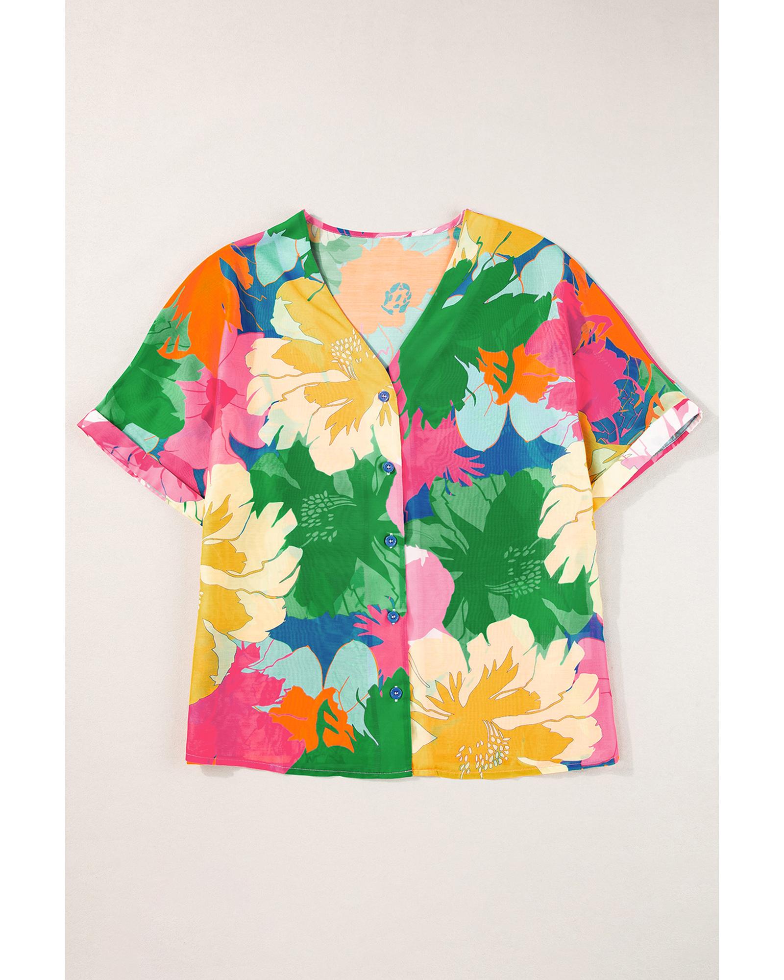 Multicolour Floral Print Folded Short Sleeve Shirt – XL
