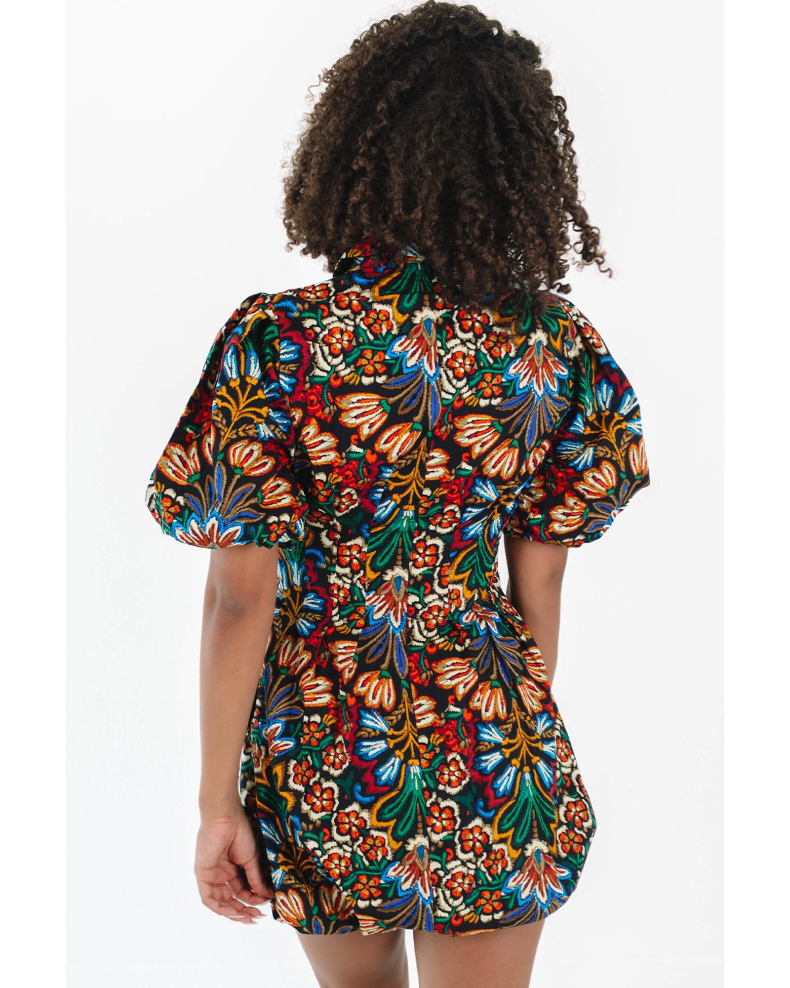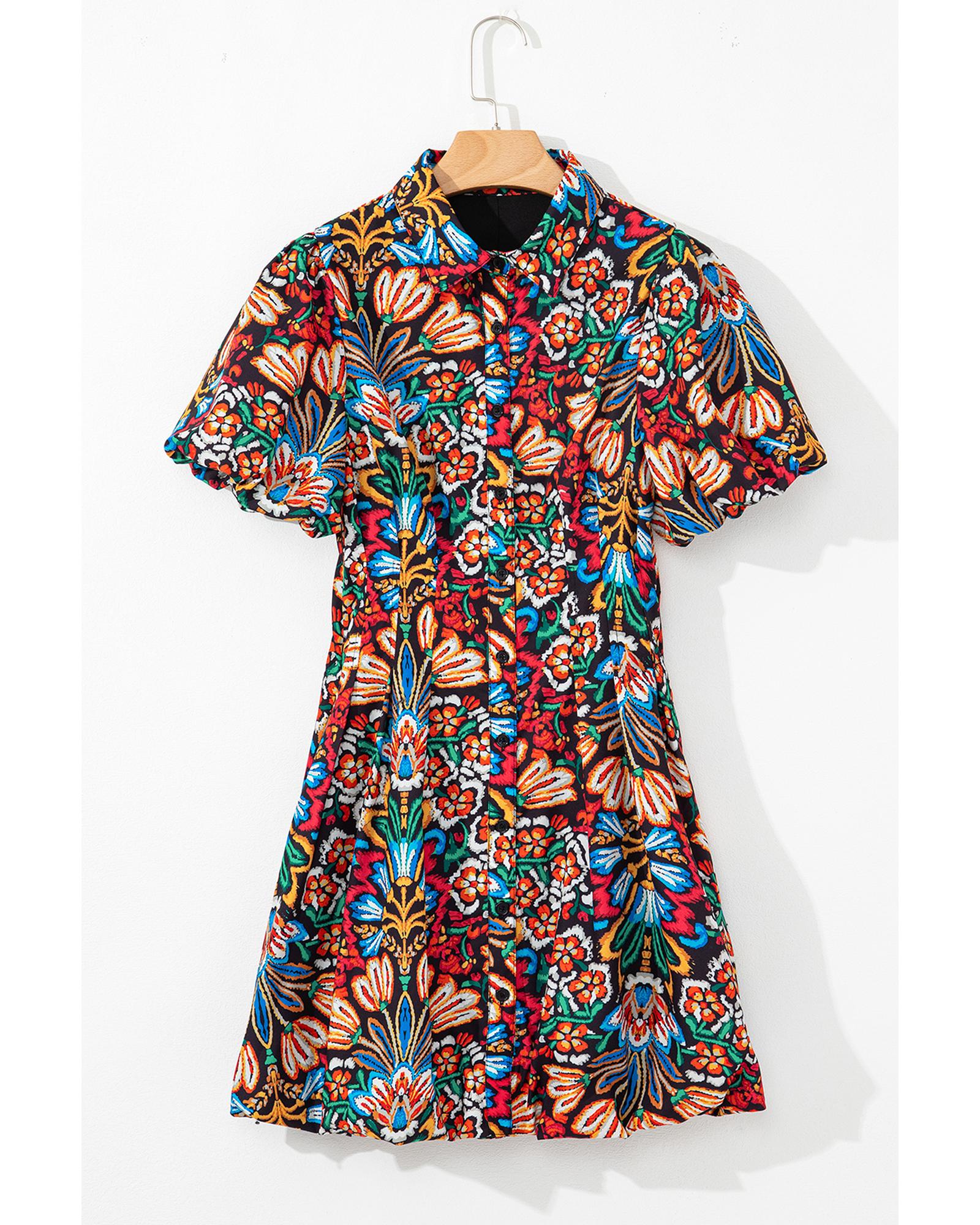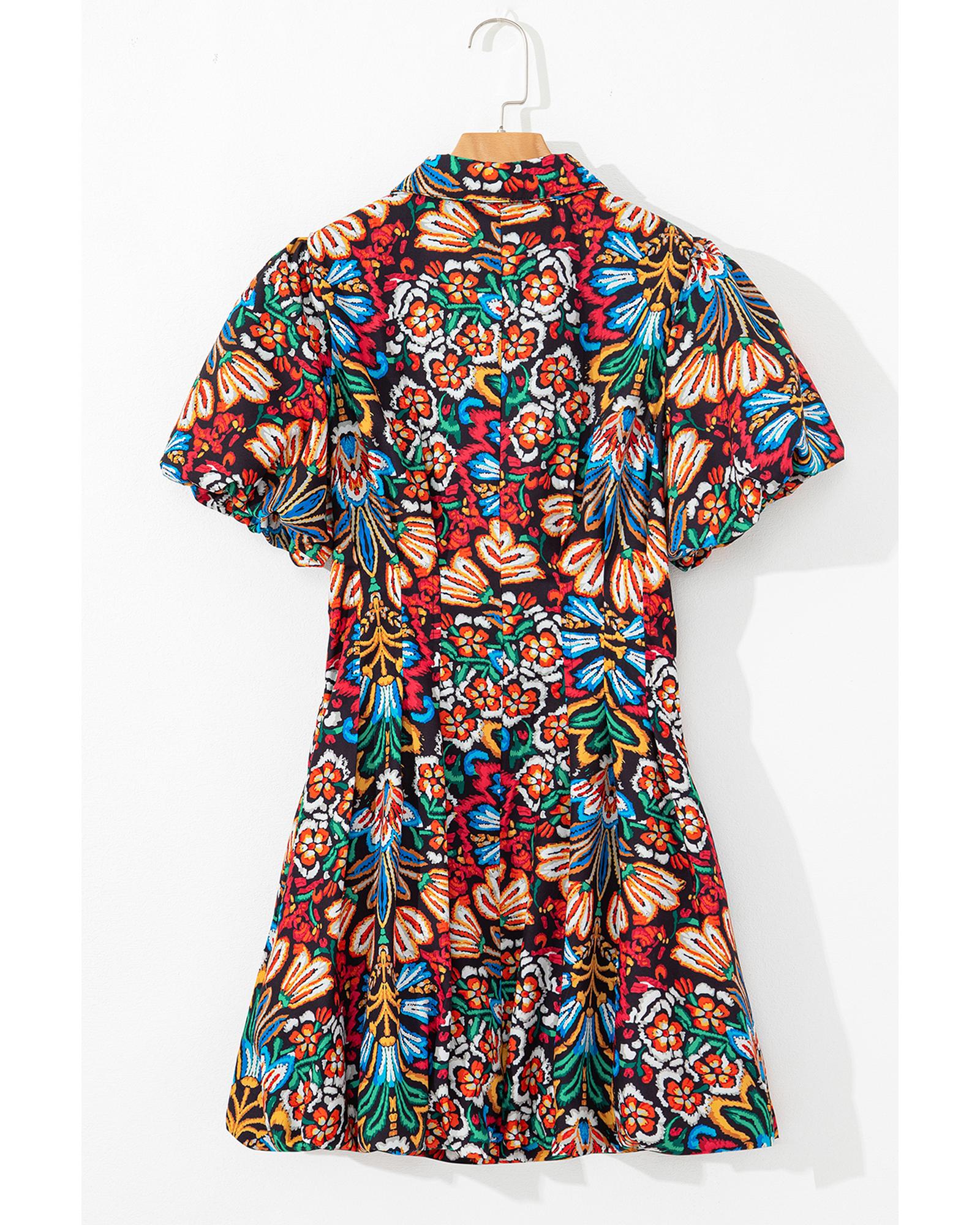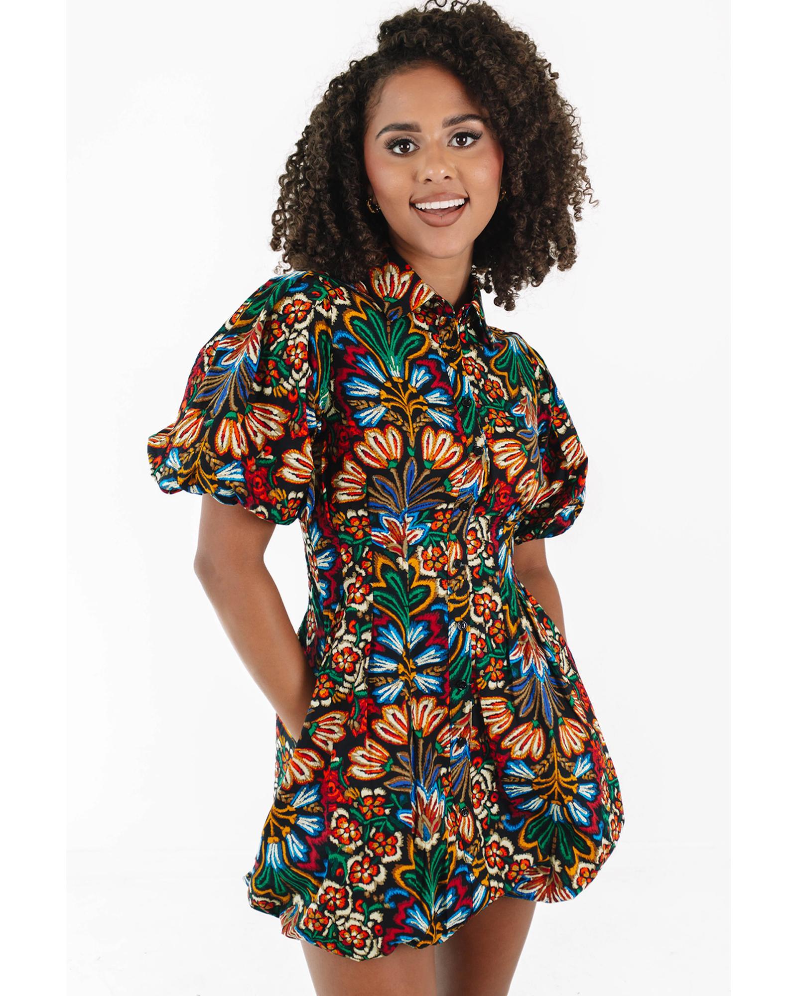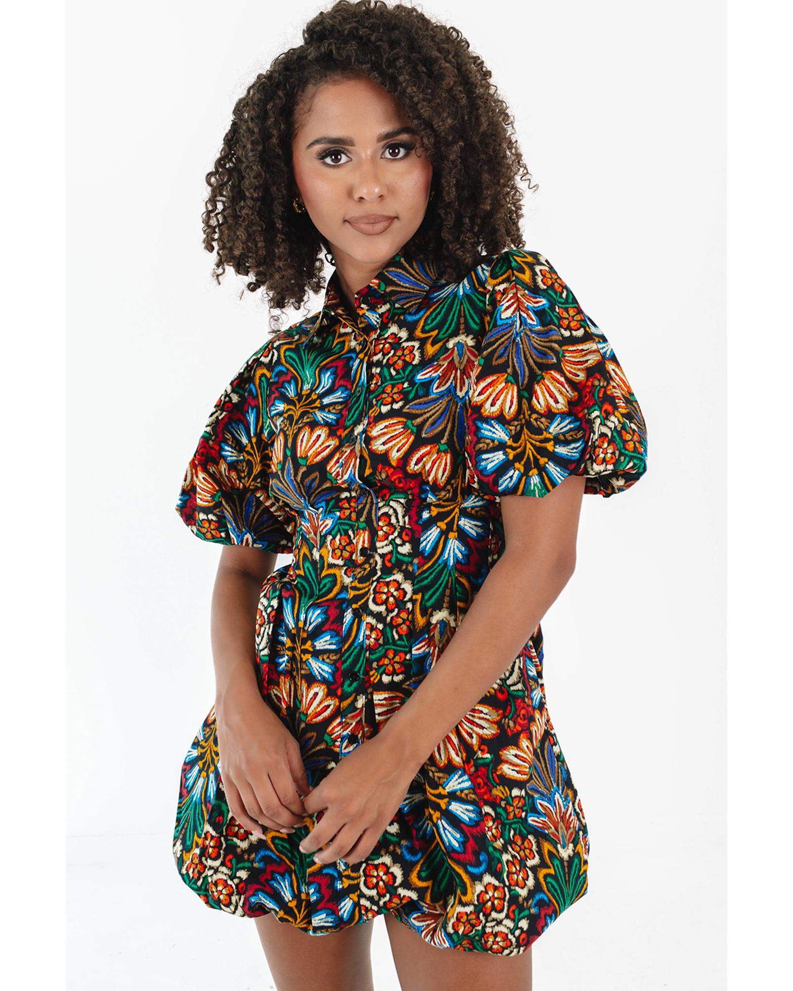 Multicolour Floral Puff Short Sleeve Shirt Mini Dress – L