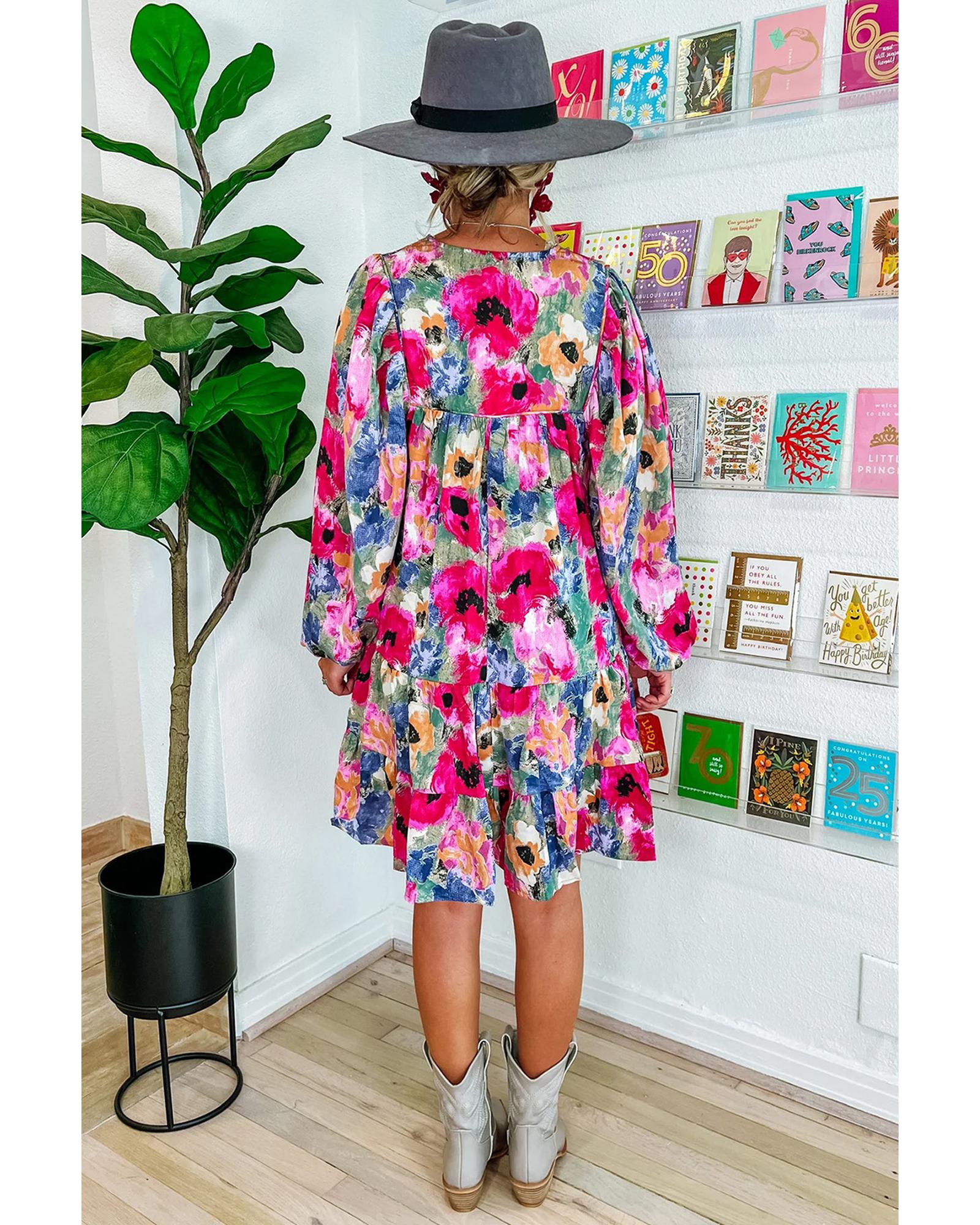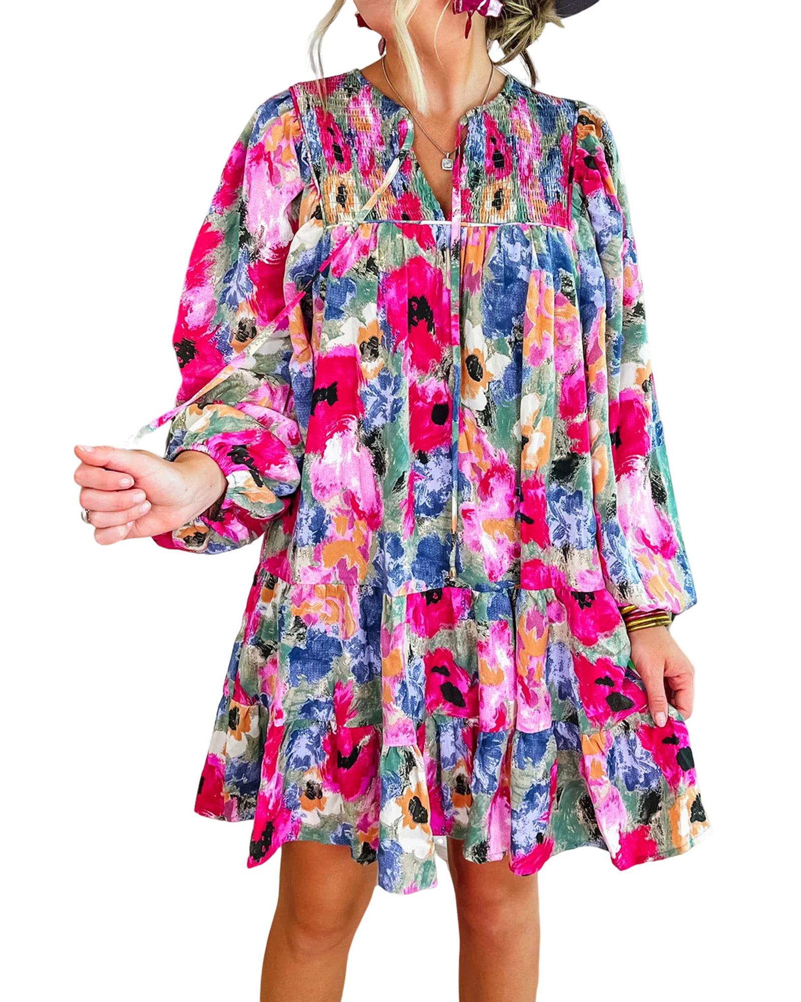 Multicolour Floral Tie Neck Bubble Sleeve Shift Dress – L