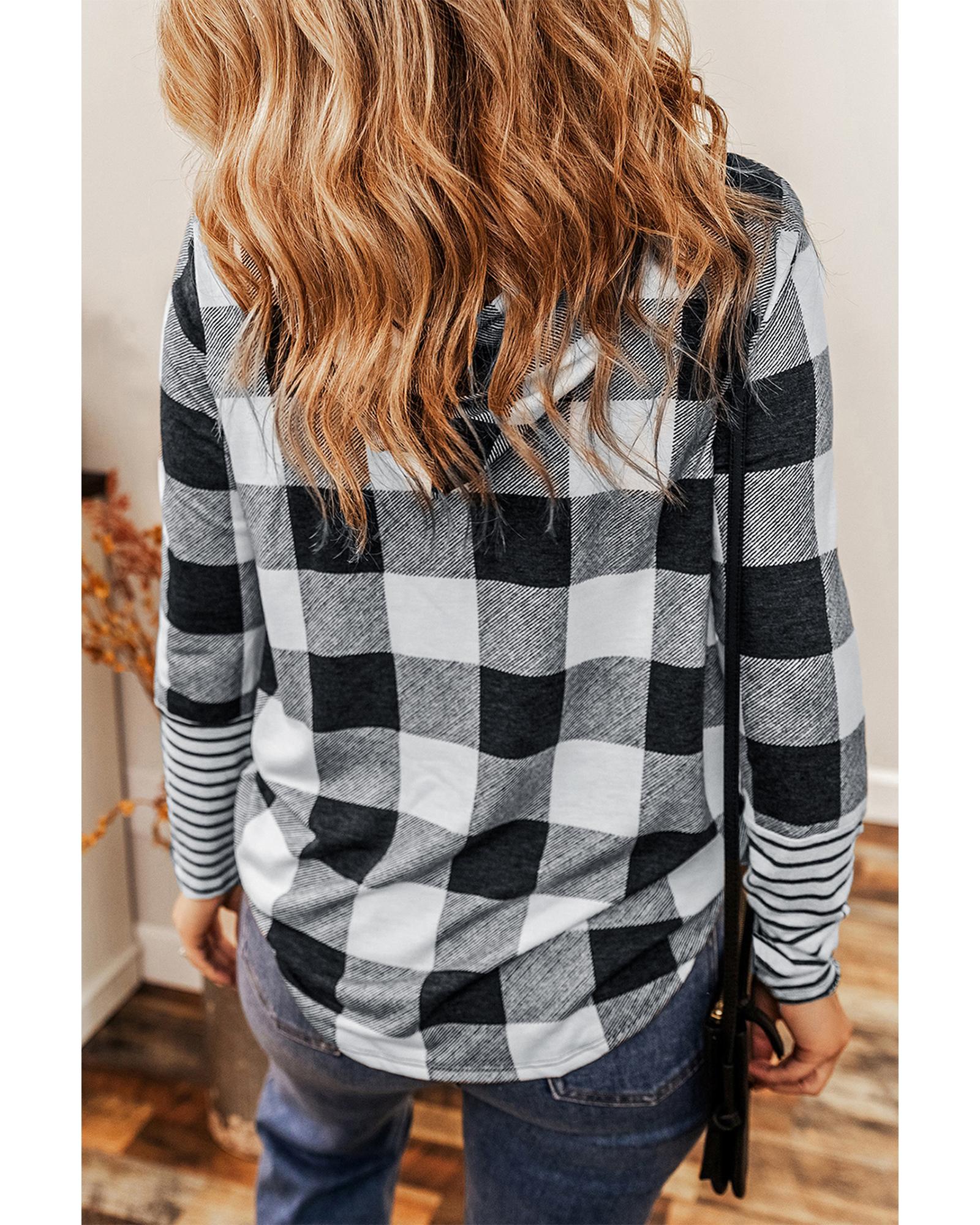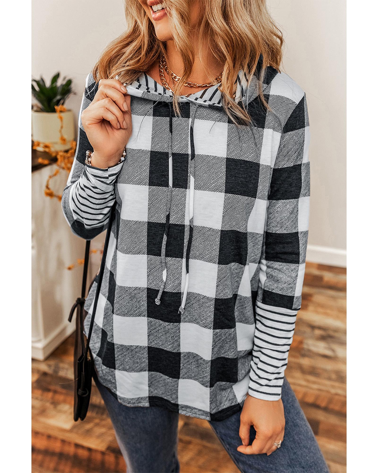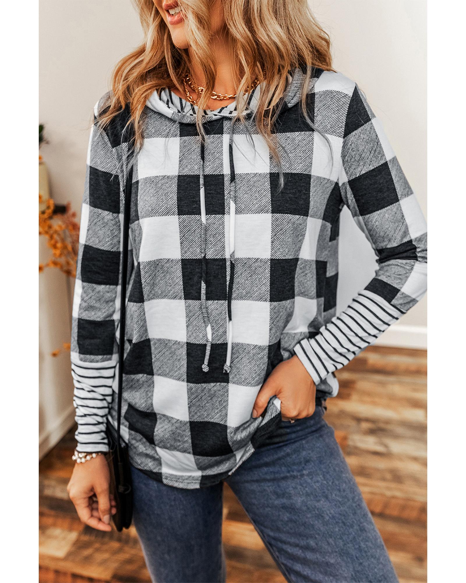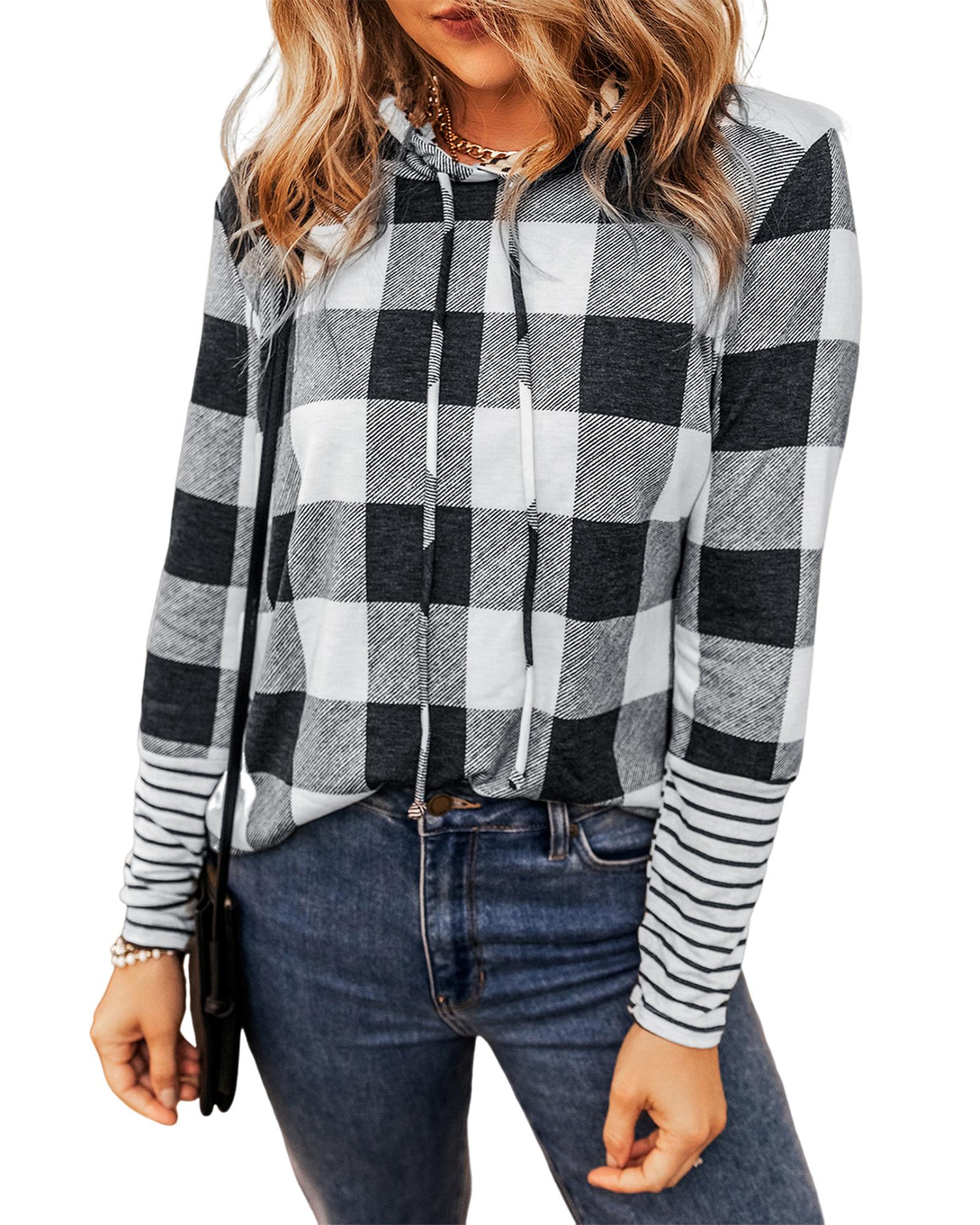 Combines style and comfort Plaid and striped print for a classic look Pullover design with drawstring and hood back Casual and popular among different ages Pairs well with jeans skirts and pants Available in multiple sizes High elasticity for a comfortable fit - Material: Soft comfortable fabric blend. Likely a cotton blend with added polyester for stretch and durability. The cuffs show a different striped fabric potentially a cotton rib knit.
