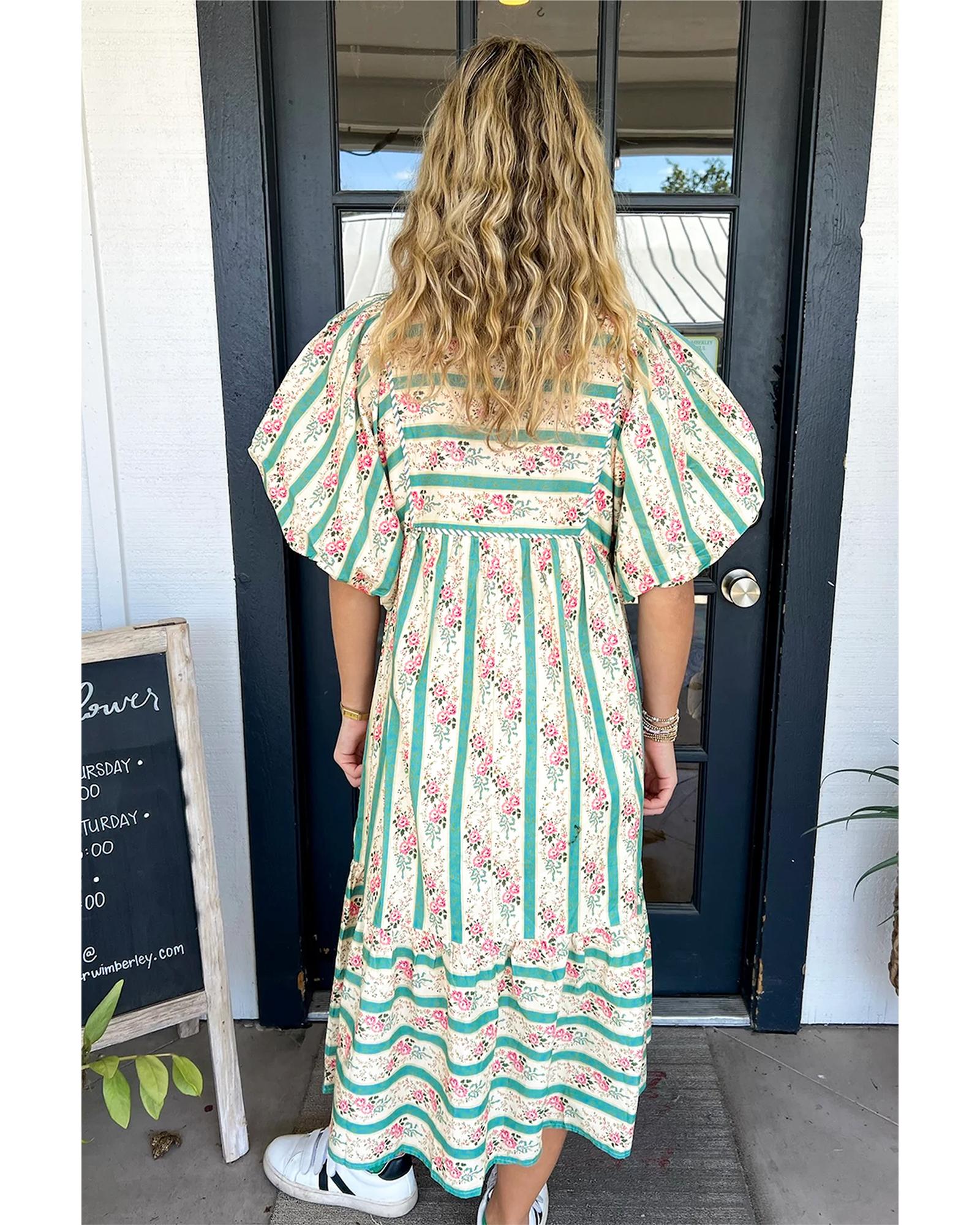 Multicolour Striped Floral Print Tie Split Neck Puff Sleeve Midi Dress – L
