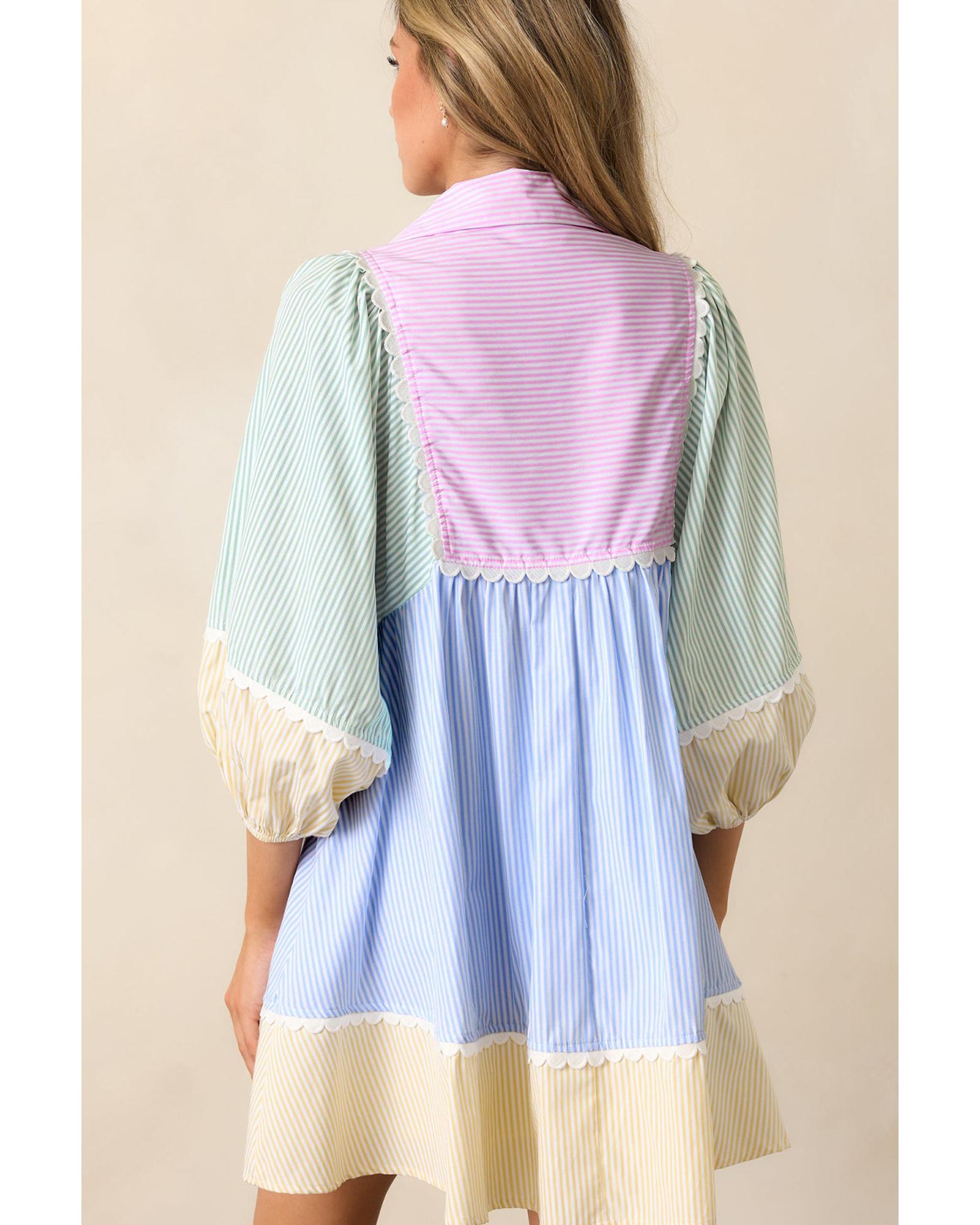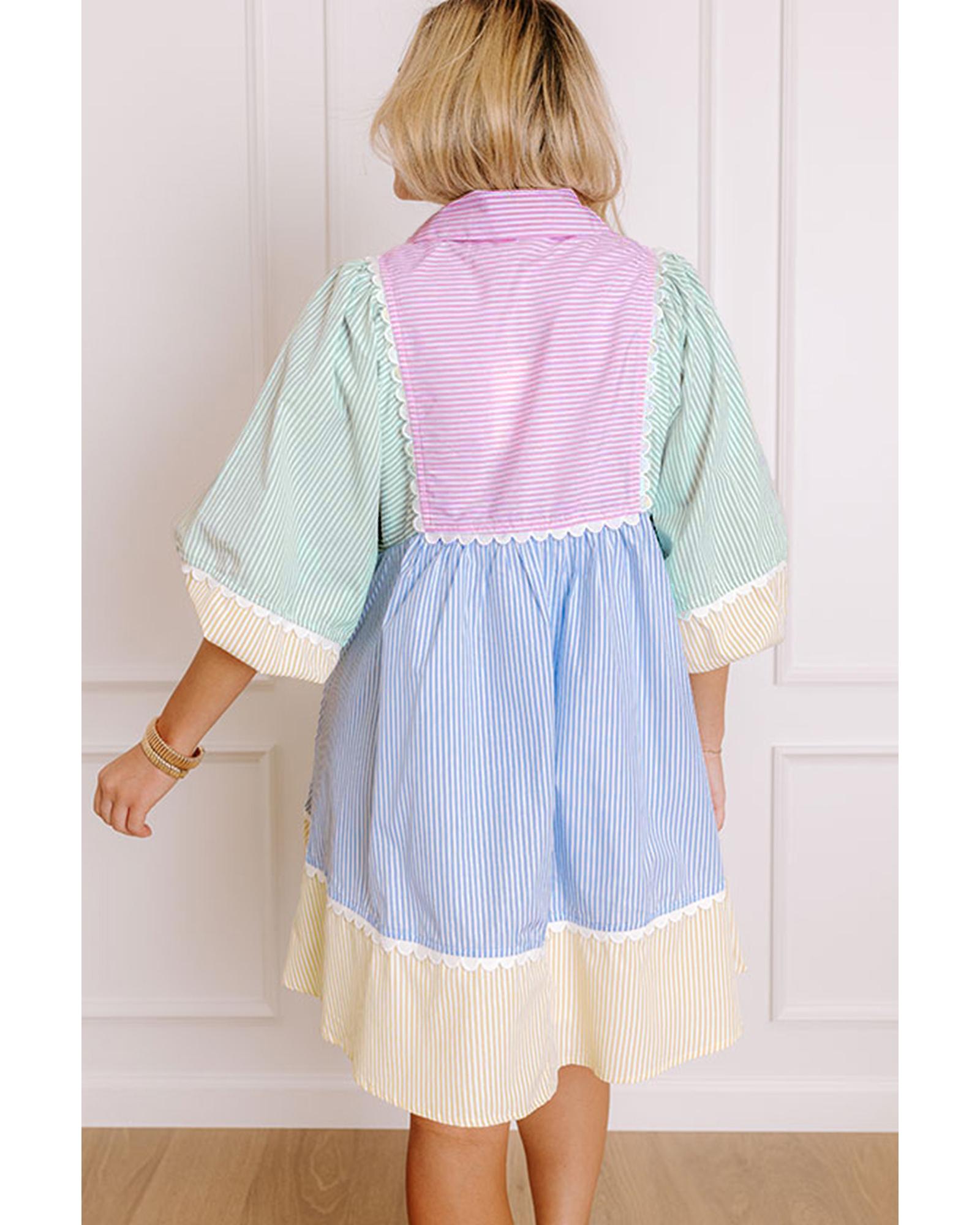 Multicolour Striped Patchwork Ric Rac Puff Sleeve Collared Mini Dress – M