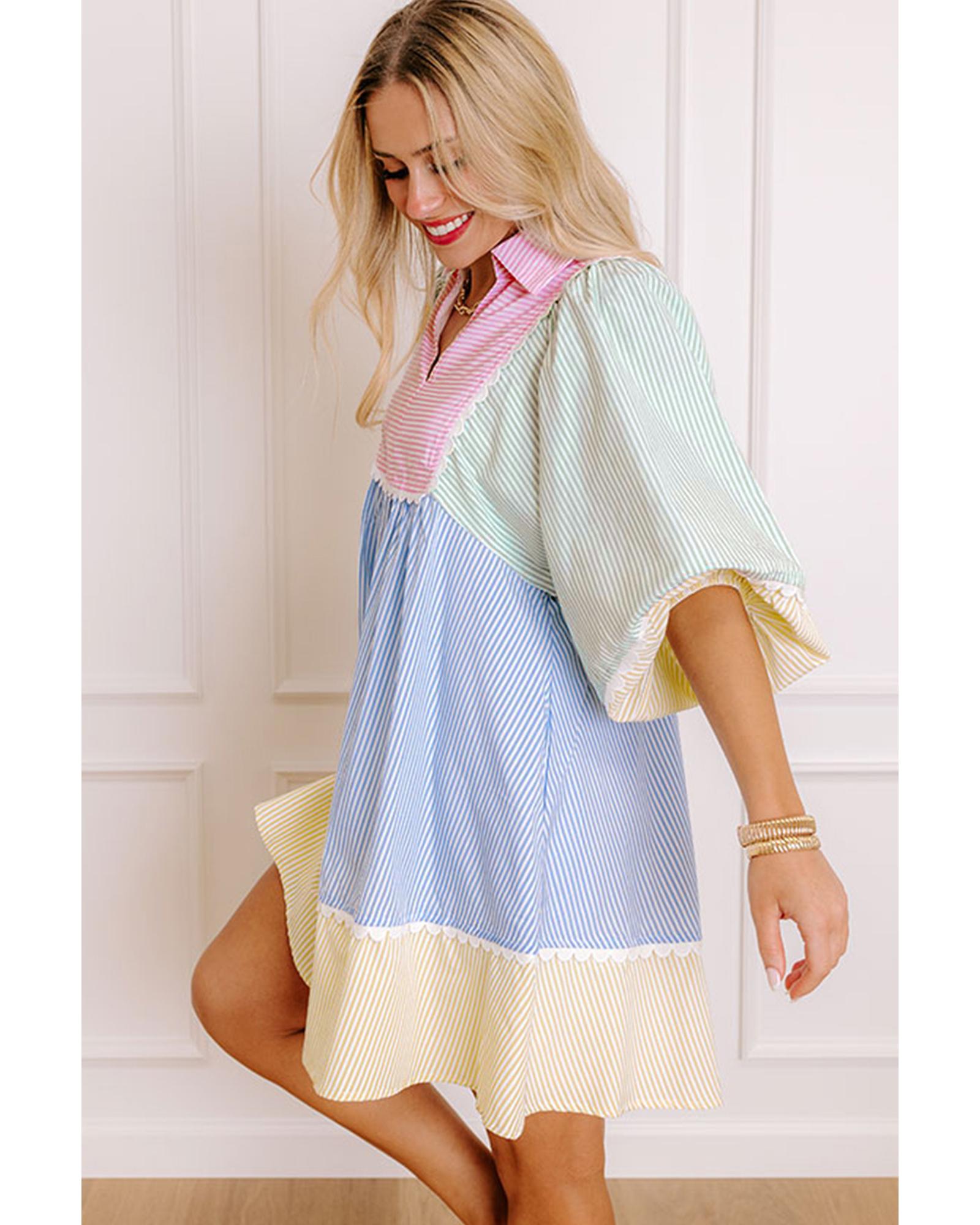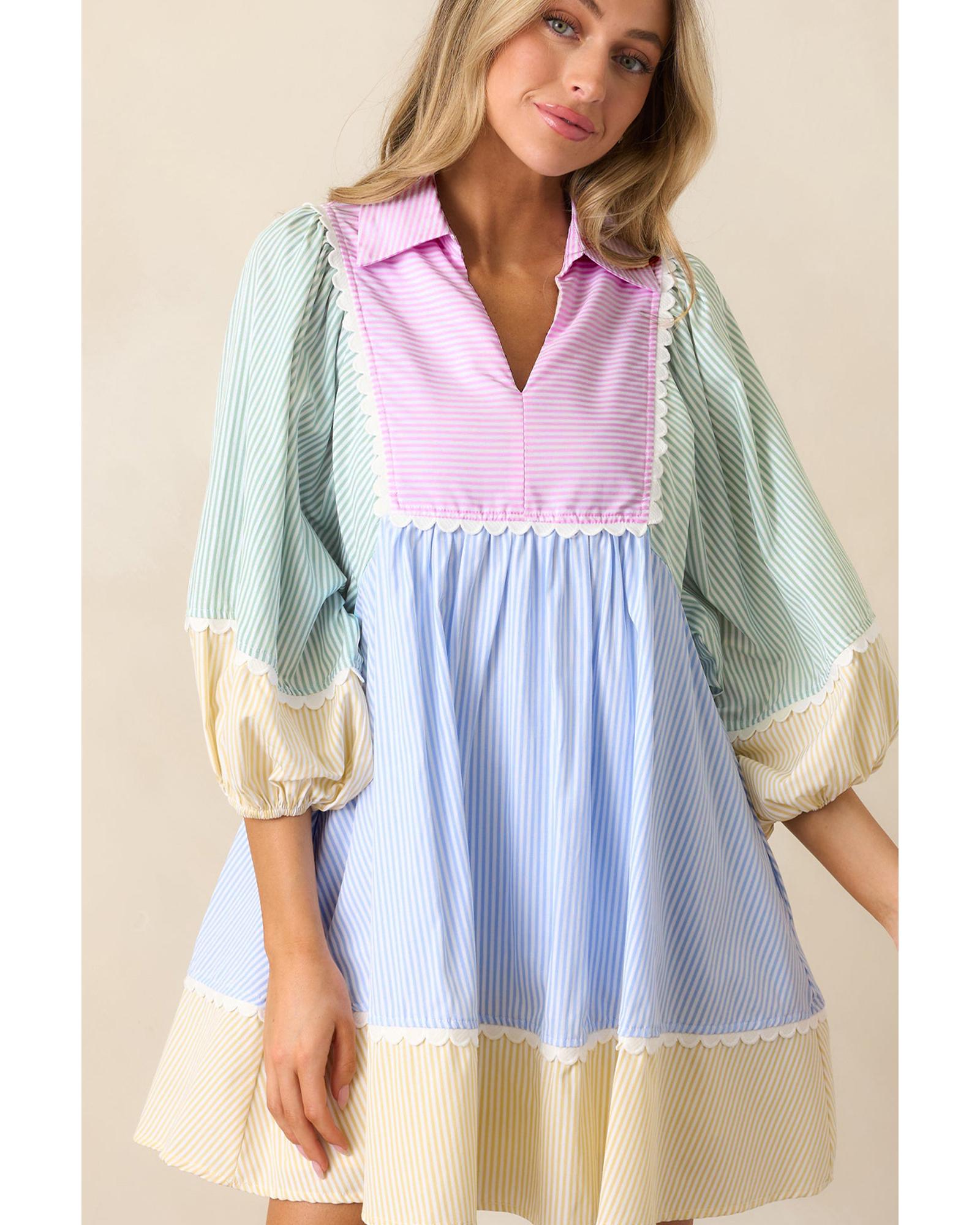 Multicolour Striped Patchwork Ric Rac Puff Sleeve Collared Mini Dress – S