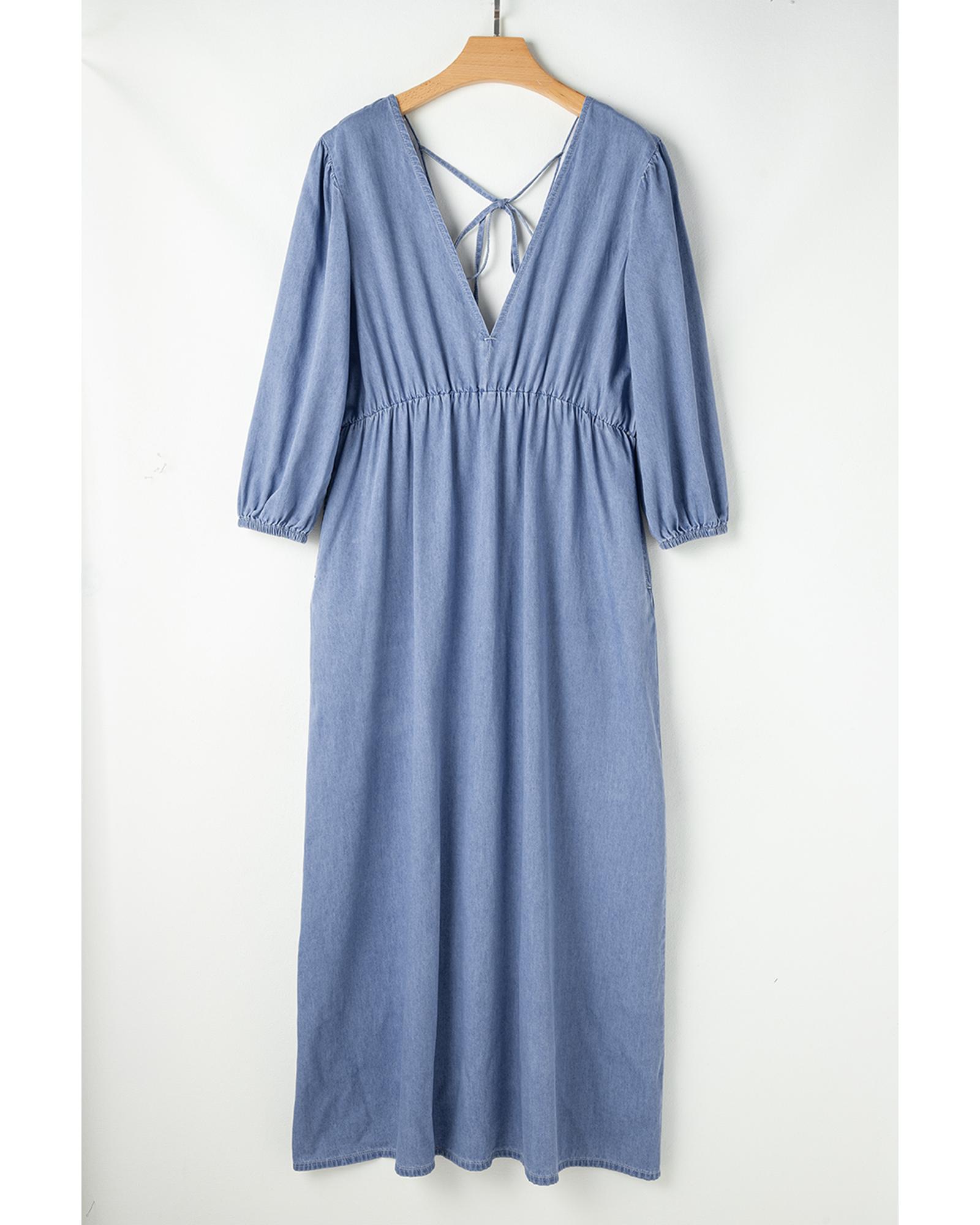Myosotis Chambray Deep V Neck Bracelet Sleeve Maxi Dress – M