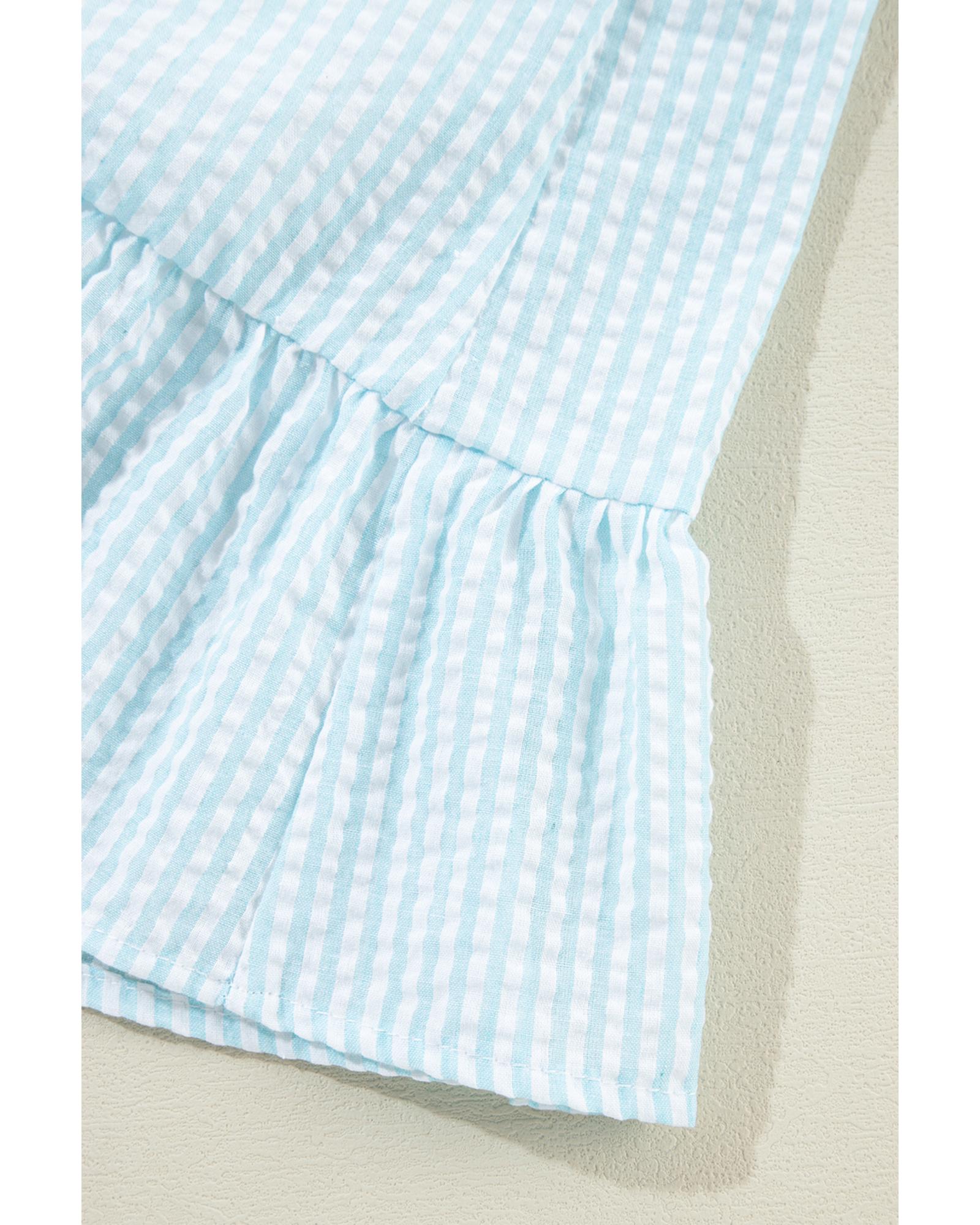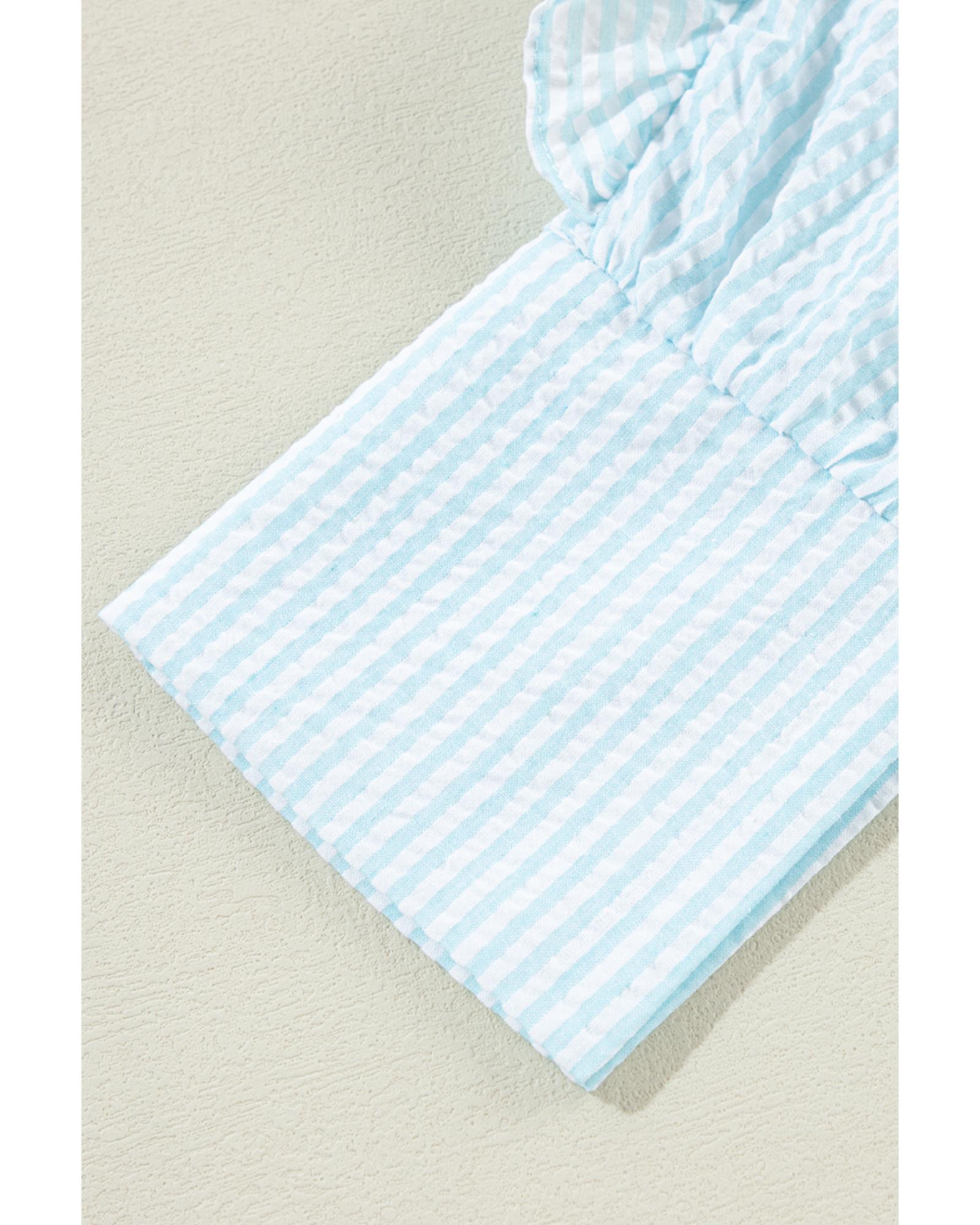 Myosotis Seersucker Ruffled Puff Sleeve Stand Neck Mini Dress – L