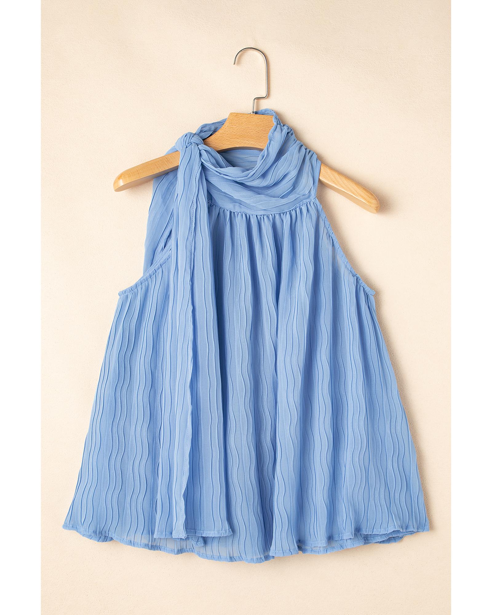 Myosotis Textured Pleated Tied Mock Neck Flowy Tank Top – L