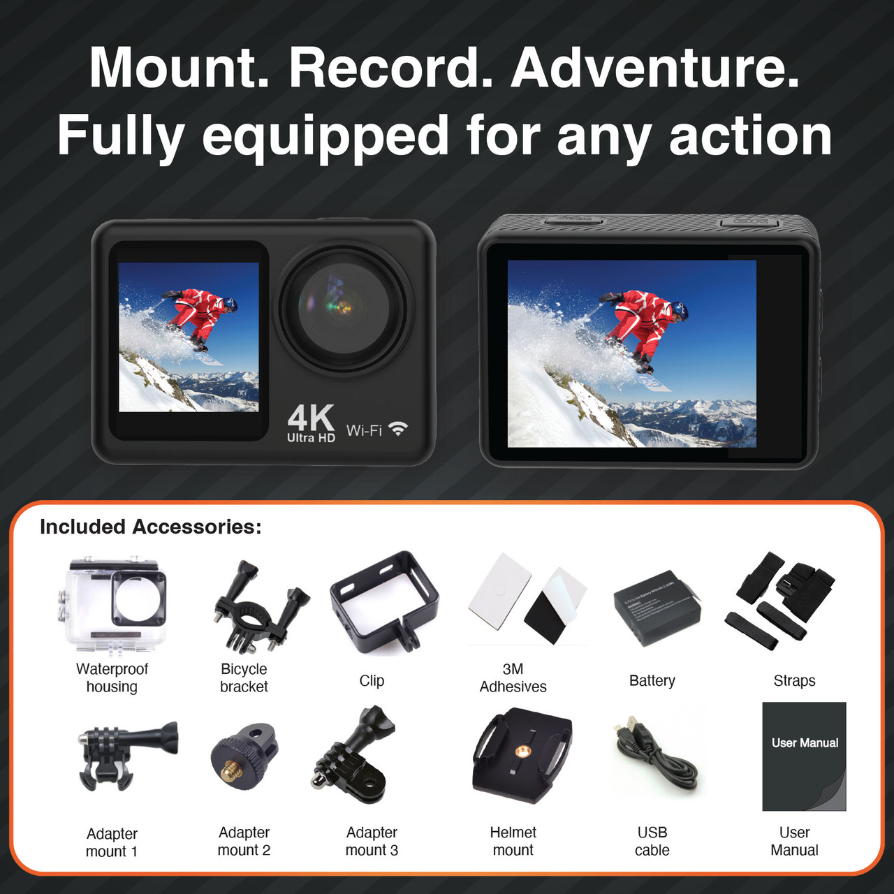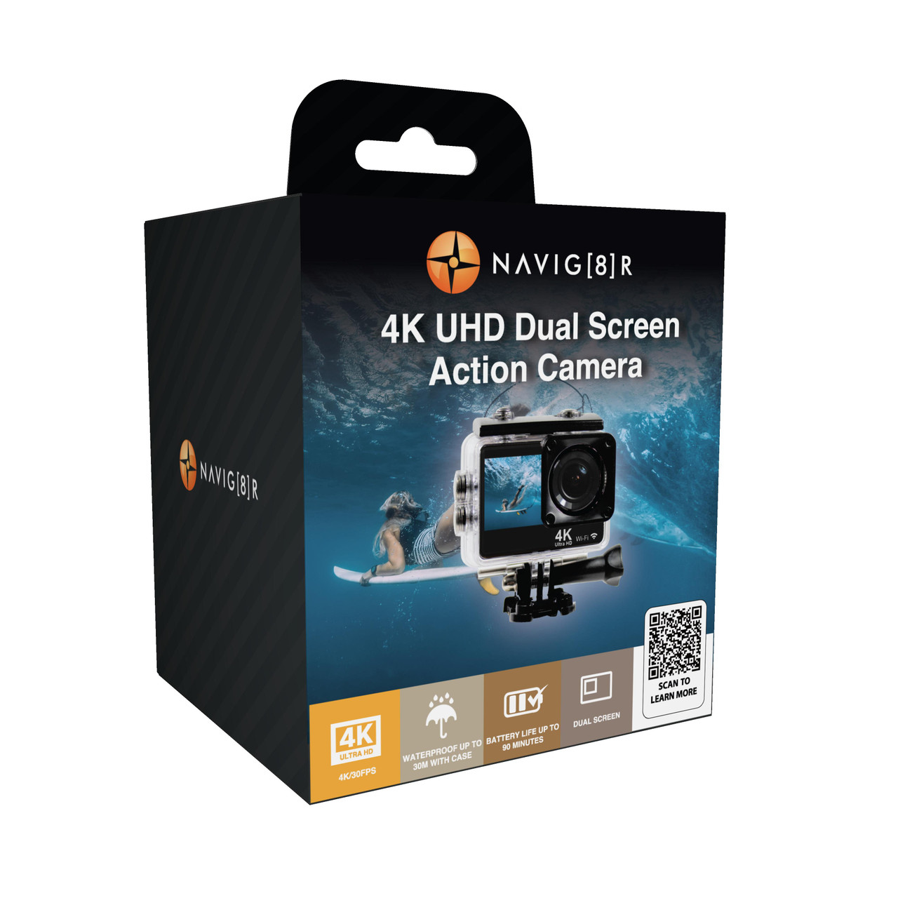Adventure. Captured. Designed for those who push the limits, the Navig8r 4K UHD Dual Screen Action Camera is built to go wherever the adventure takes you. From deep dives to rugged mountain trails, it delivers stunning 4K Ultra HD video, a dual-screen design, and rugged waterproof durabilityso you never miss a moment. Whether youre an explorer, vlogger, or thrill-seeker, this is the camera that keeps up.