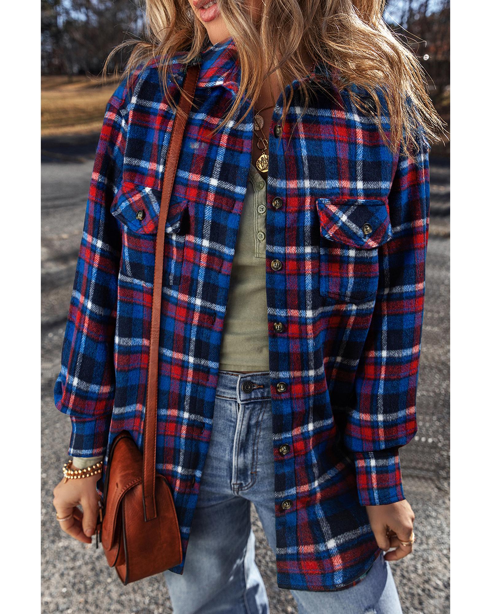 Navy Blue Plaid Flap Pocket Button Up Shacket – M