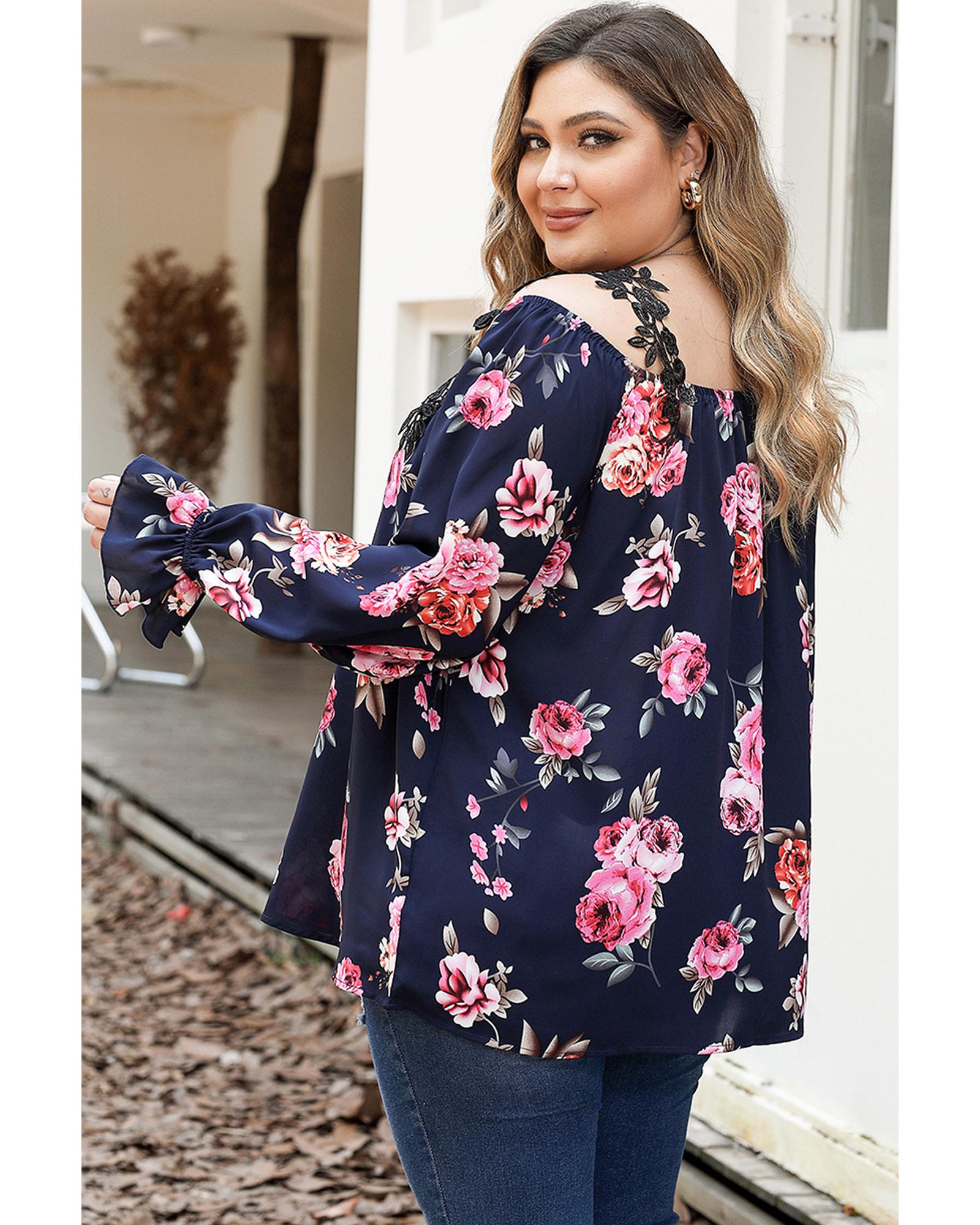 Navy Blue Plus Size Crochet Detail Cold shoulder Floral Blouse – 1X