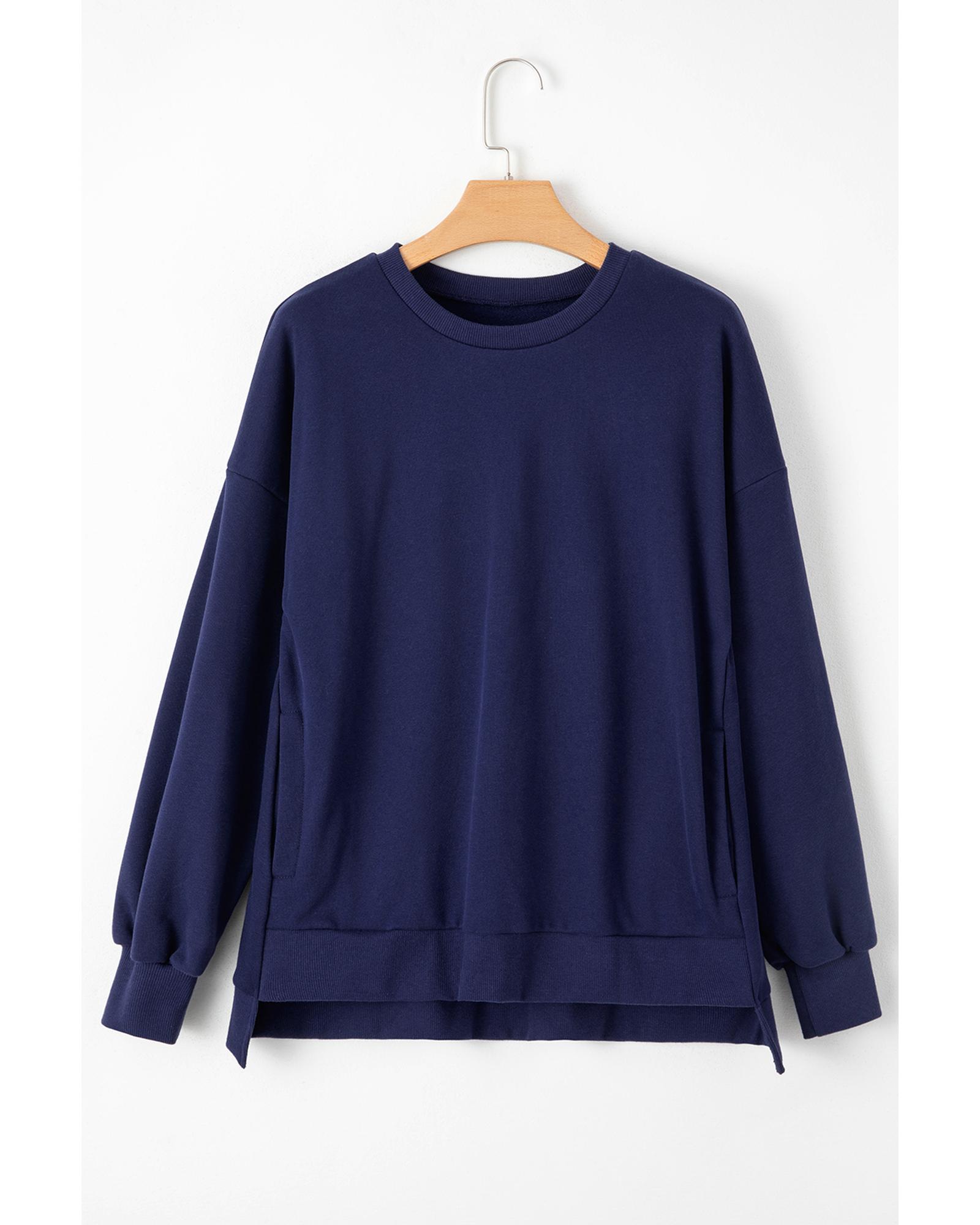 Navy Blue Solid Fleece Lined Drop Shoulder High Low Sweatshirt – M