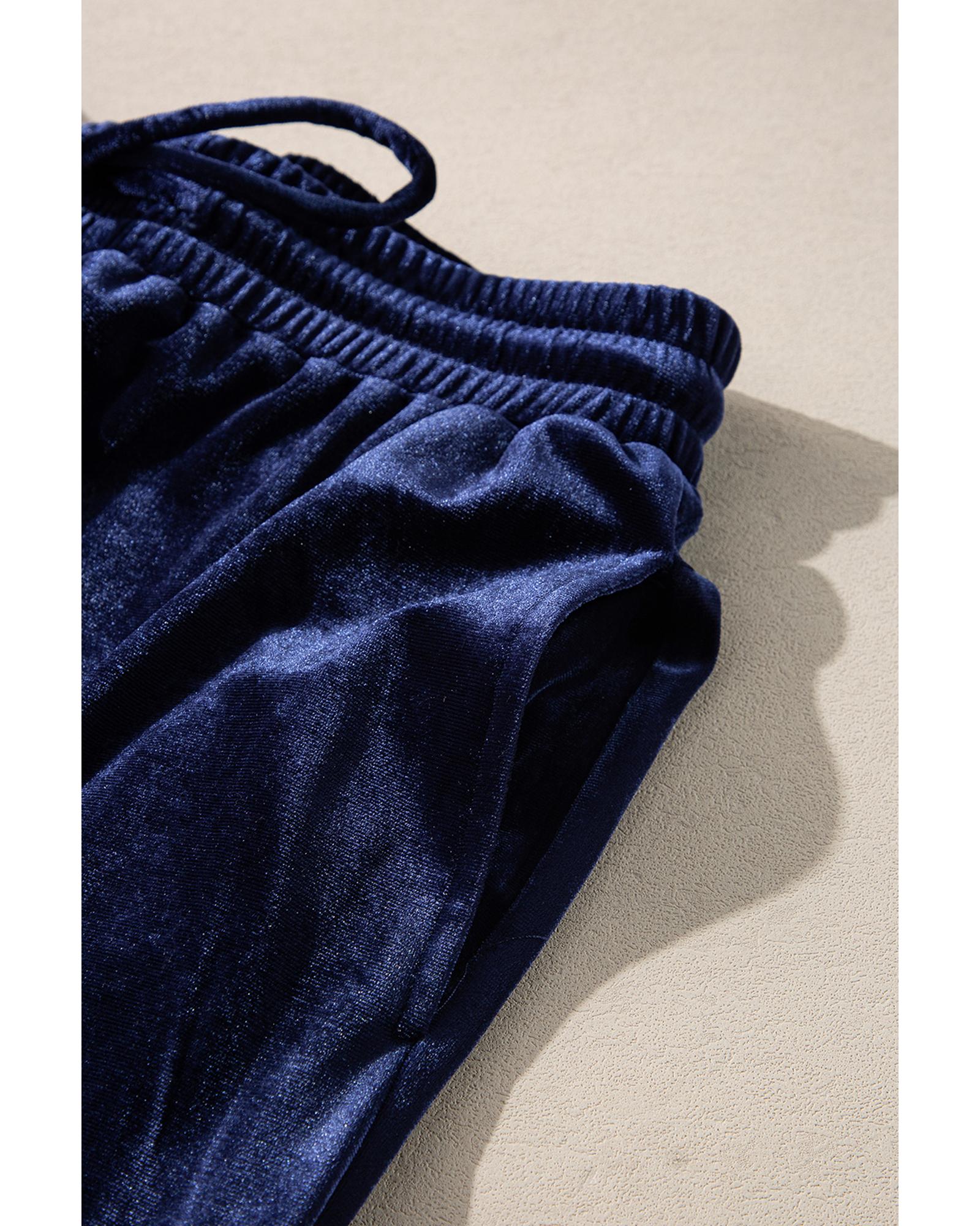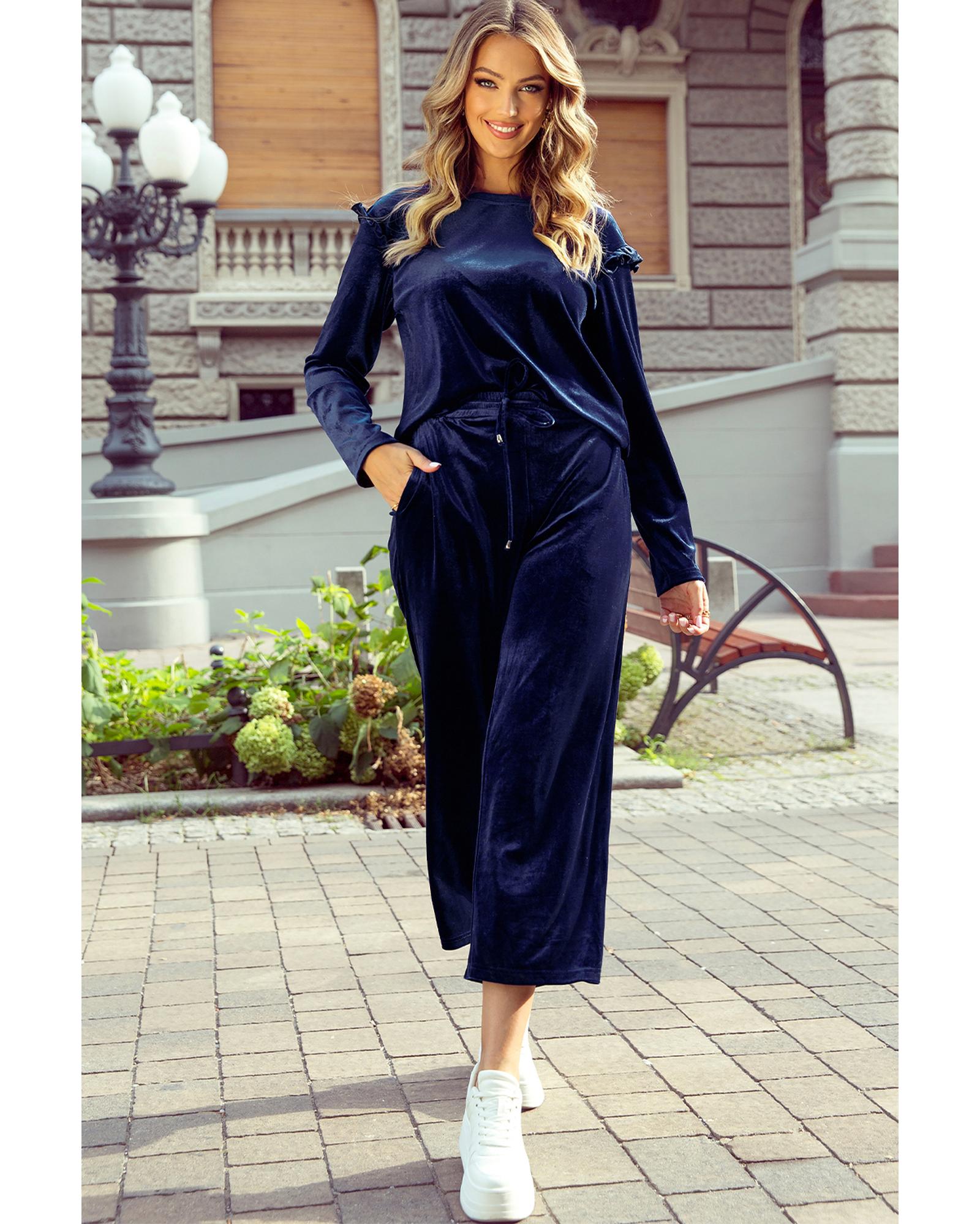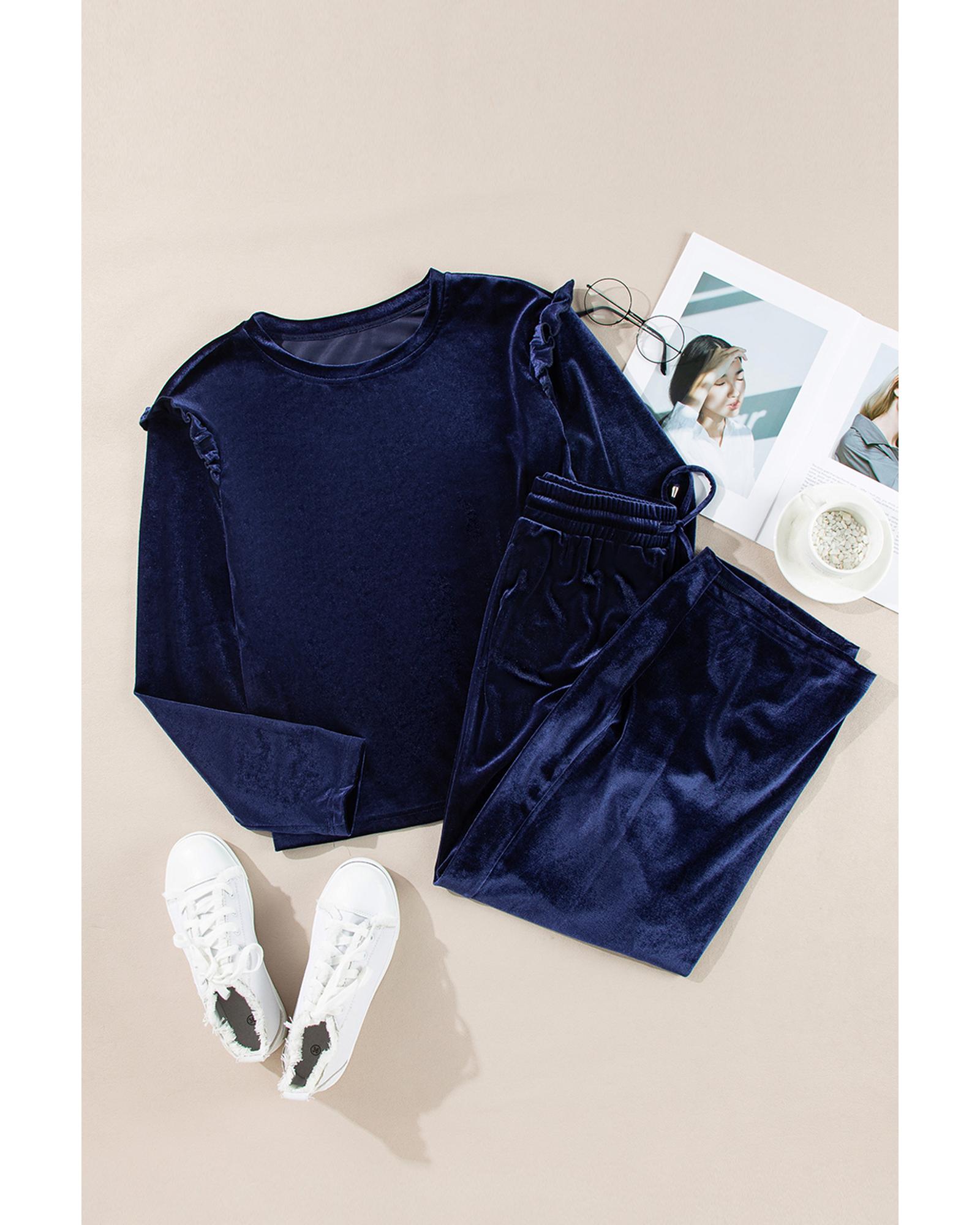 Navy Blue Solid Velvet Ruffled Two Piece Pants Set - S