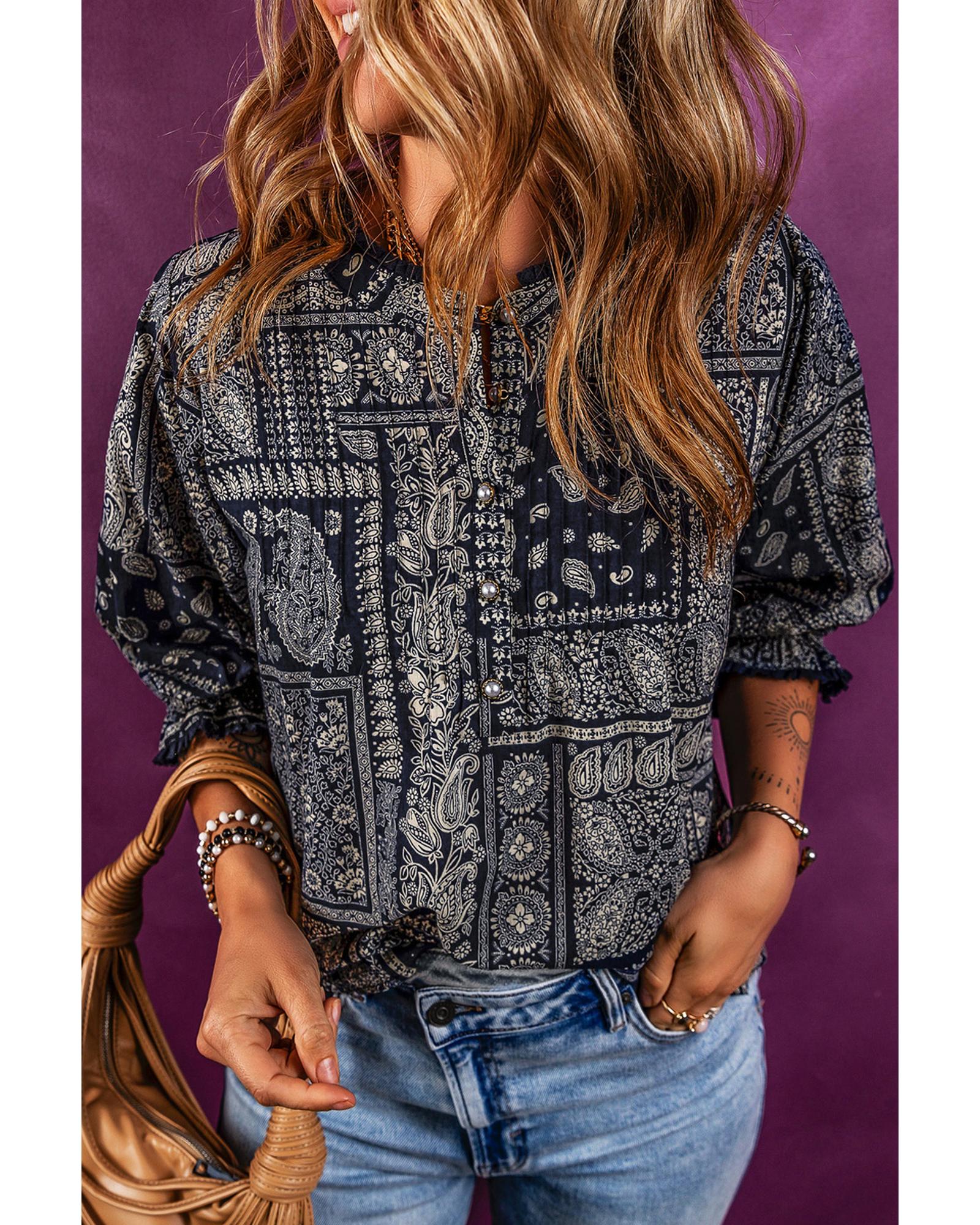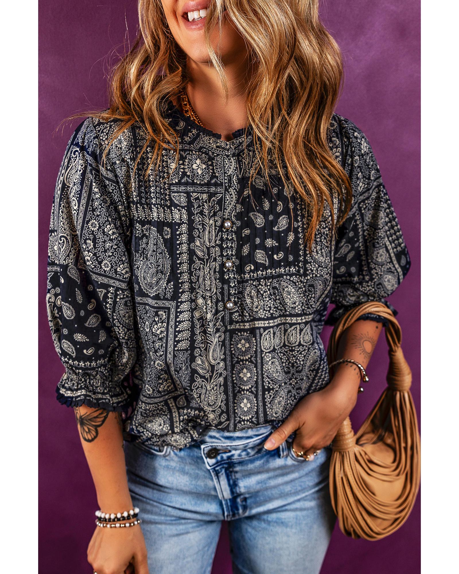 - Navy Blue Vintage Boho Paisley Print 3/4 Sleeve Blouse