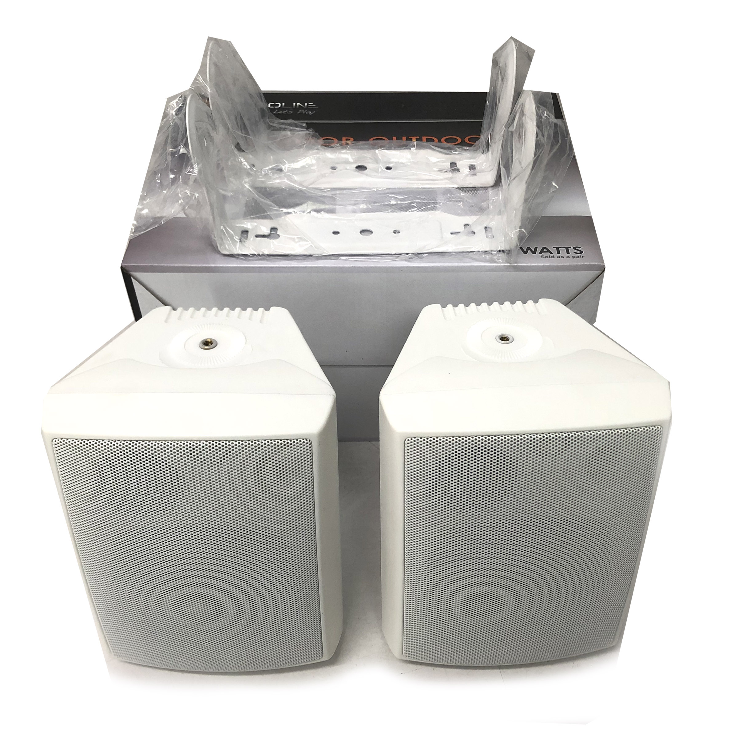 1 pair of speakers, 1 pair of mounting brackets.