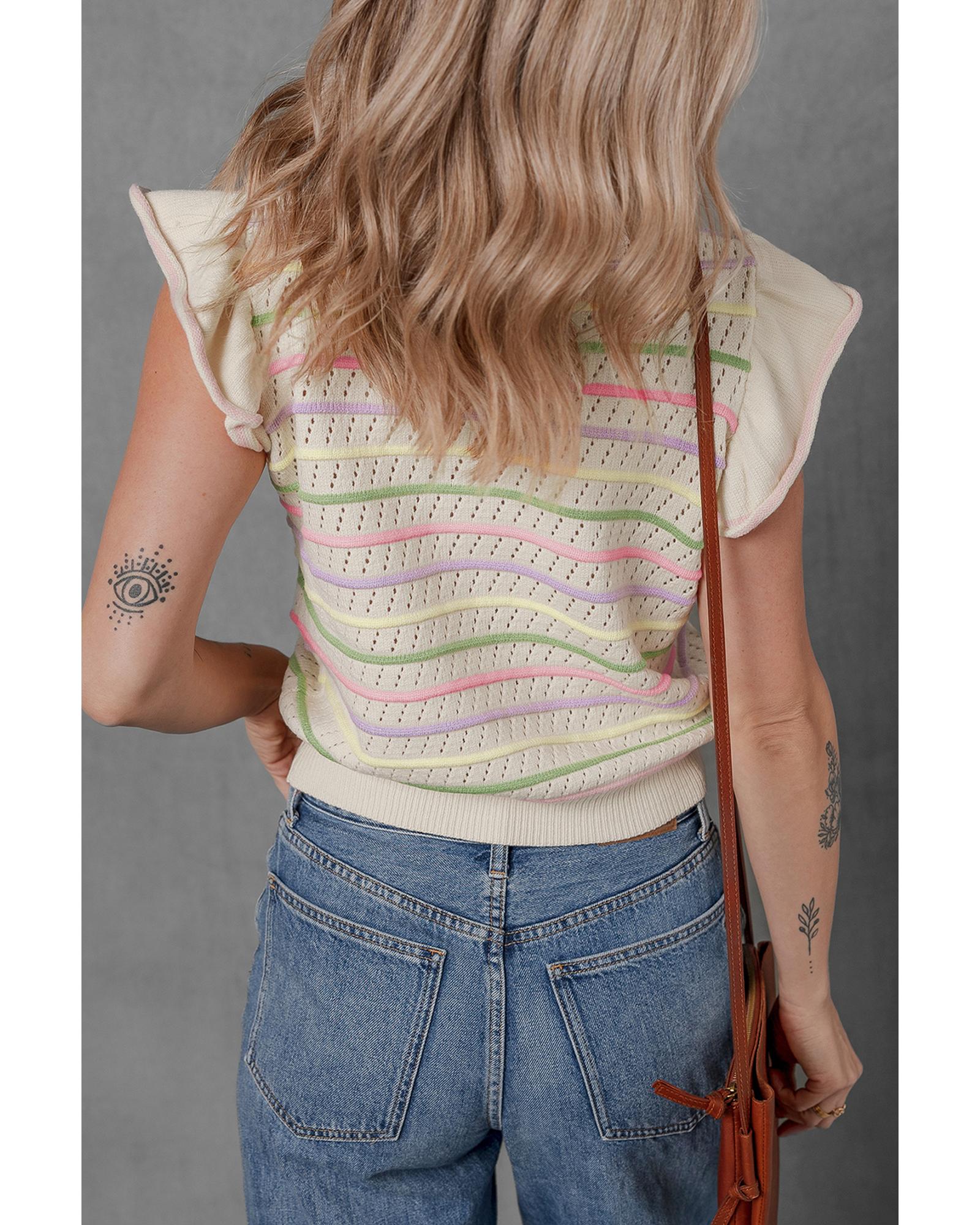 Oatmeal Colorful Striped Eyelet Knit Ruffled Sleeve Sweater T Shirt – M