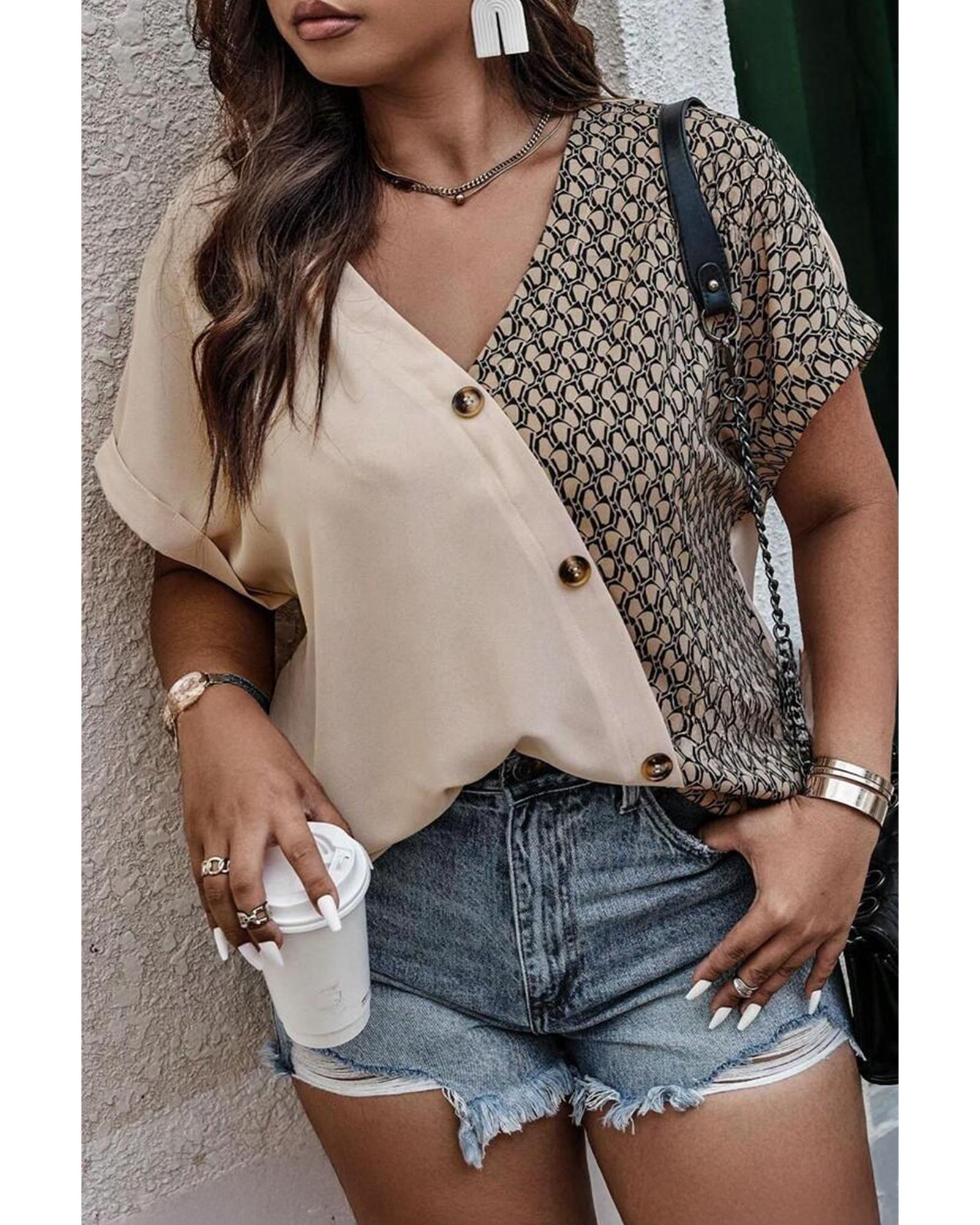Oatmeal Contrast Geometric Print Patchwork V Neck Short Sleeve Plus Size Top – 1X
