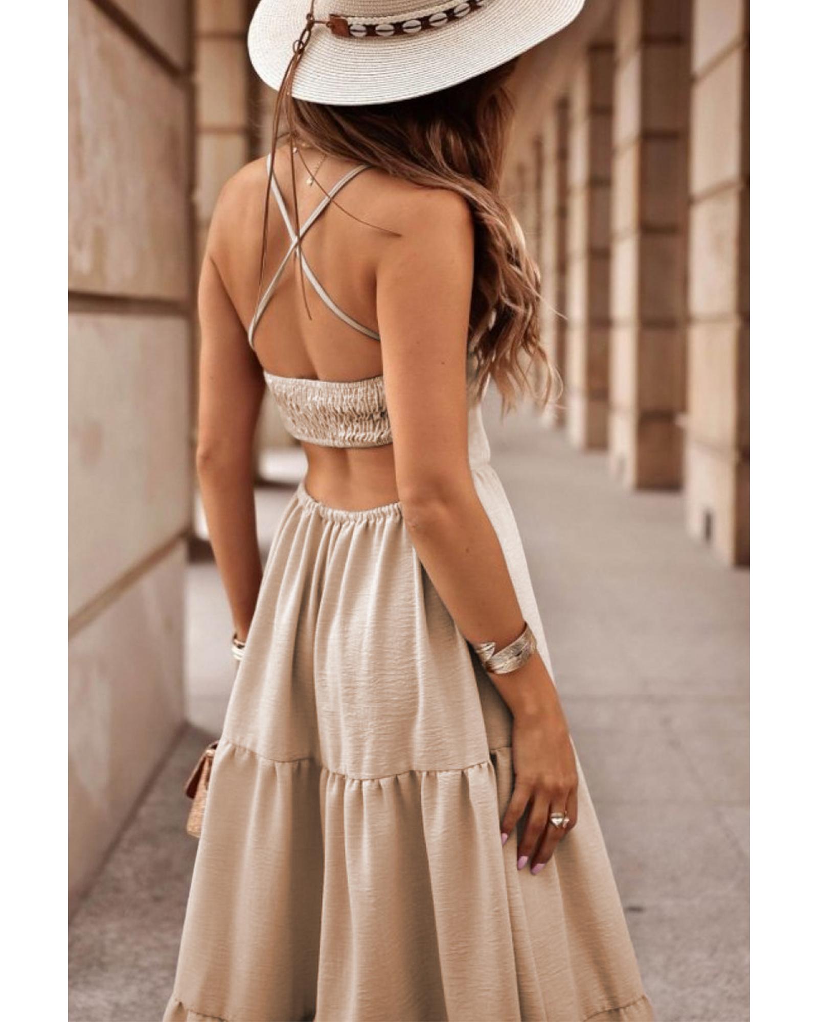 Oatmeal Crossover Backless Bodice Tiered Maxi Dress – S