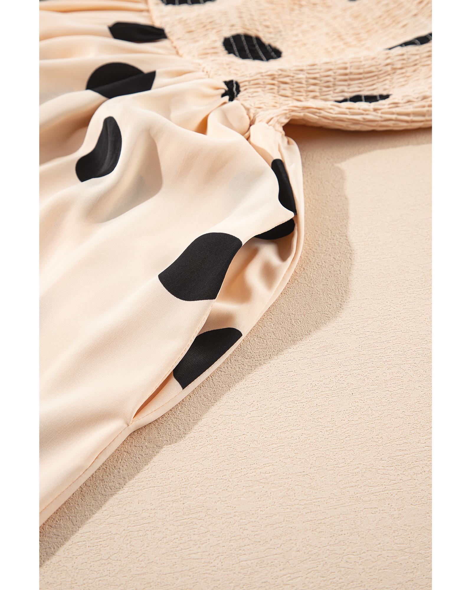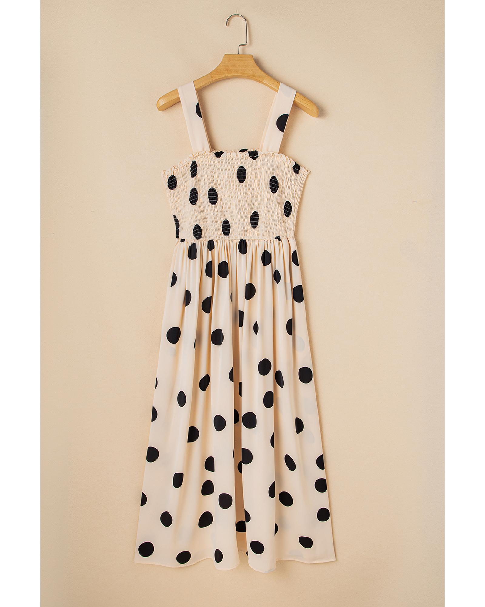 Oatmeal Polka Dot Smocked Fit Flared Sleeveless Long Dress – L