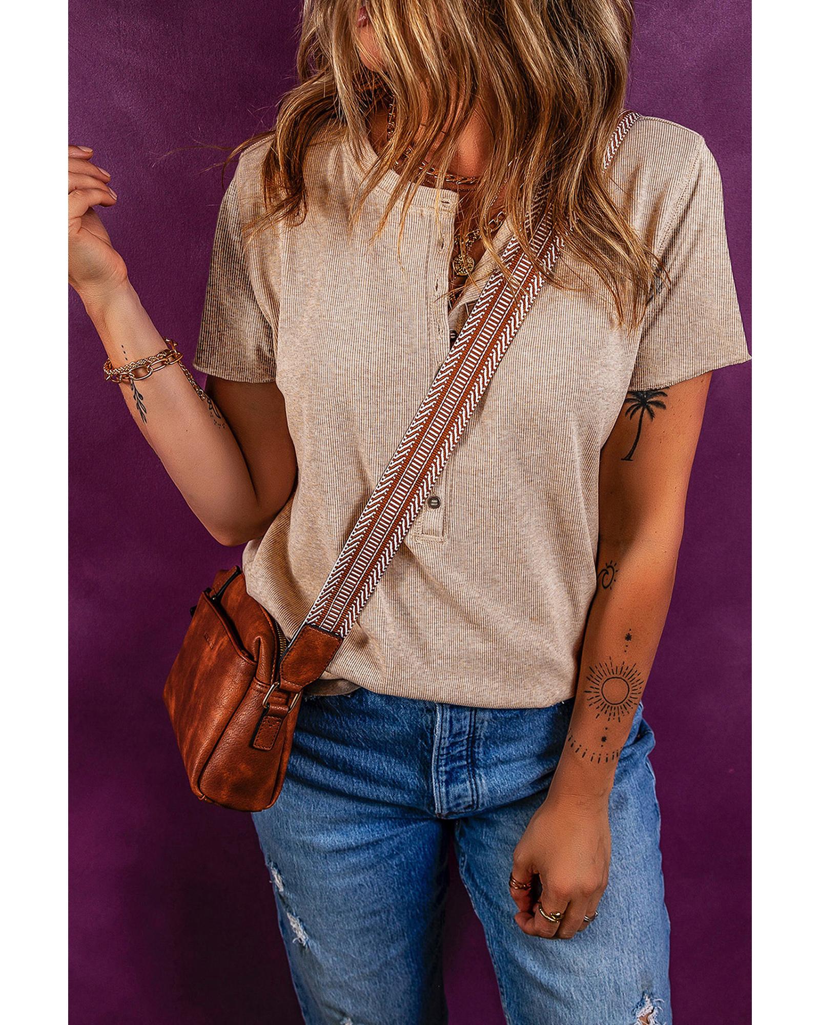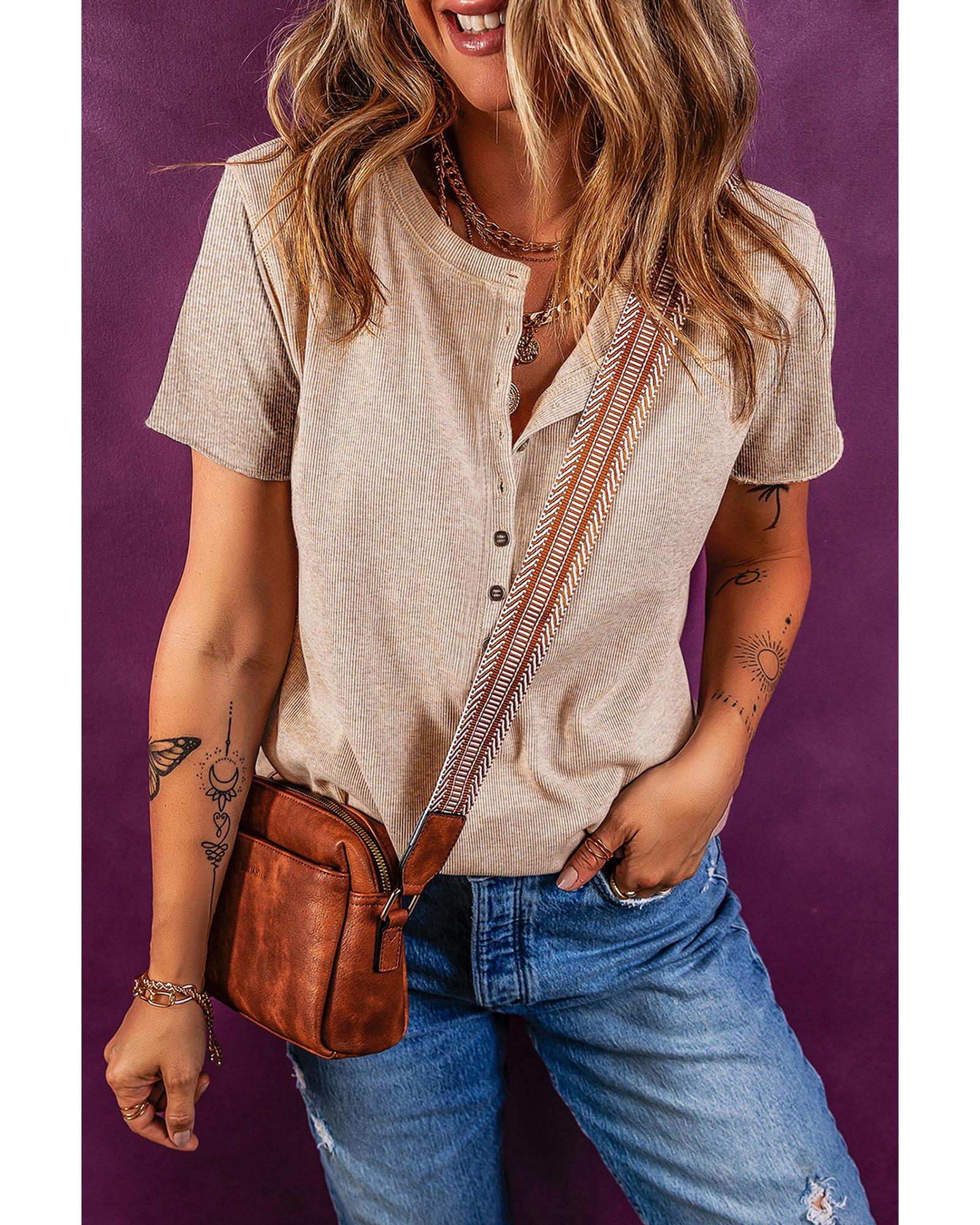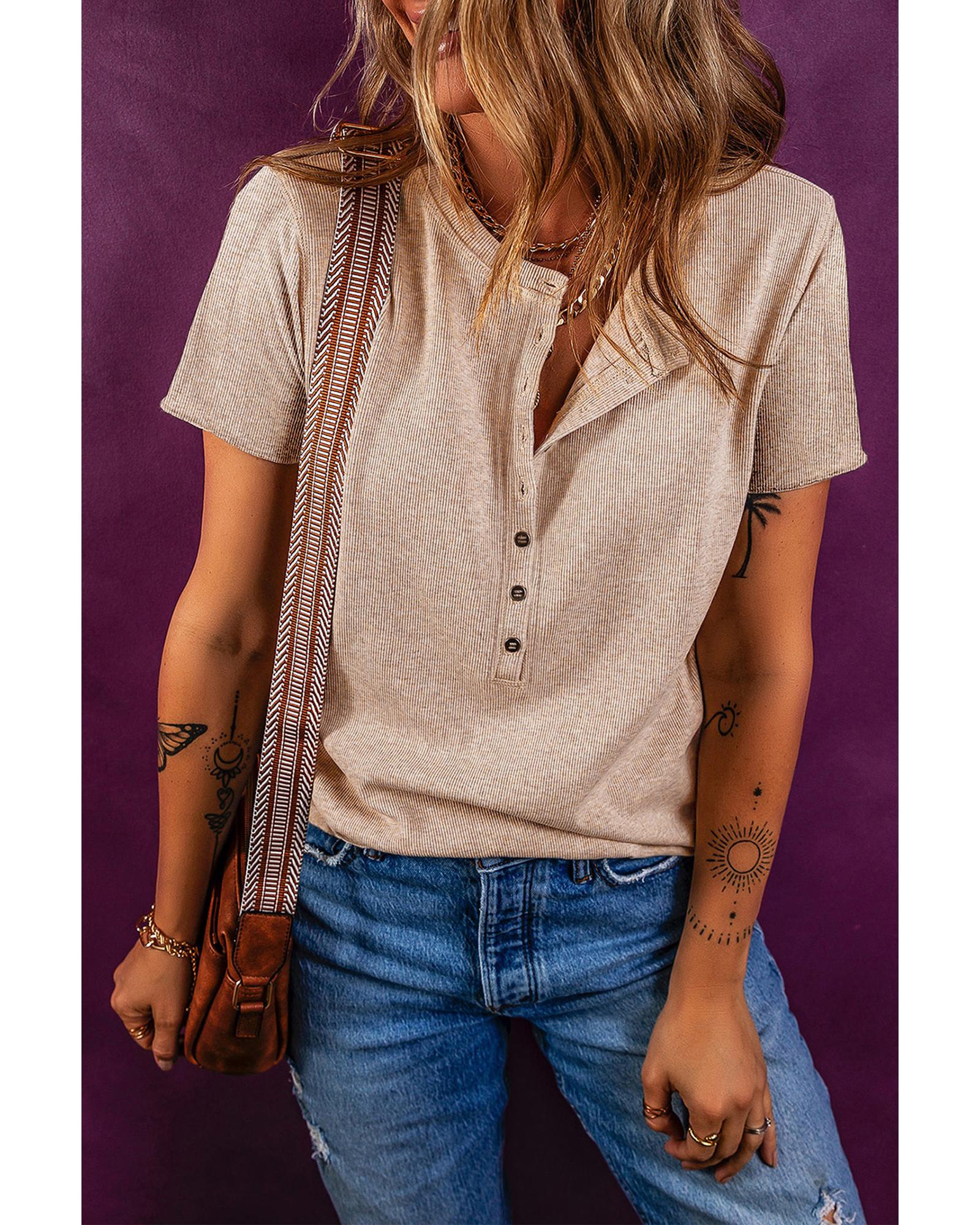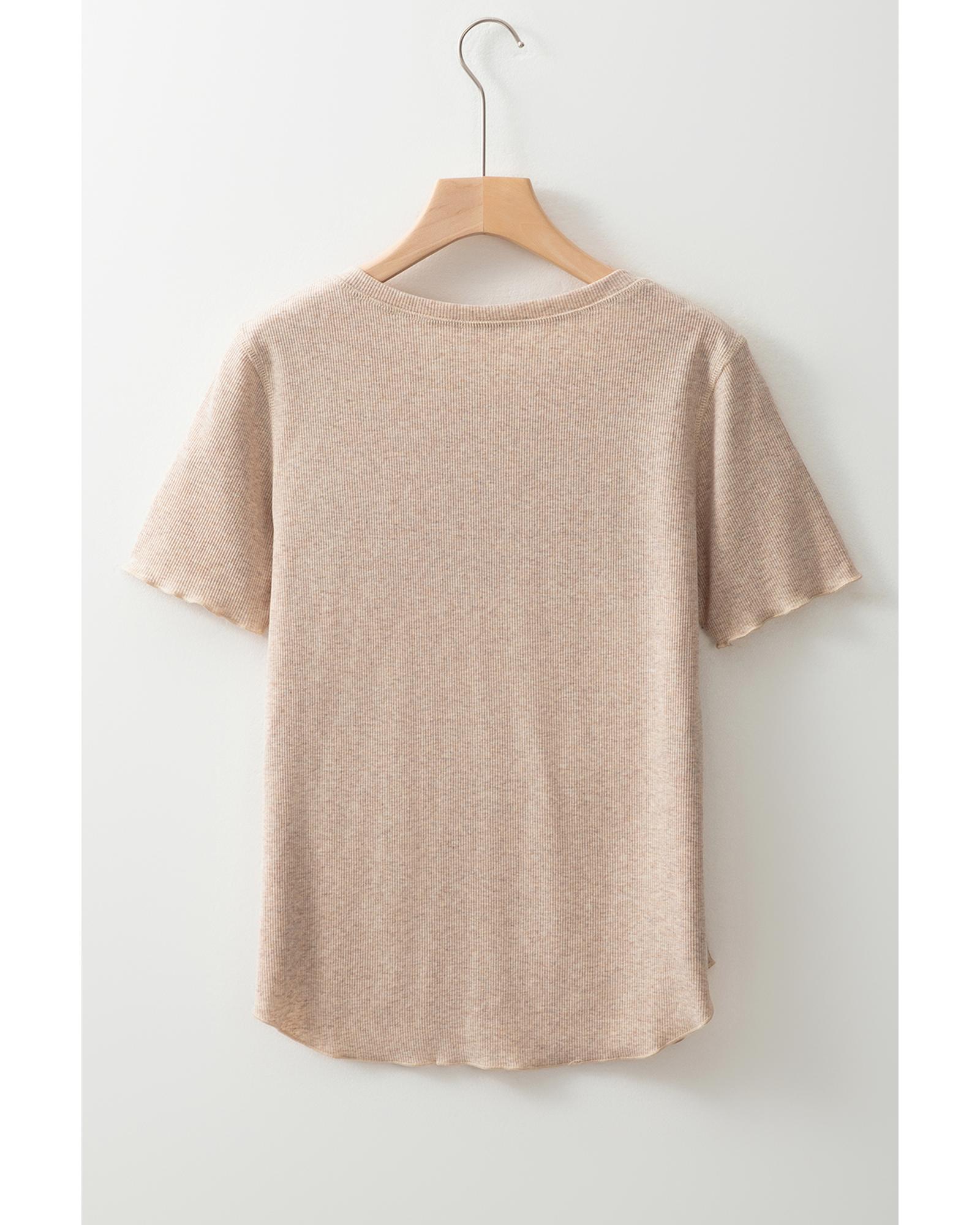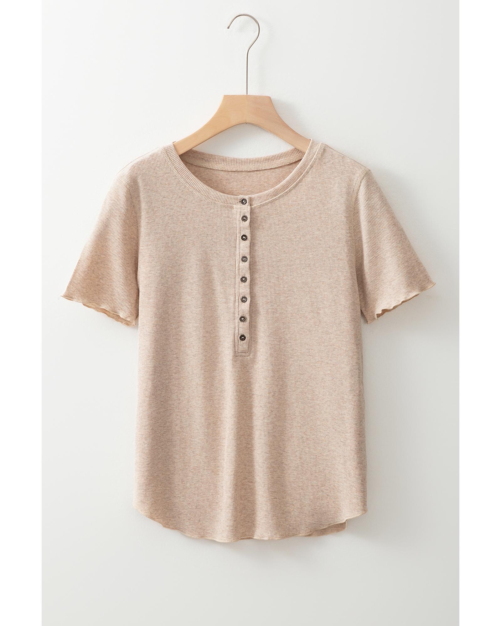 Oatmeal Short Sleeve Half Button Ribbed Knit Top – L