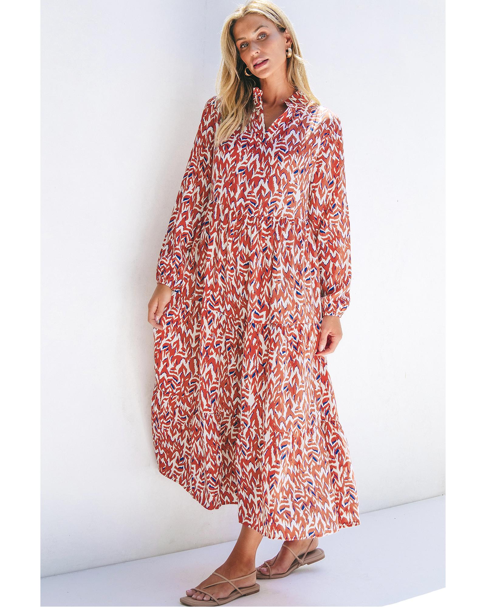 Orange Abstract Print V Neck Pleated High Waist Midi Dress – M
