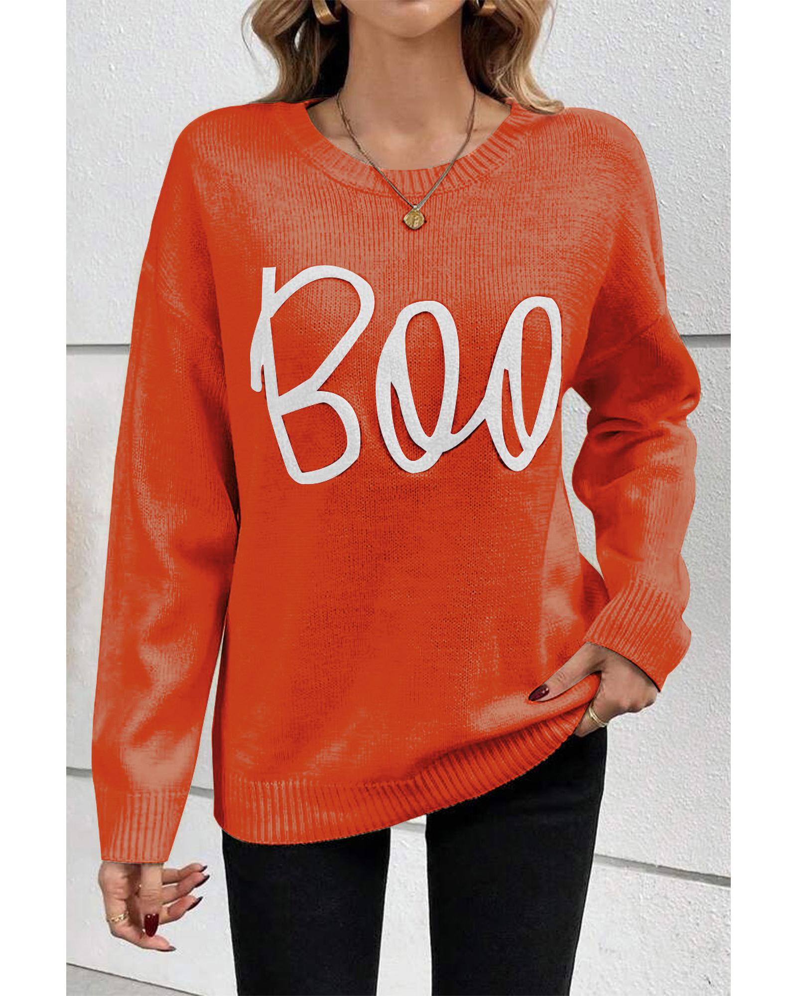 Orange Boo Knitted Pattern Ribbed Edge Drop Shoulder Sweater – L