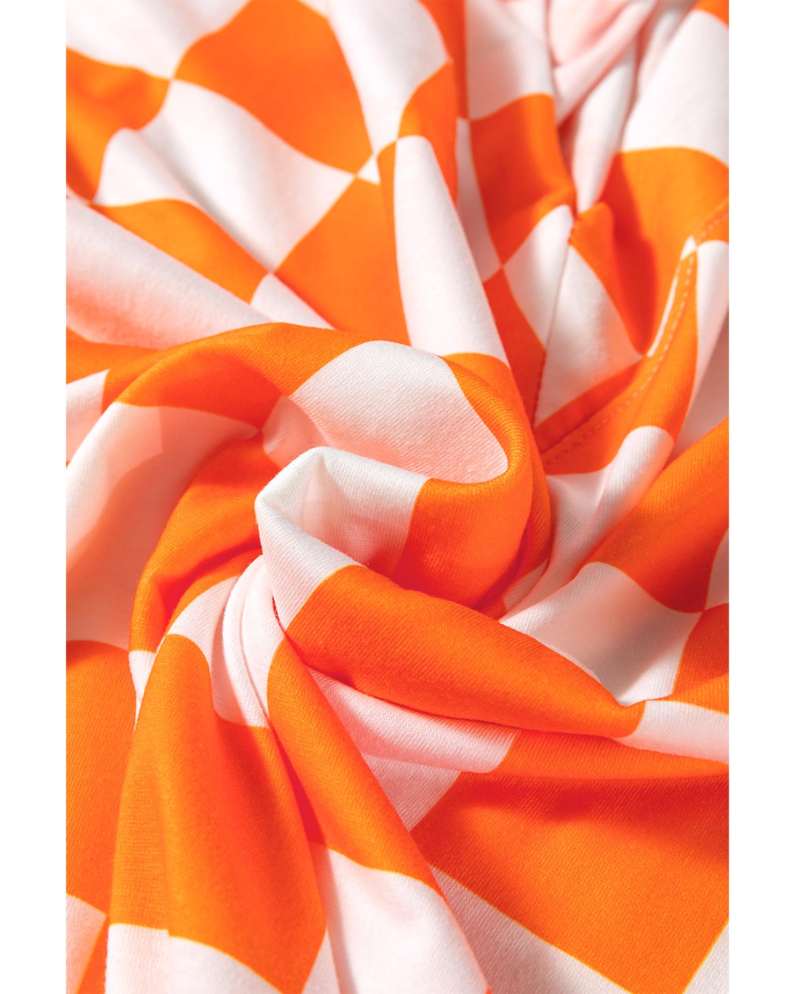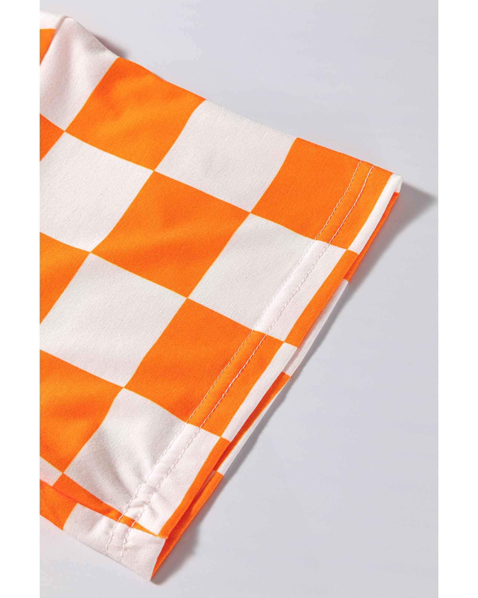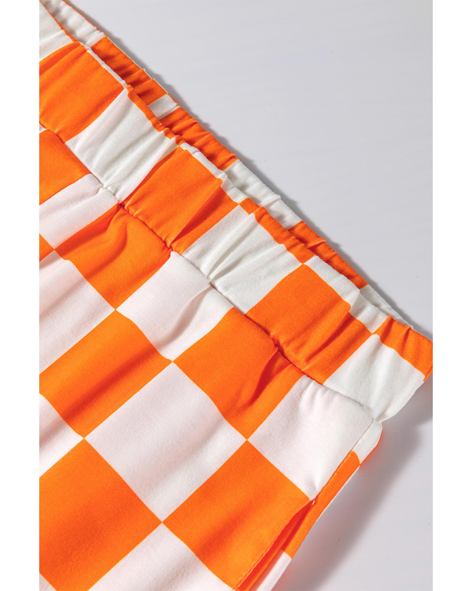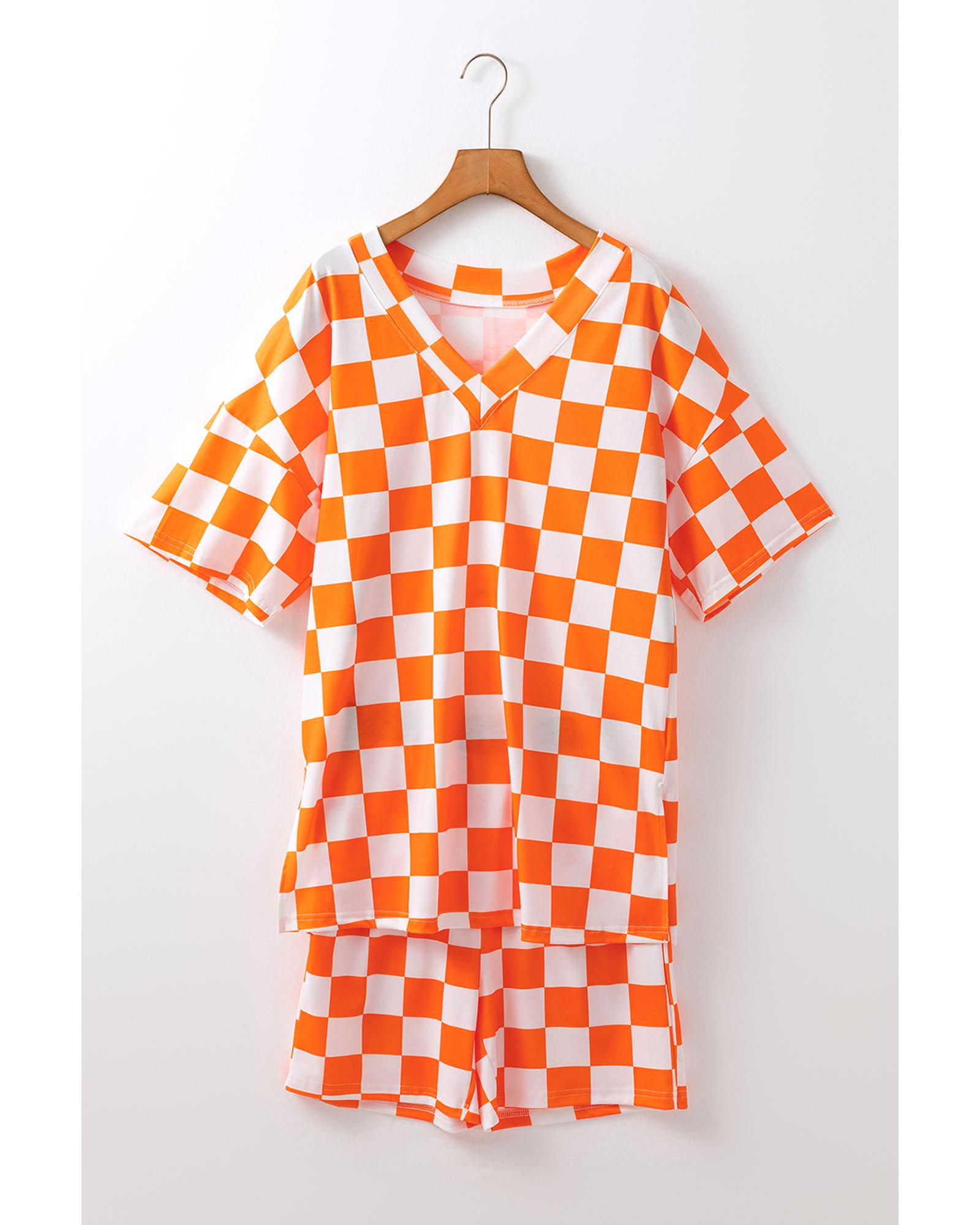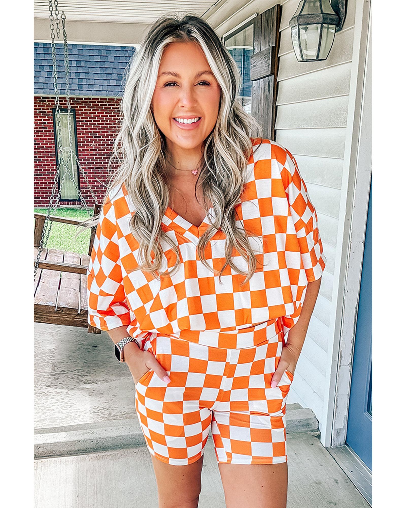 Orange Checkerboard Print V Neck Loose Tee and Shorts Lounge Set – M