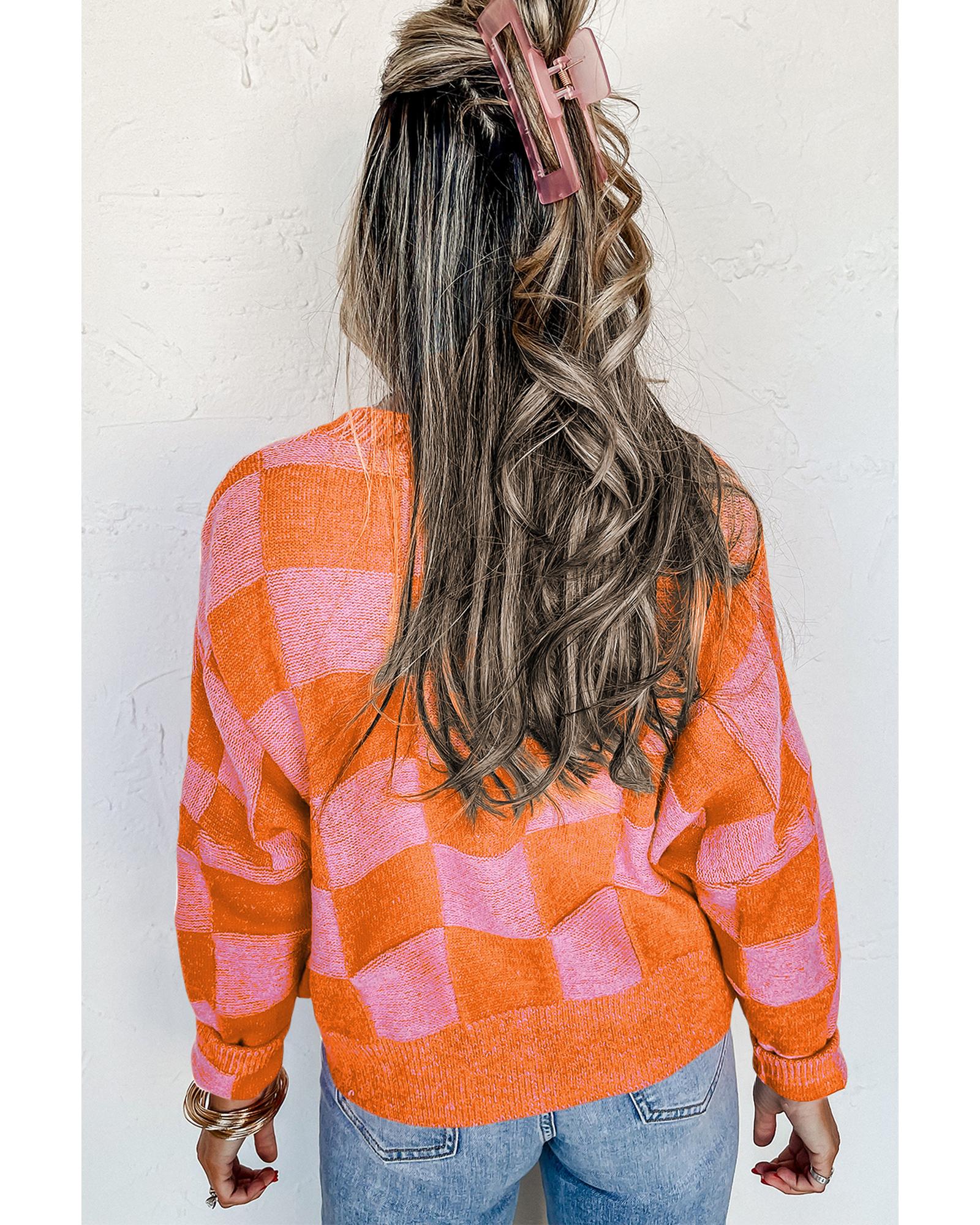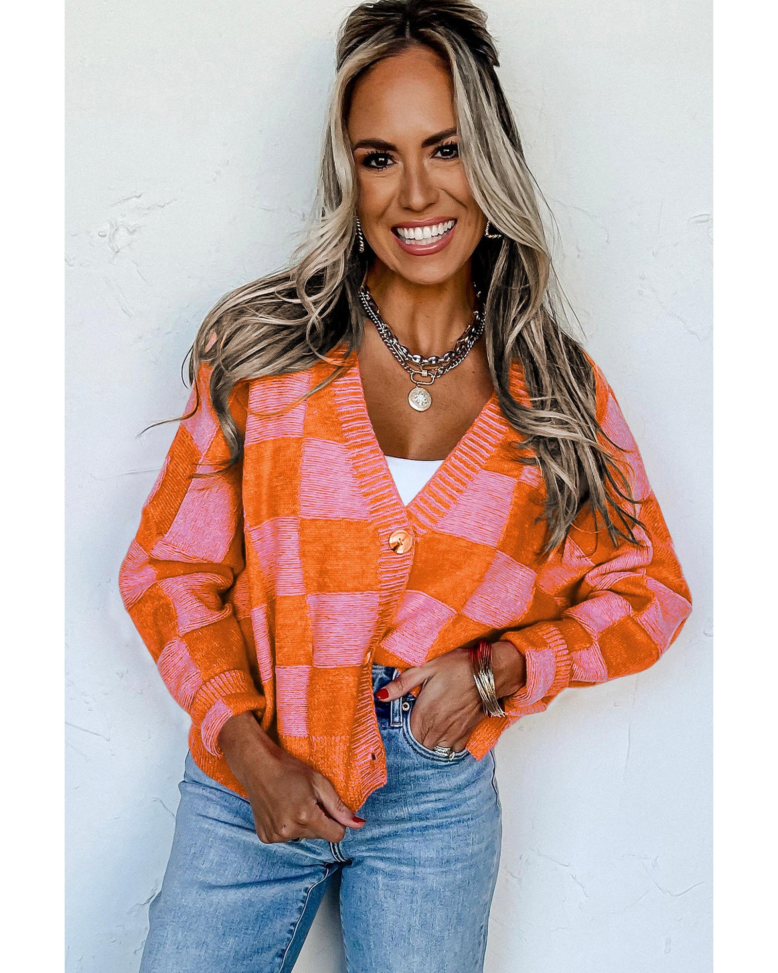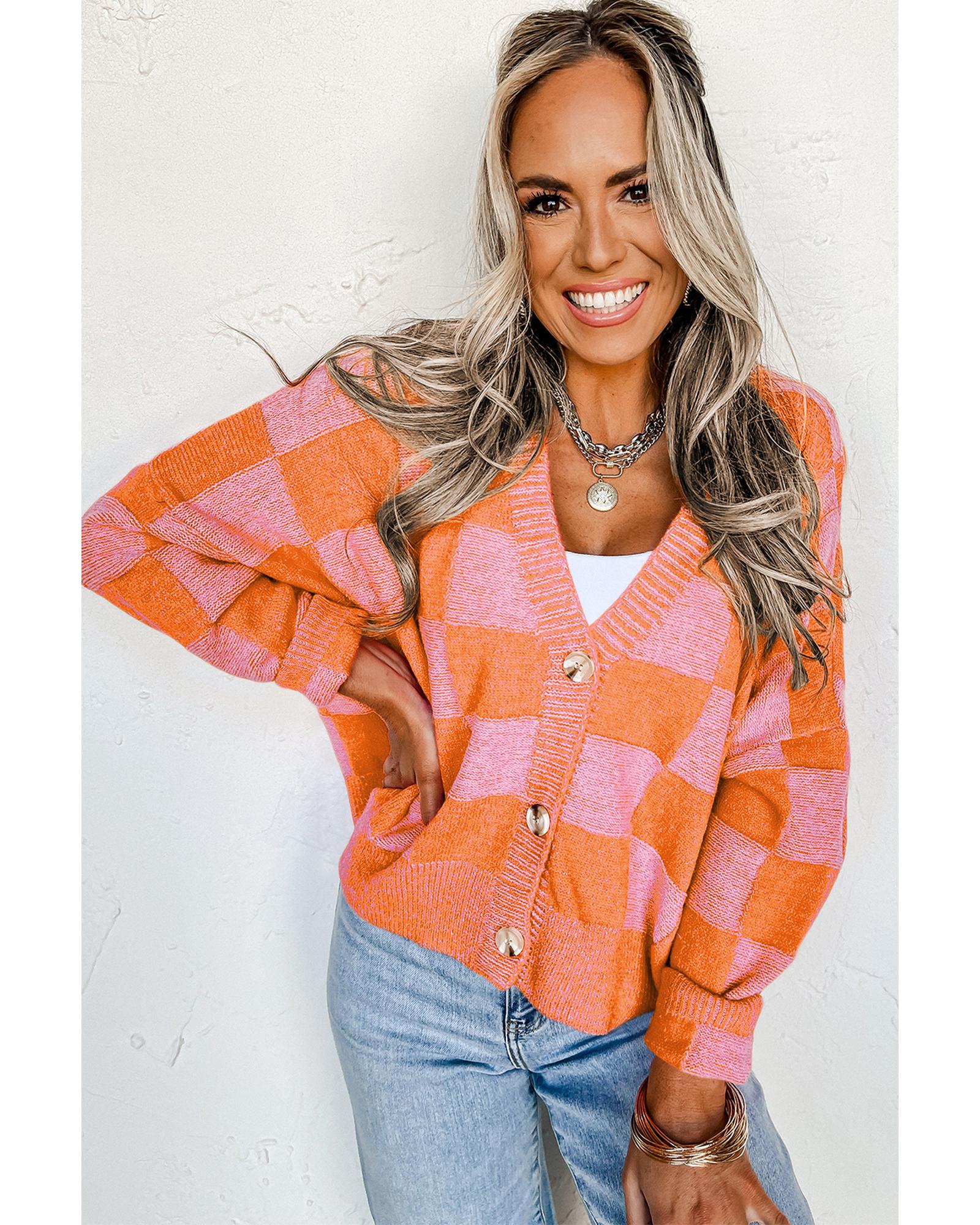 Orange Checkered Drop Shoulder Buttoned V Neck Cardigan – XL