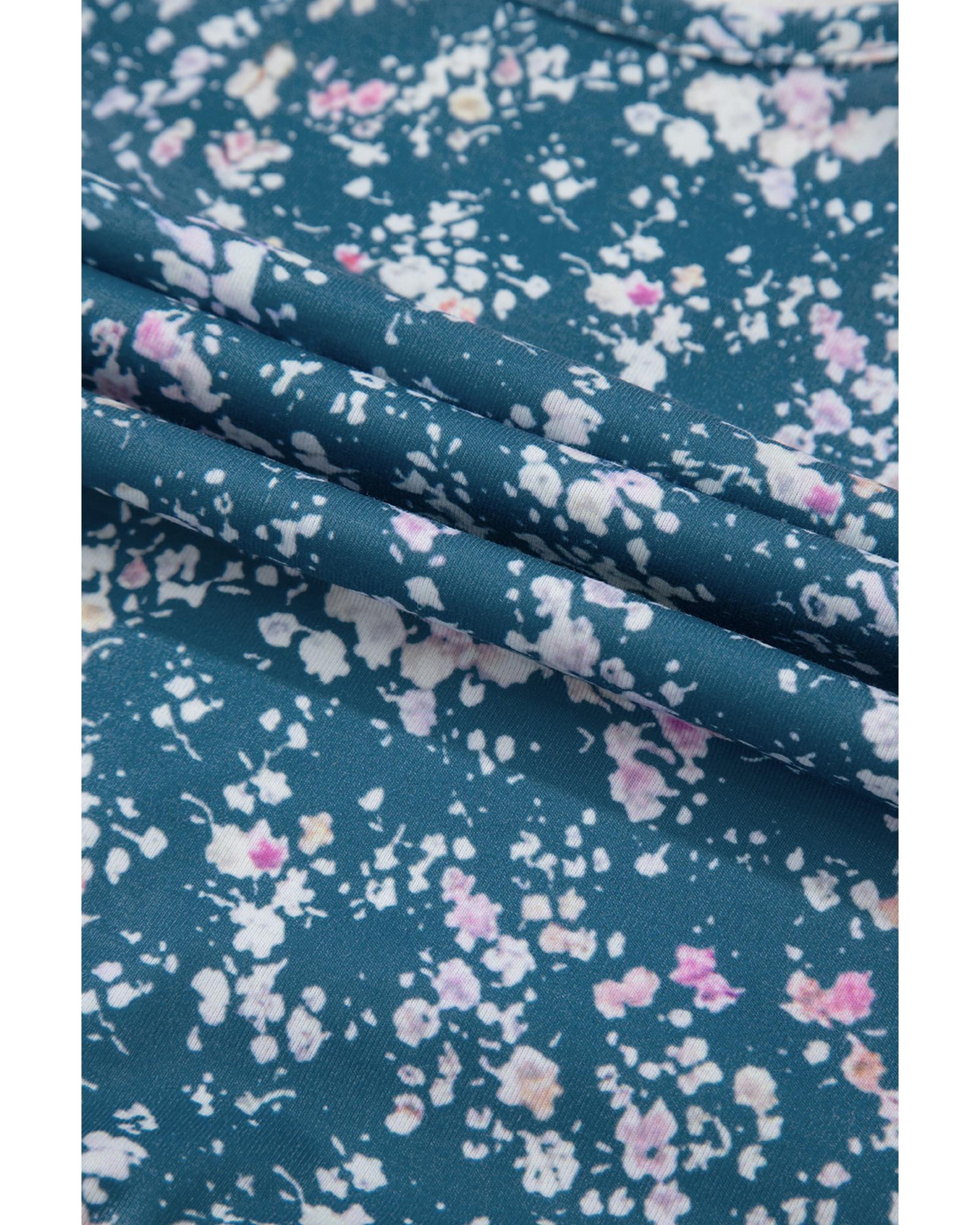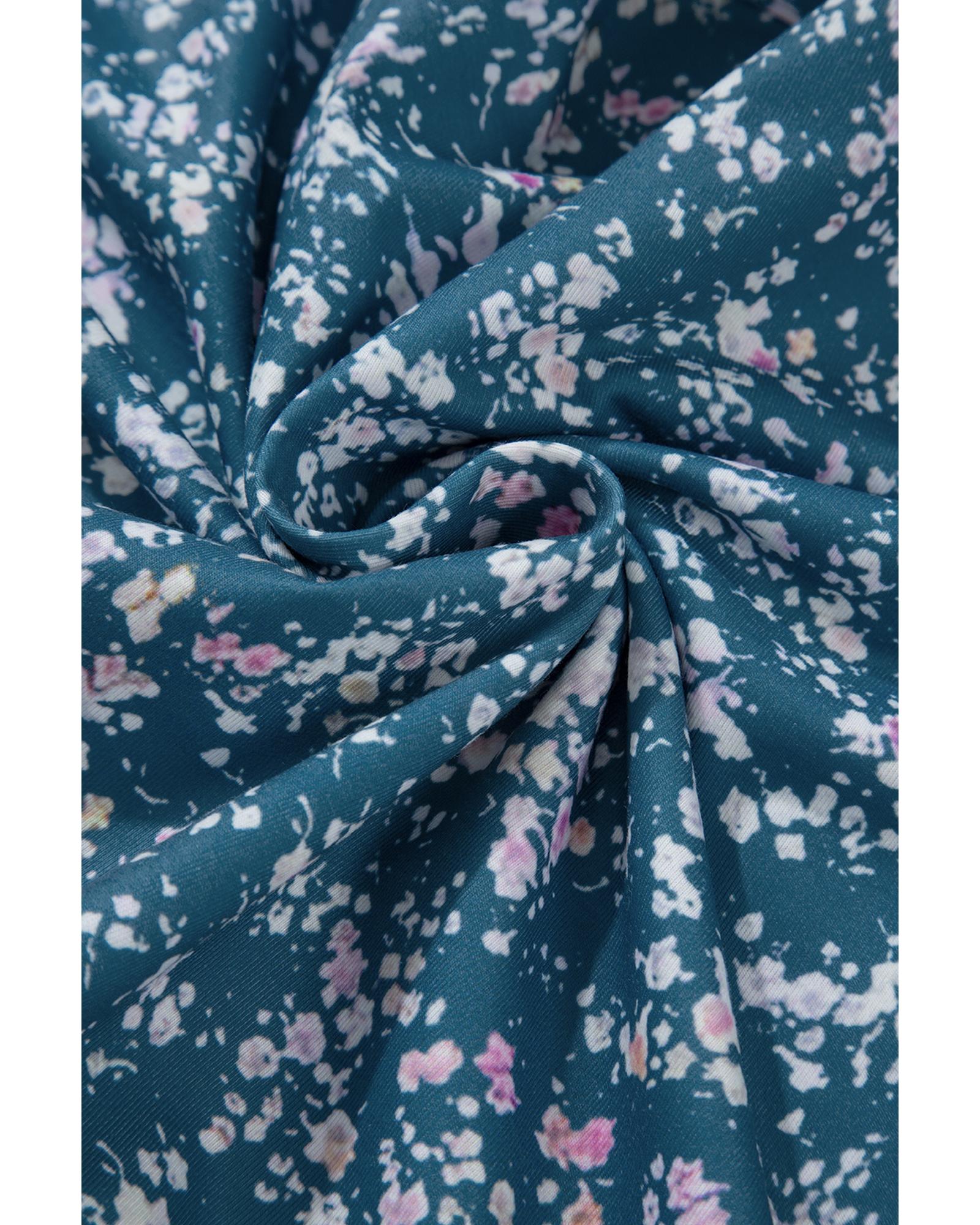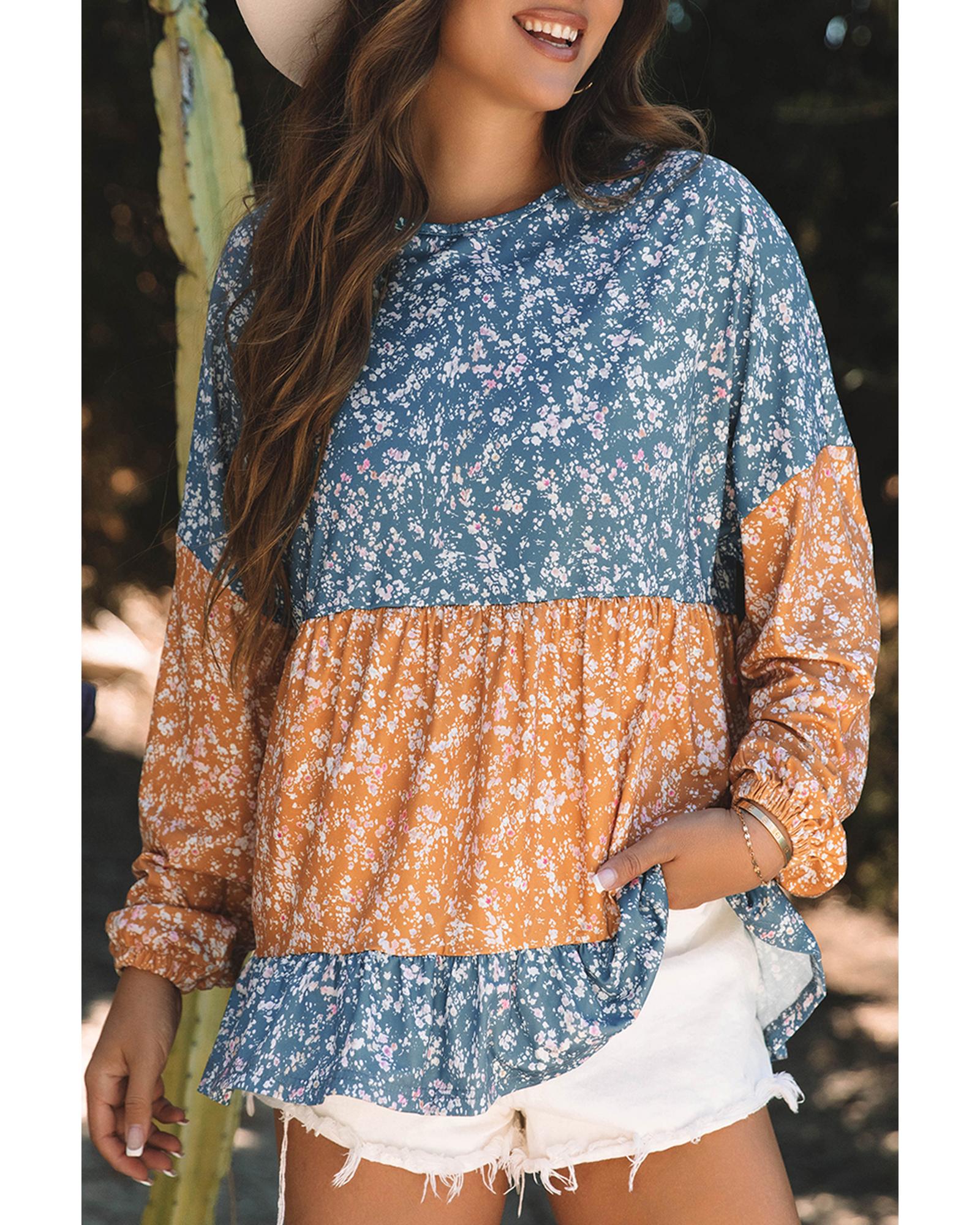 Orange Floral Color Block Patchwork Ruffled Hem Round Neck Blouse – M