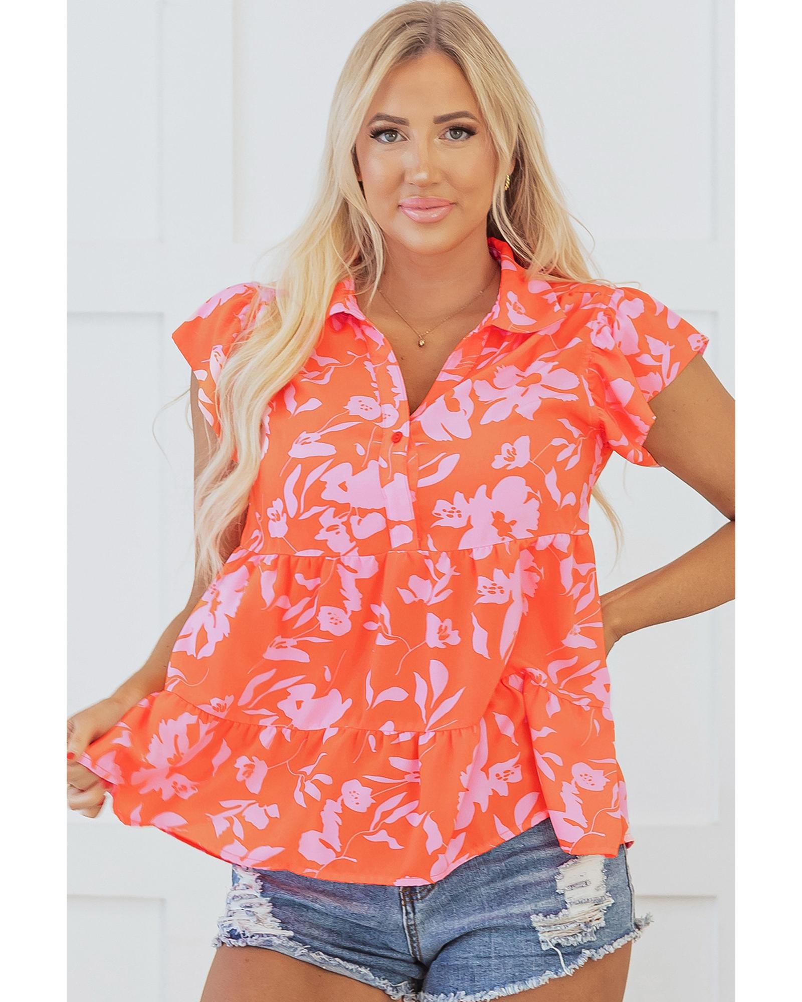 Orange Floral Print Collared Button Neckline Flutter Sleeve Blouse – L