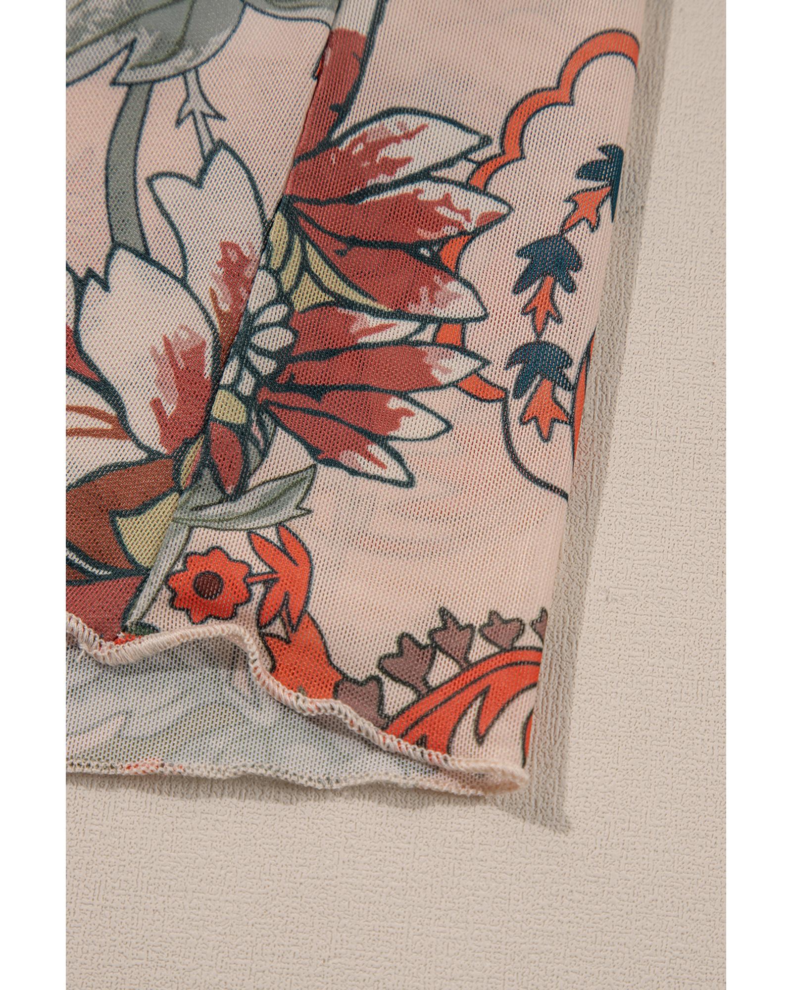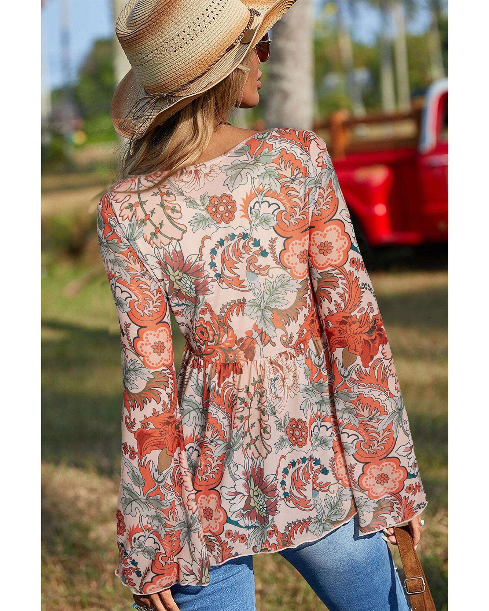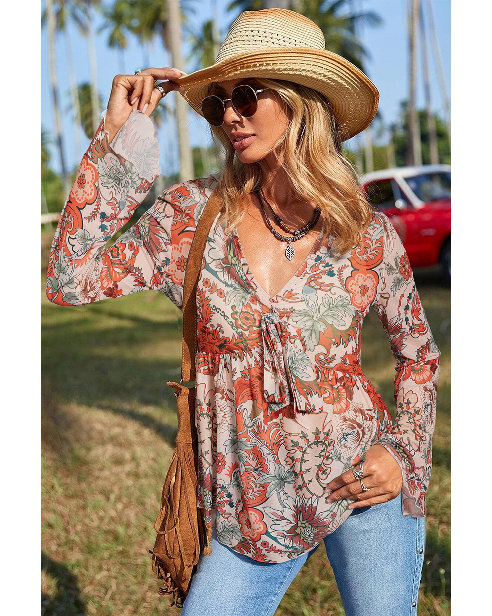 Orange Floral Print Deep V Neck Knot Bell Sleeve Blouse – M