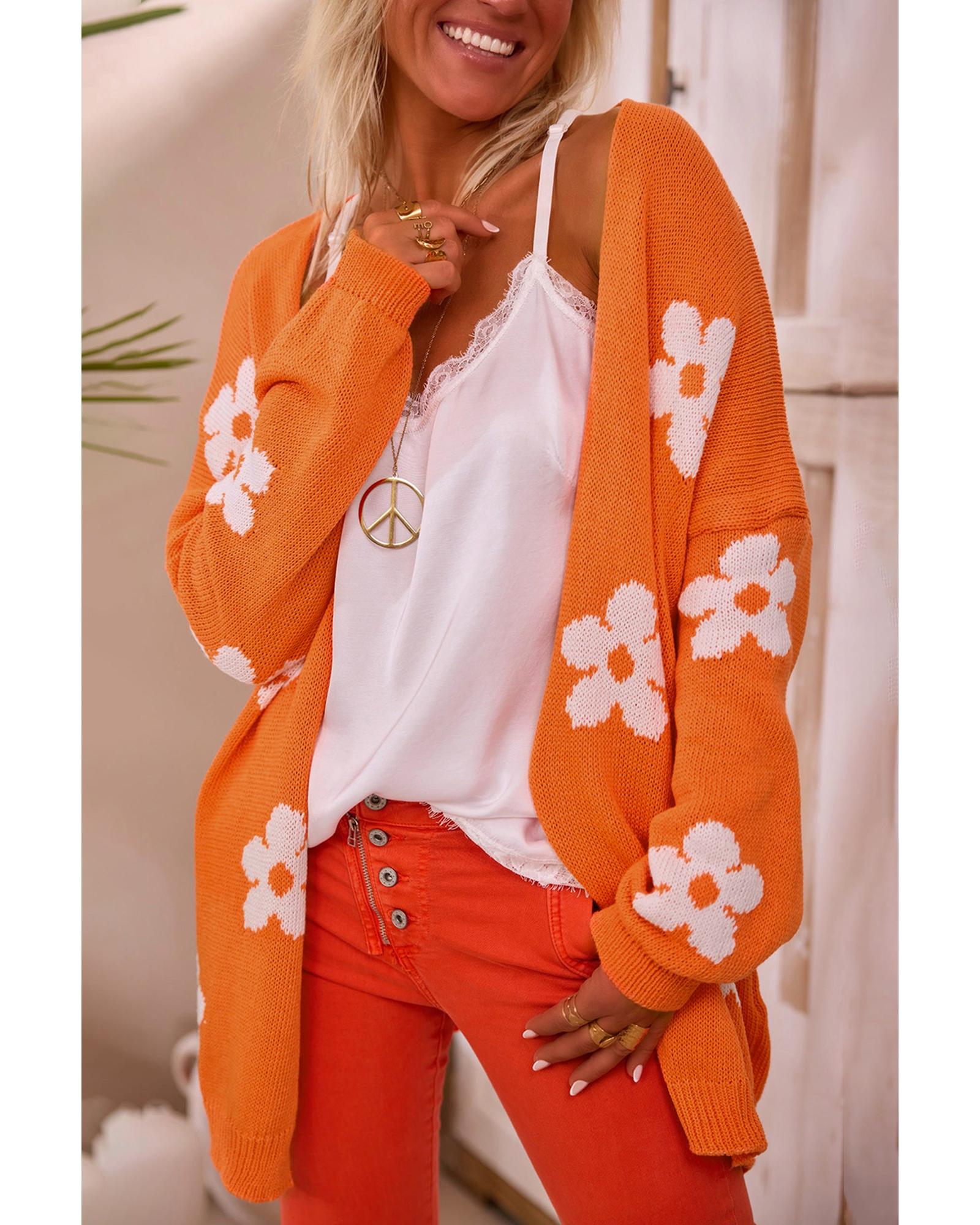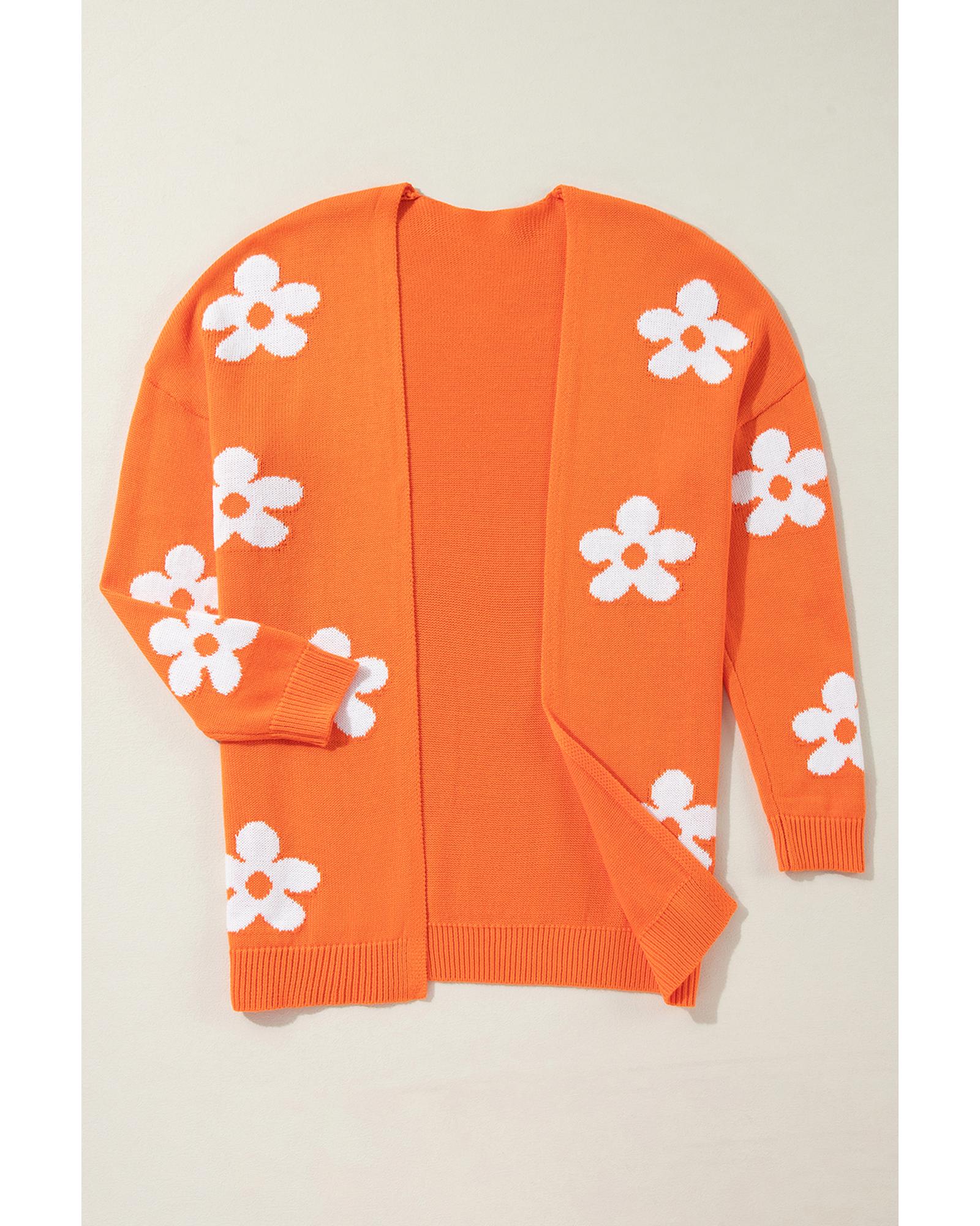 Orange Floral Print Knitted Open Front Loose Cardigan – L