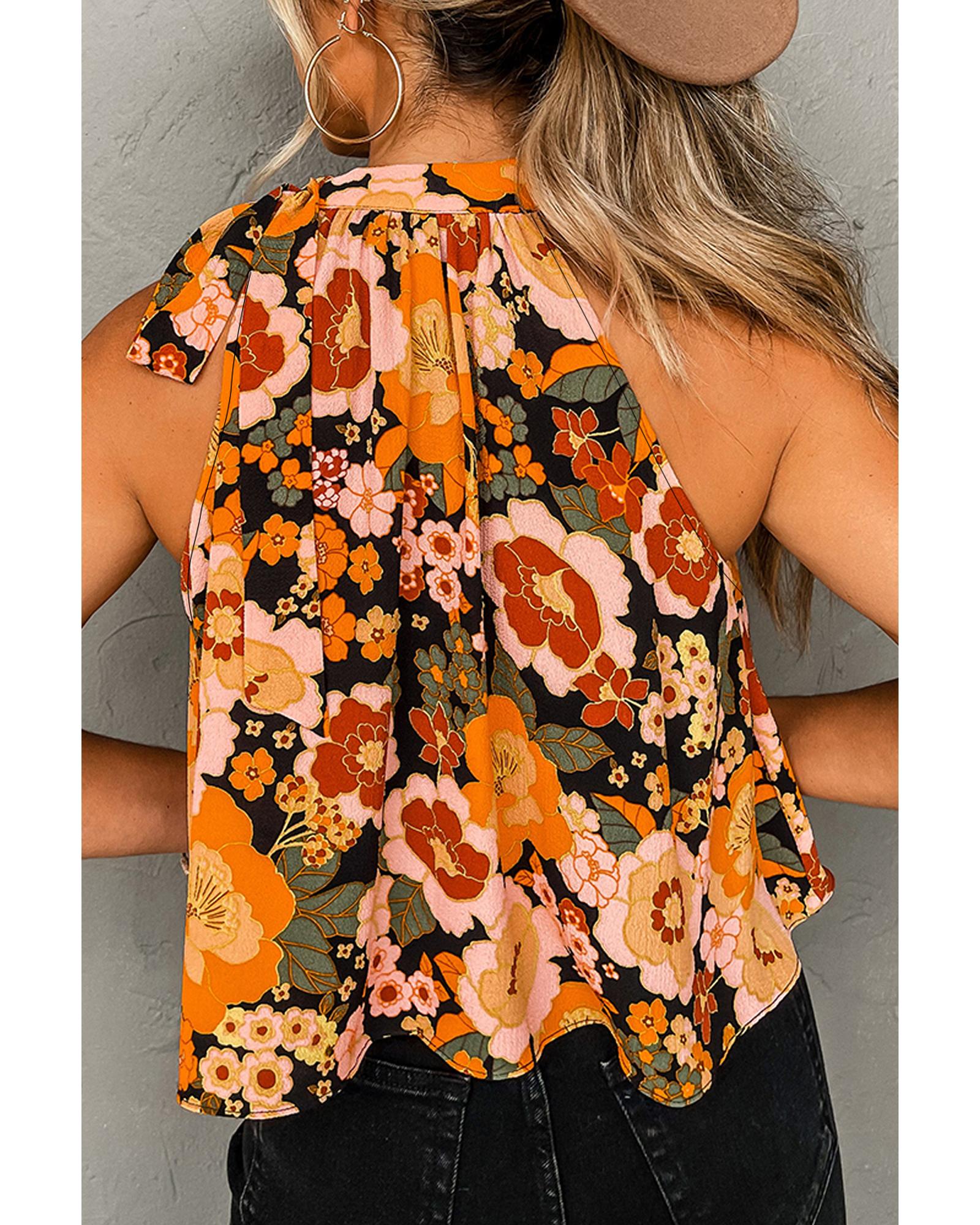 • Orange Floral Print Knotted Halter Neck Sleeveless Top