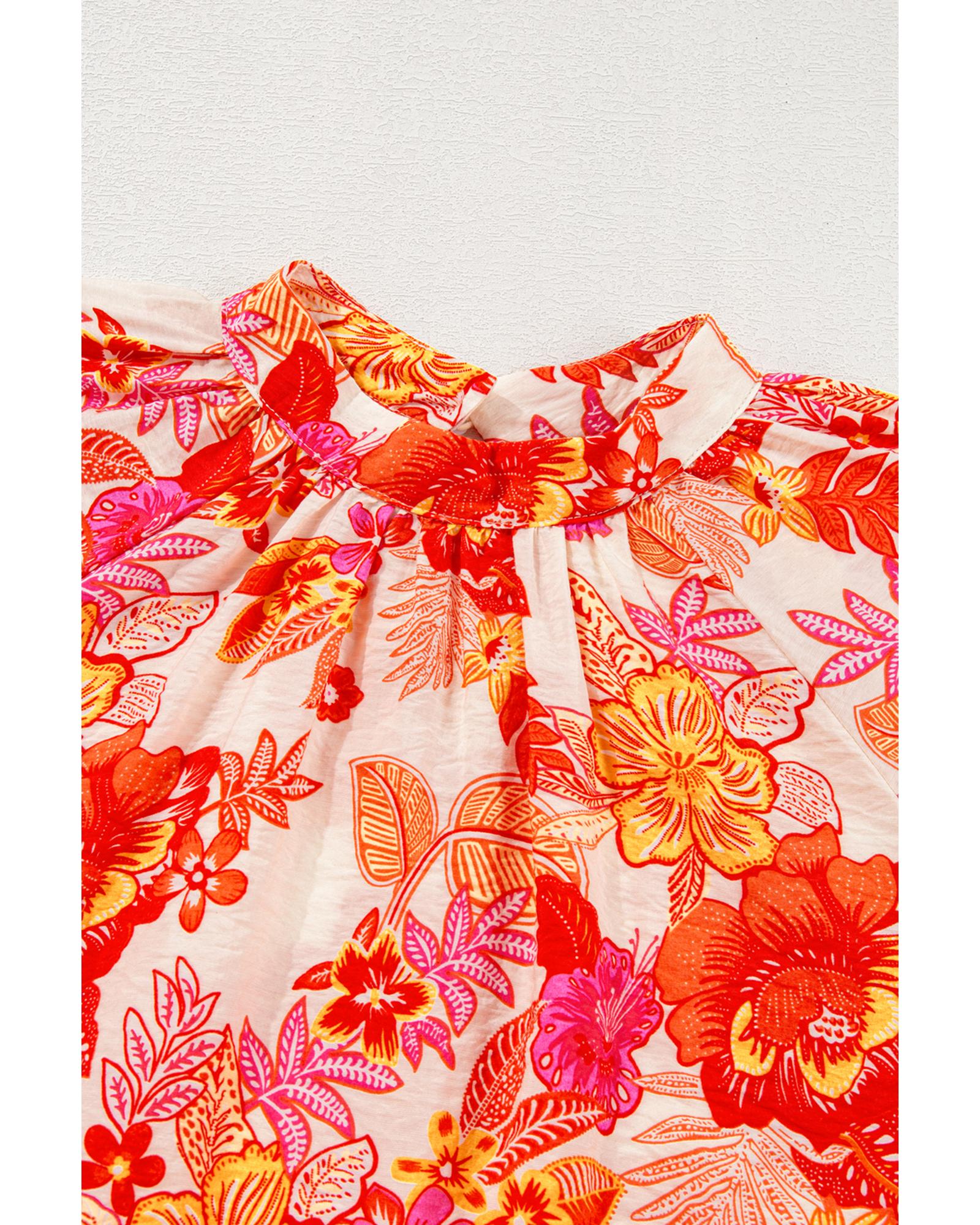 Orange Floral Print Pearl Button Keyhole Long Puff Sleeve Blouse – XL