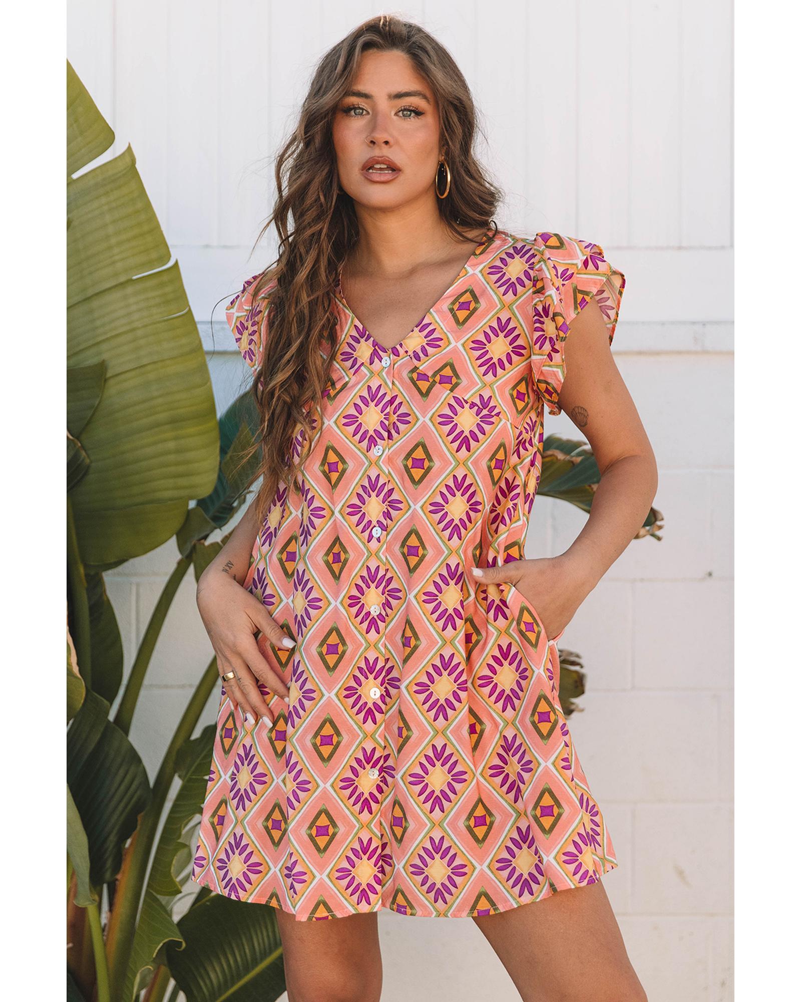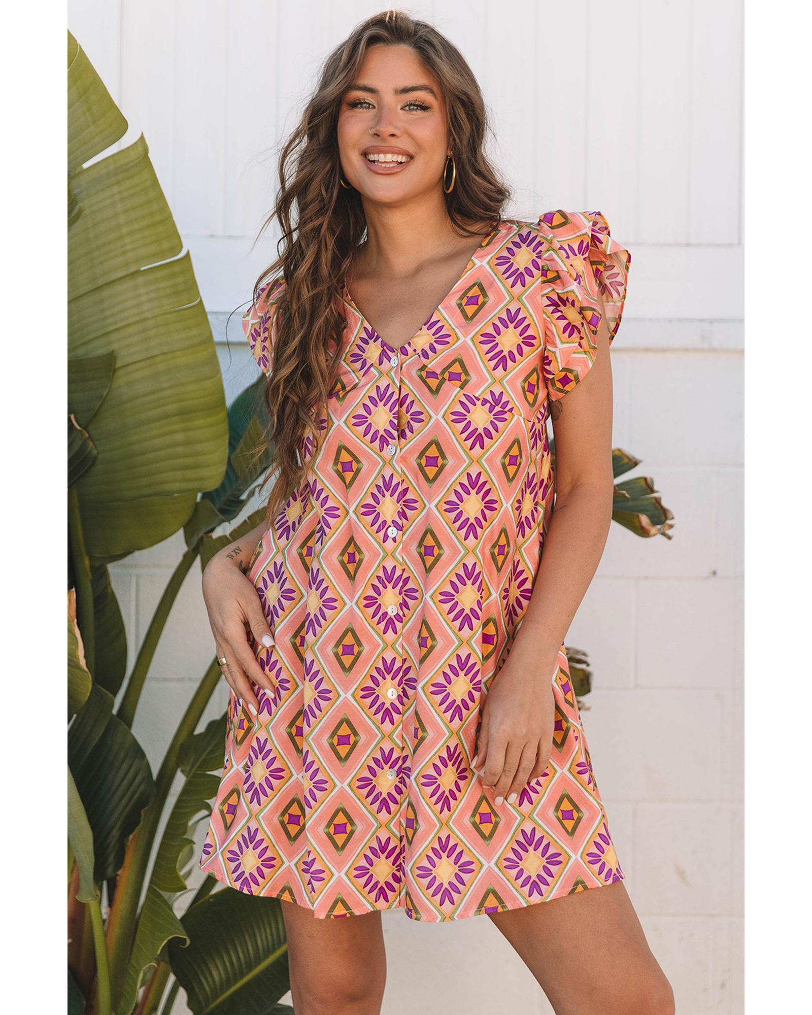 Orange Geometric Floral V Neck Buttoned Ruffled Sleeve Mini Dress - M
