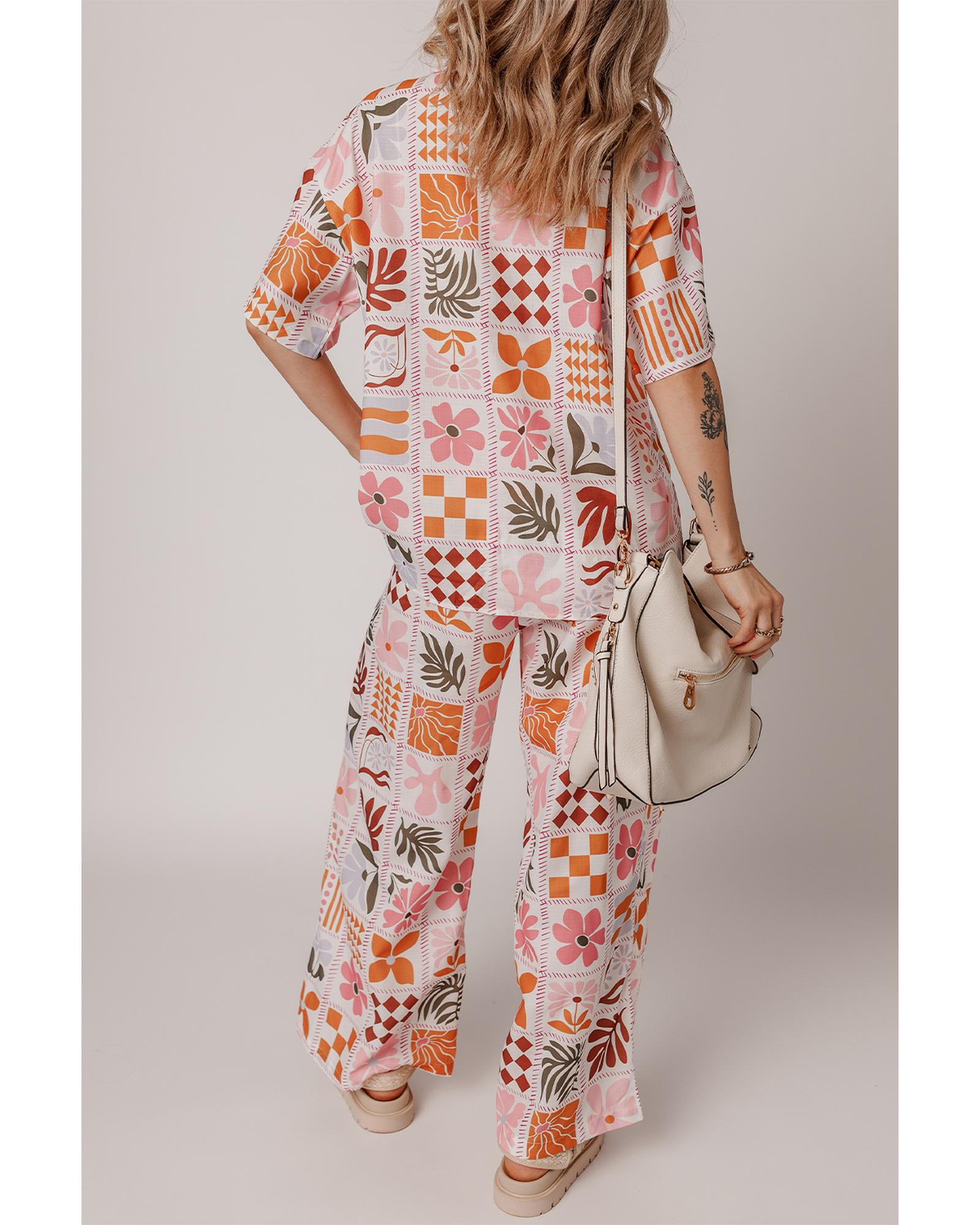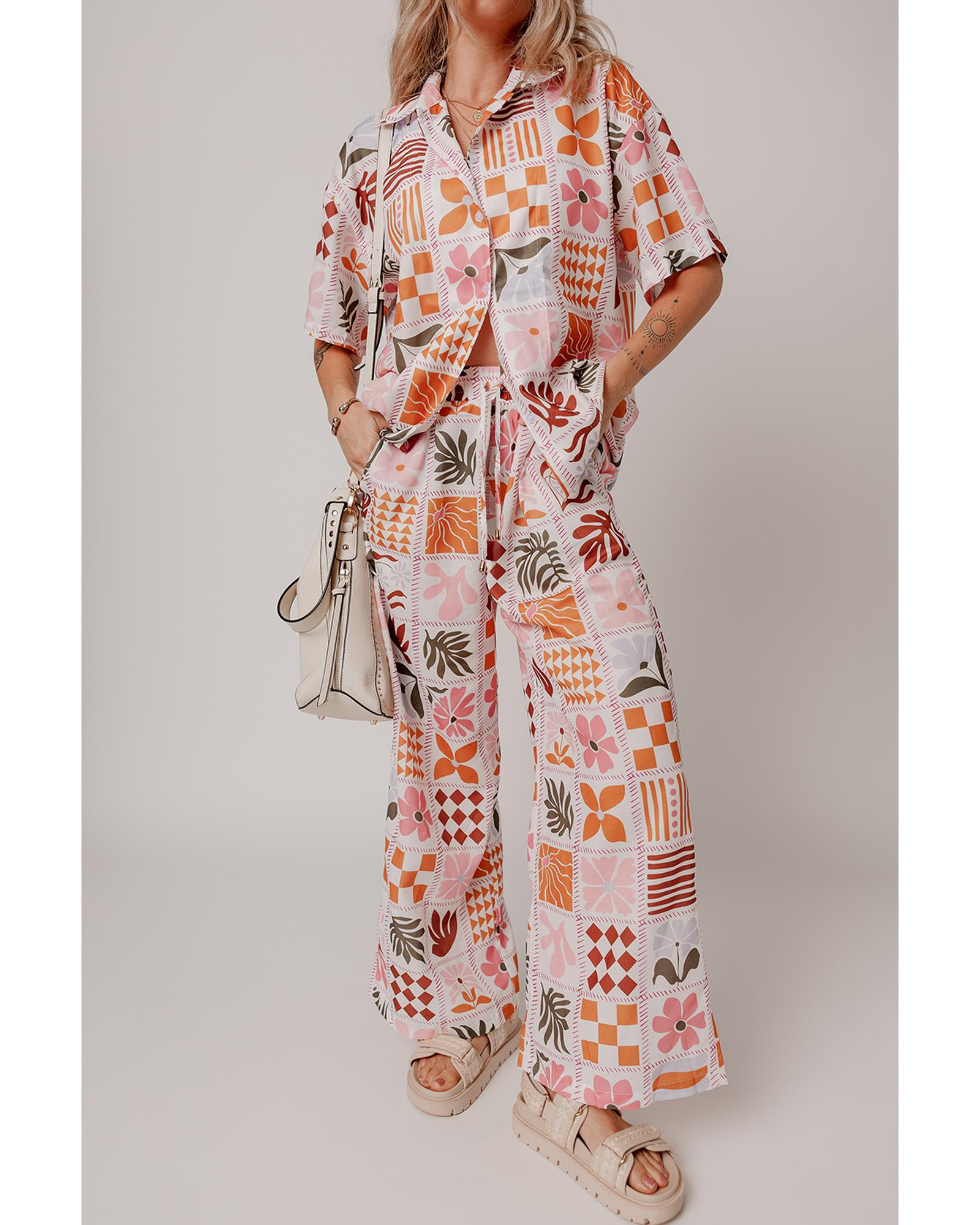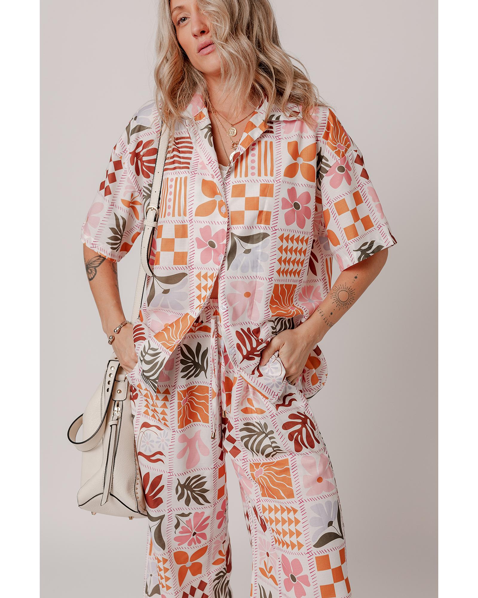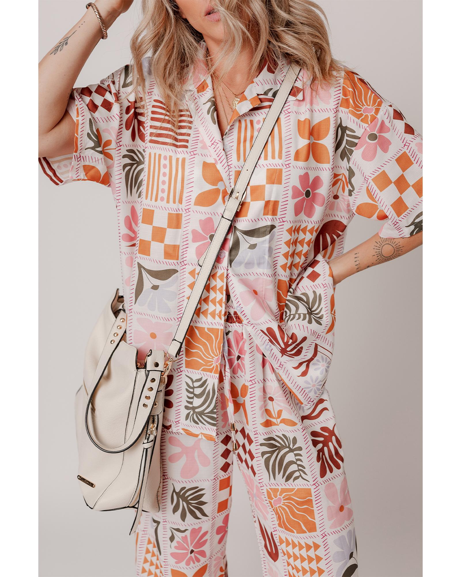 Orange Plant Checkered Print Collared Shirt and Wide Leg Pants Set – L