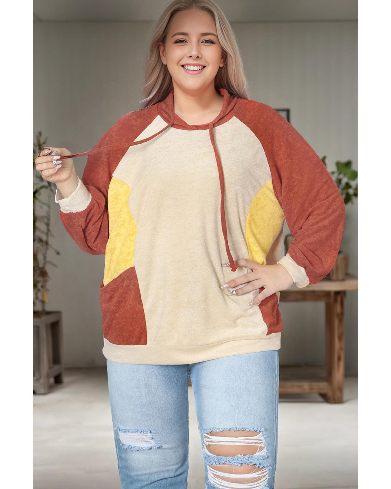 Orange Plus Size Colorblock Raglan Hoodie with Pockets – 2X