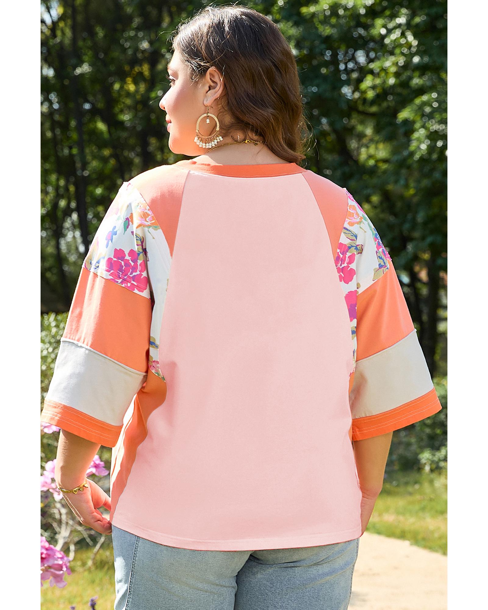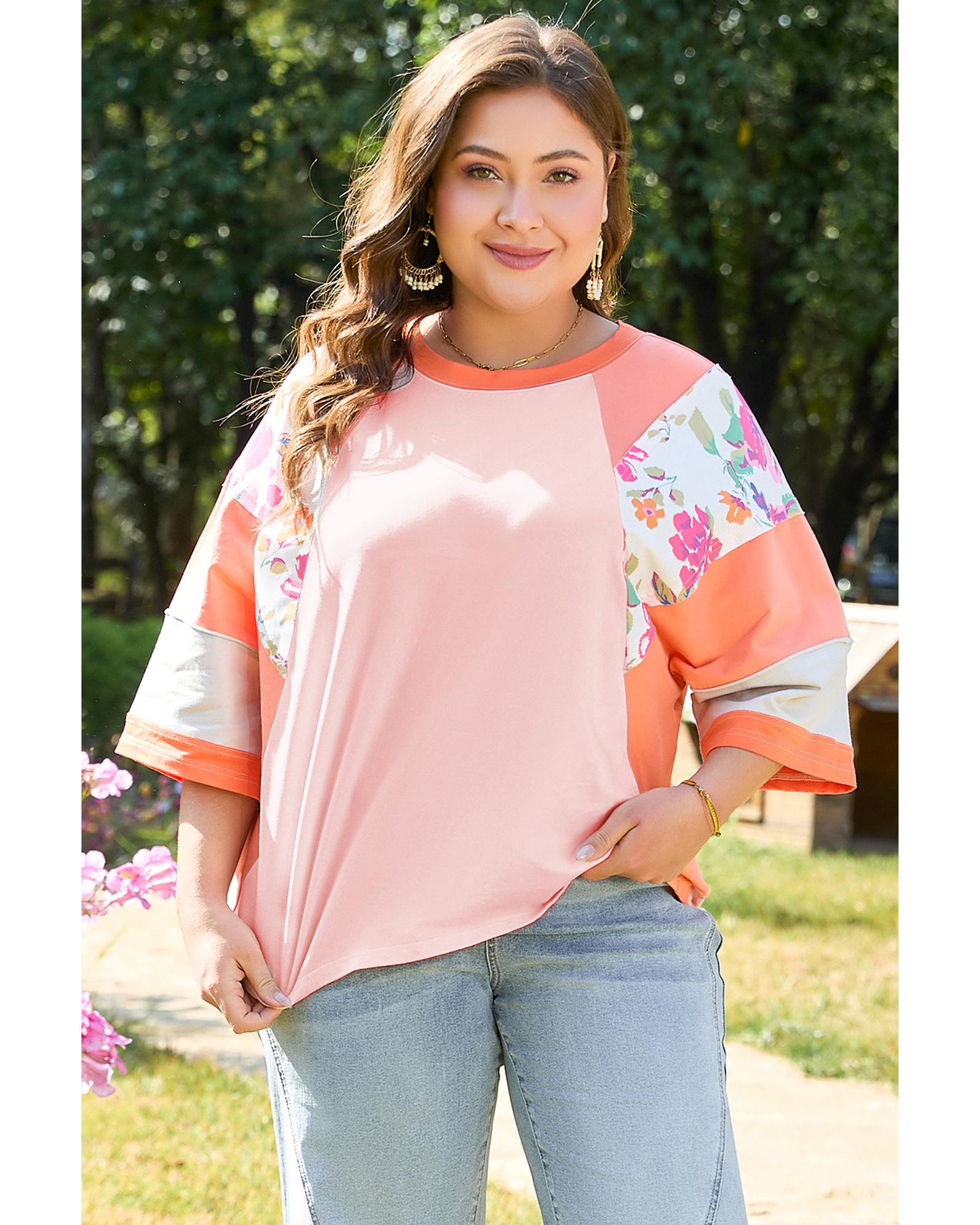 • Orange plus size floral print patchwork raglan half sleeve top