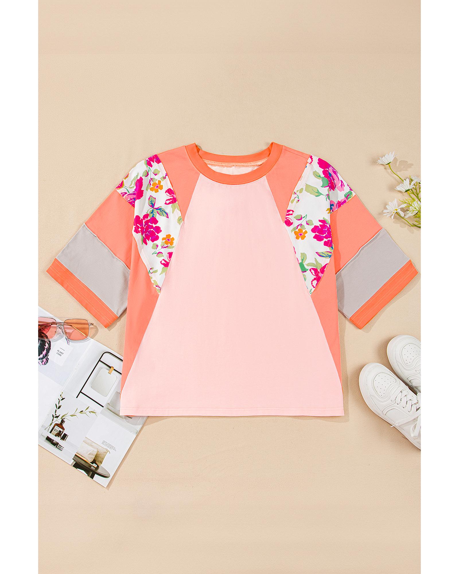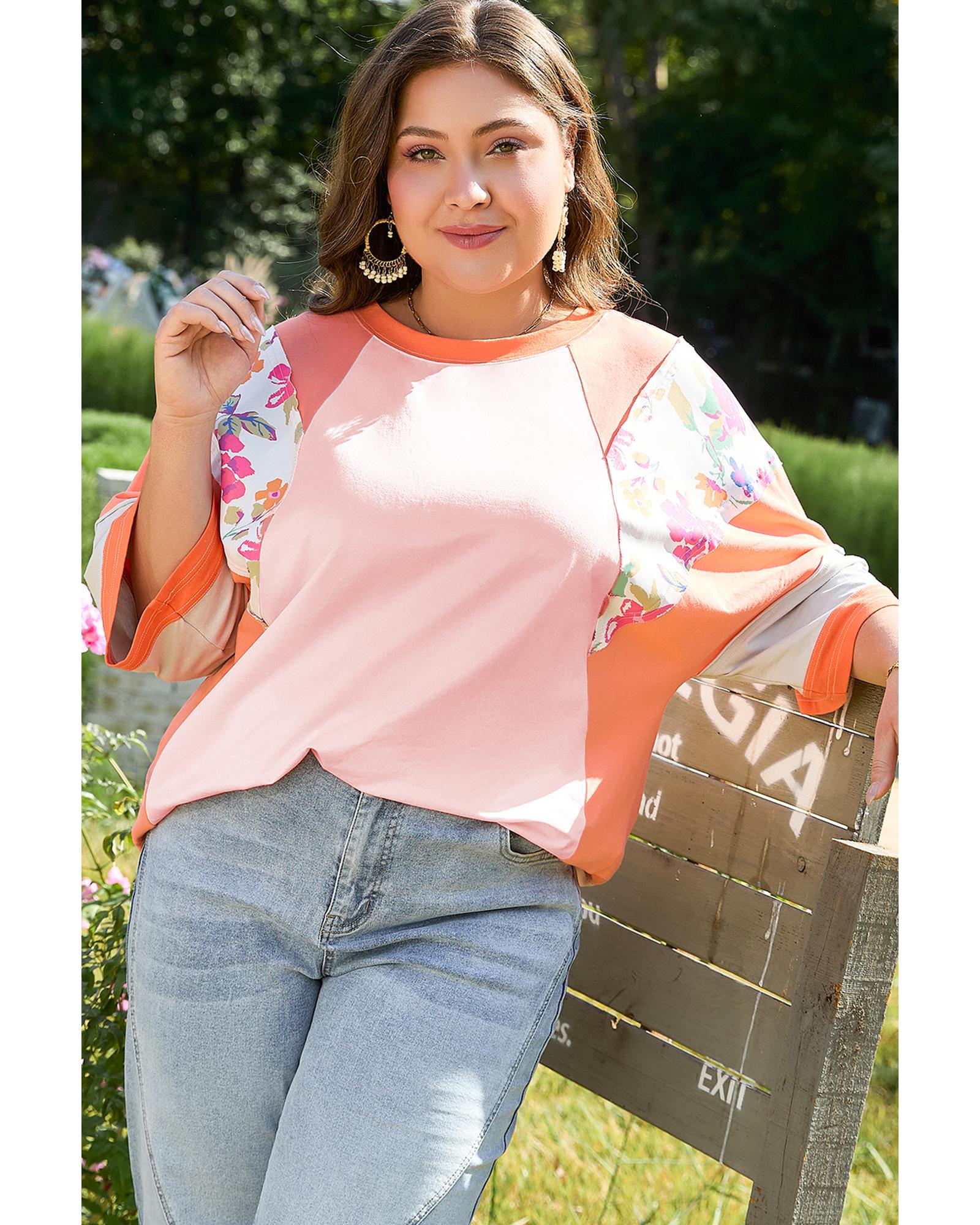 Orange Plus Size Floral Print Patchwork Raglan Half Sleeve Top – 3X