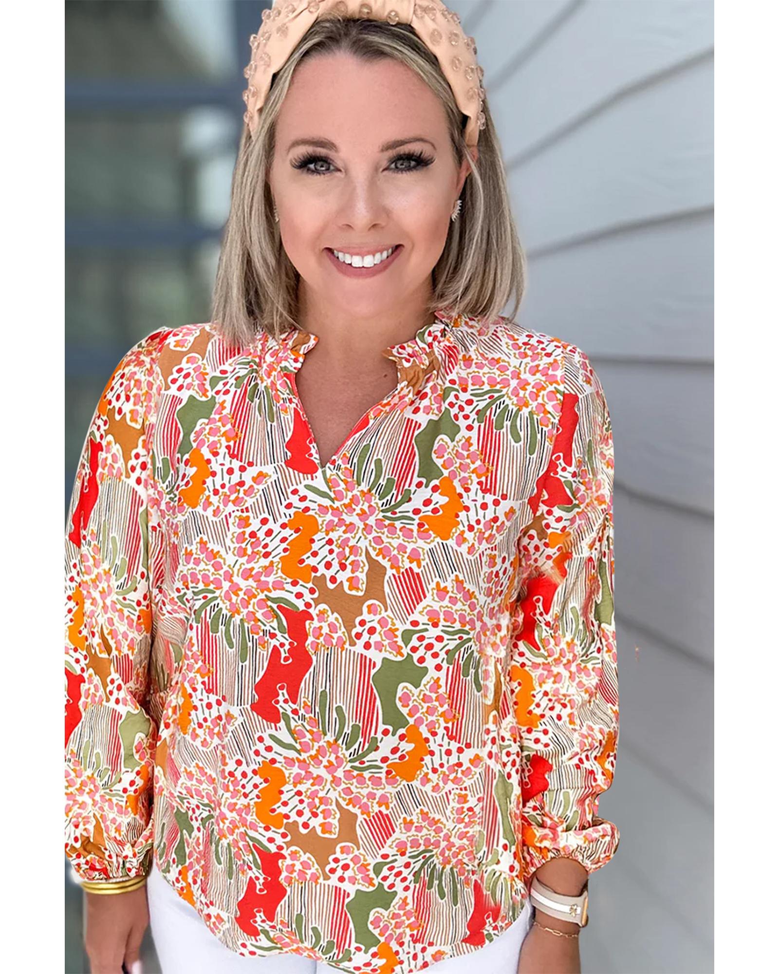 Orange Printed Floral Abstract Print Frilled V Neck Plus Size Blouse – 3X