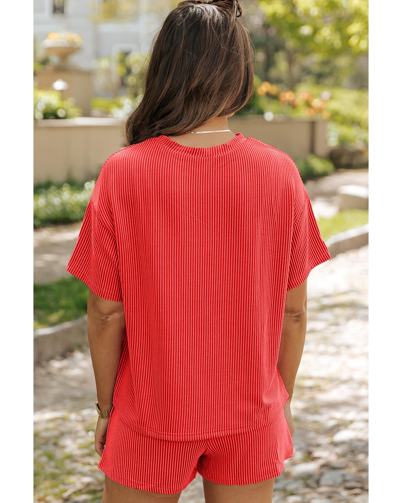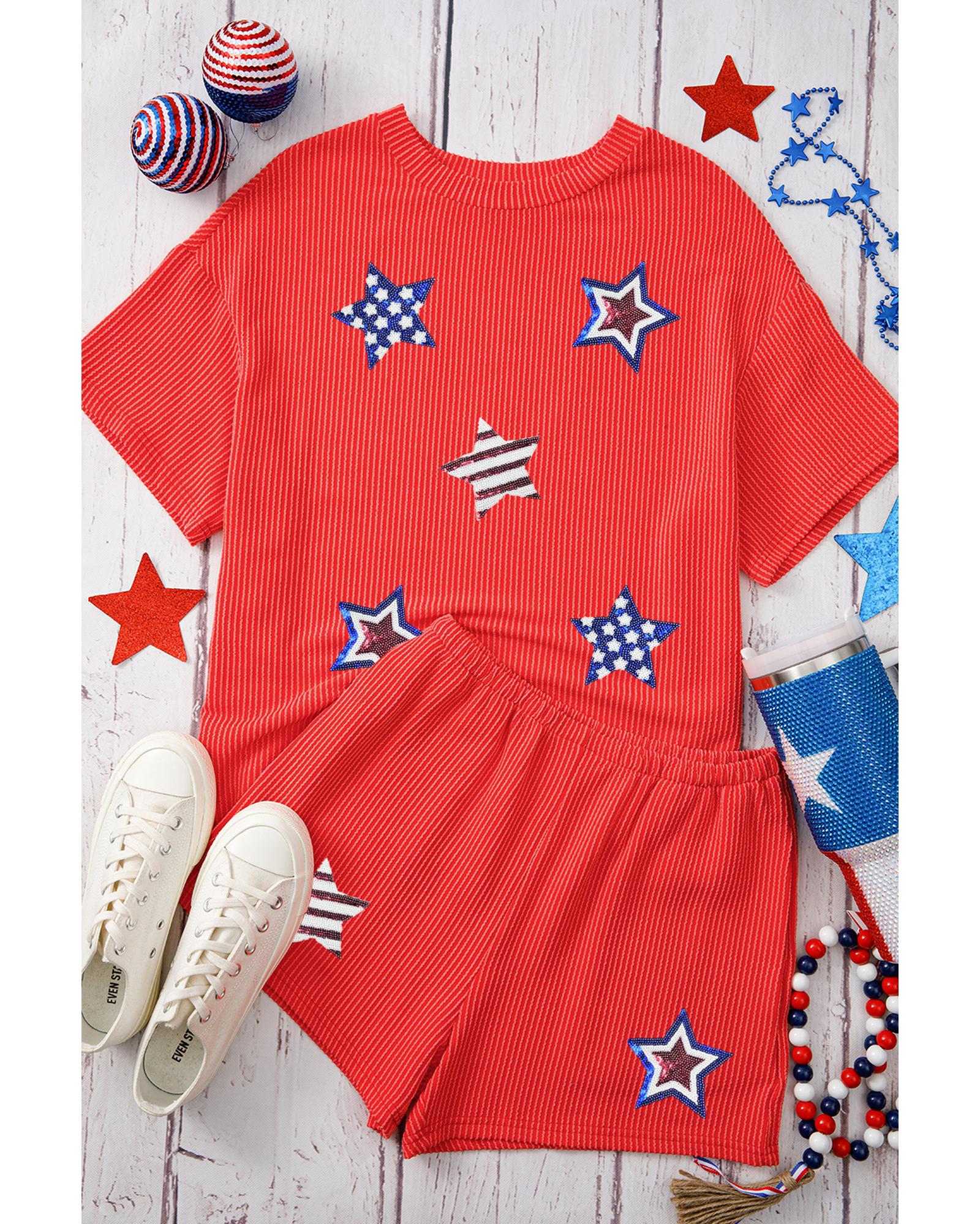 • Orange Sequin USA Flag Star Graphic Corded T Shirt and Shorts Set