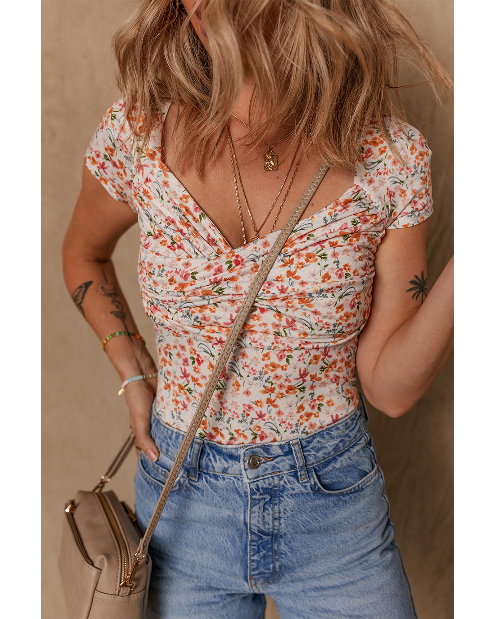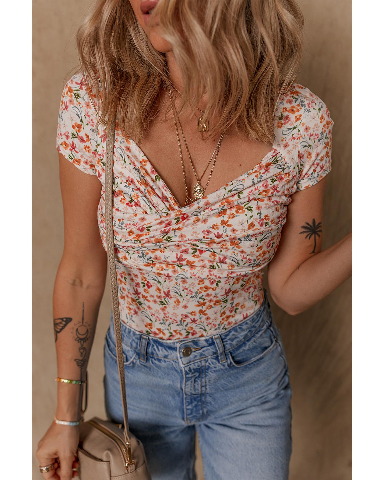 Orange Short Sleeve Floral Ruched Sweetheart Bodysuit – S