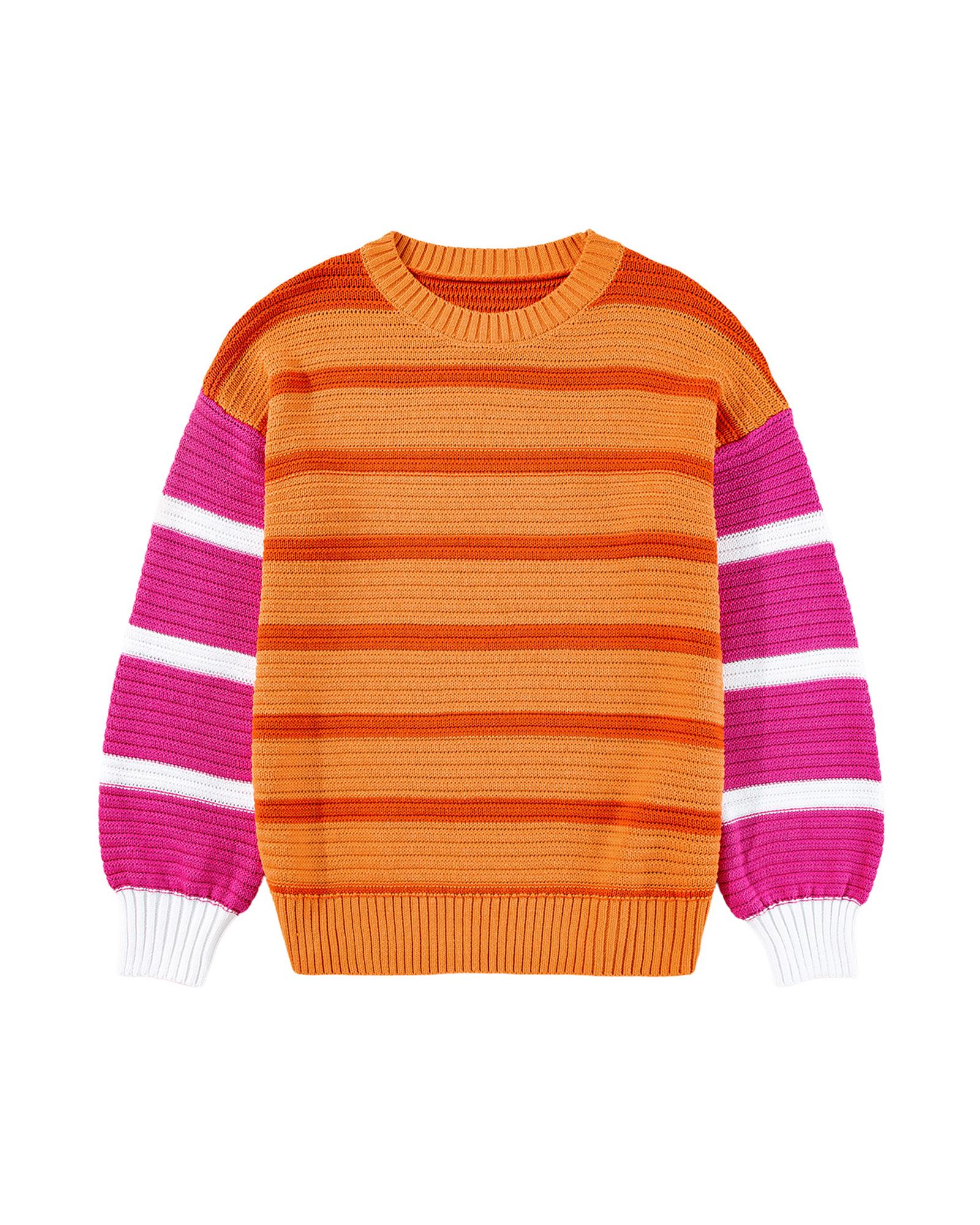 Orange Stripe Colorblock Crew Neck Drop Shoulder Loose Sweater – M