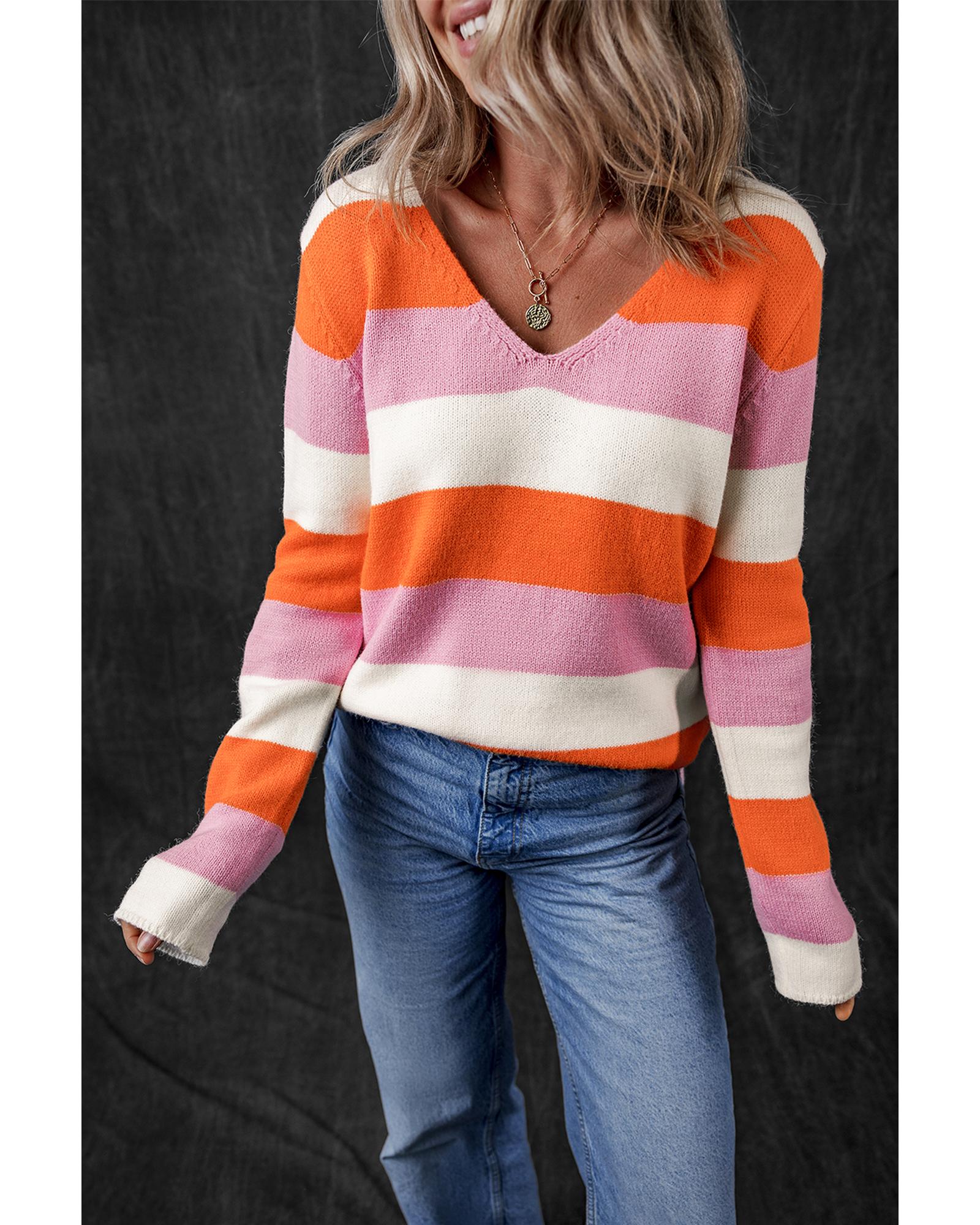 Orange Stripe Colorblock V Neck Casual Sweater – S