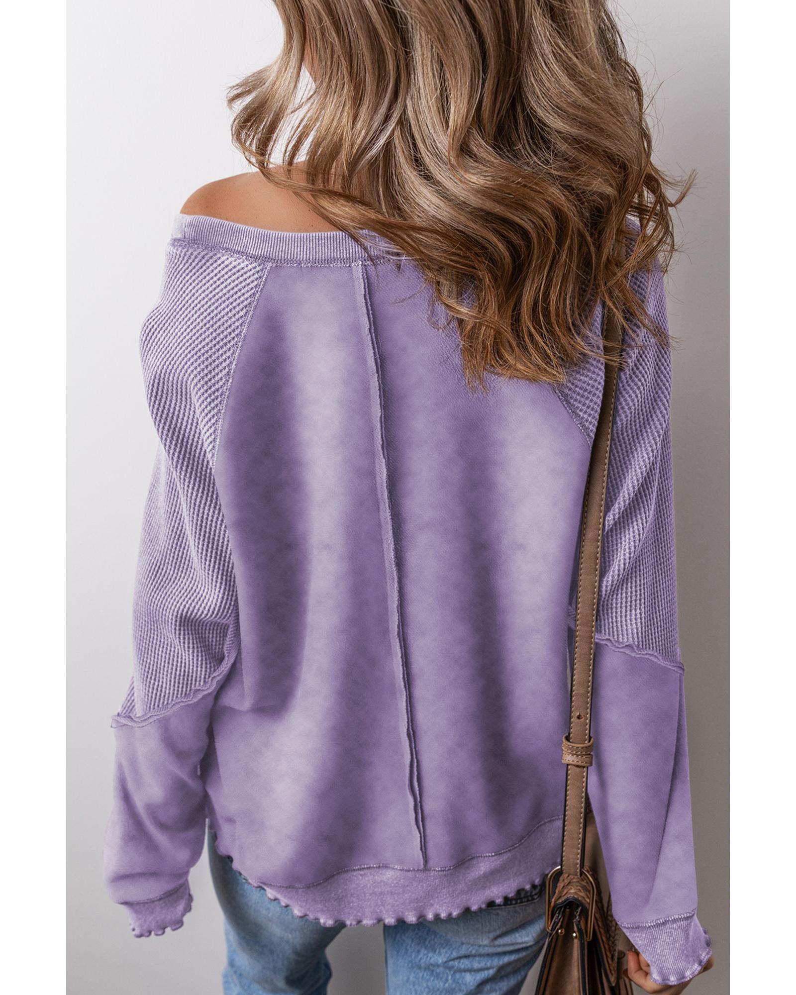 Orchid Petal Solid Waffle Knit Patchwork Raglan Sleeve Sweatshirt – M