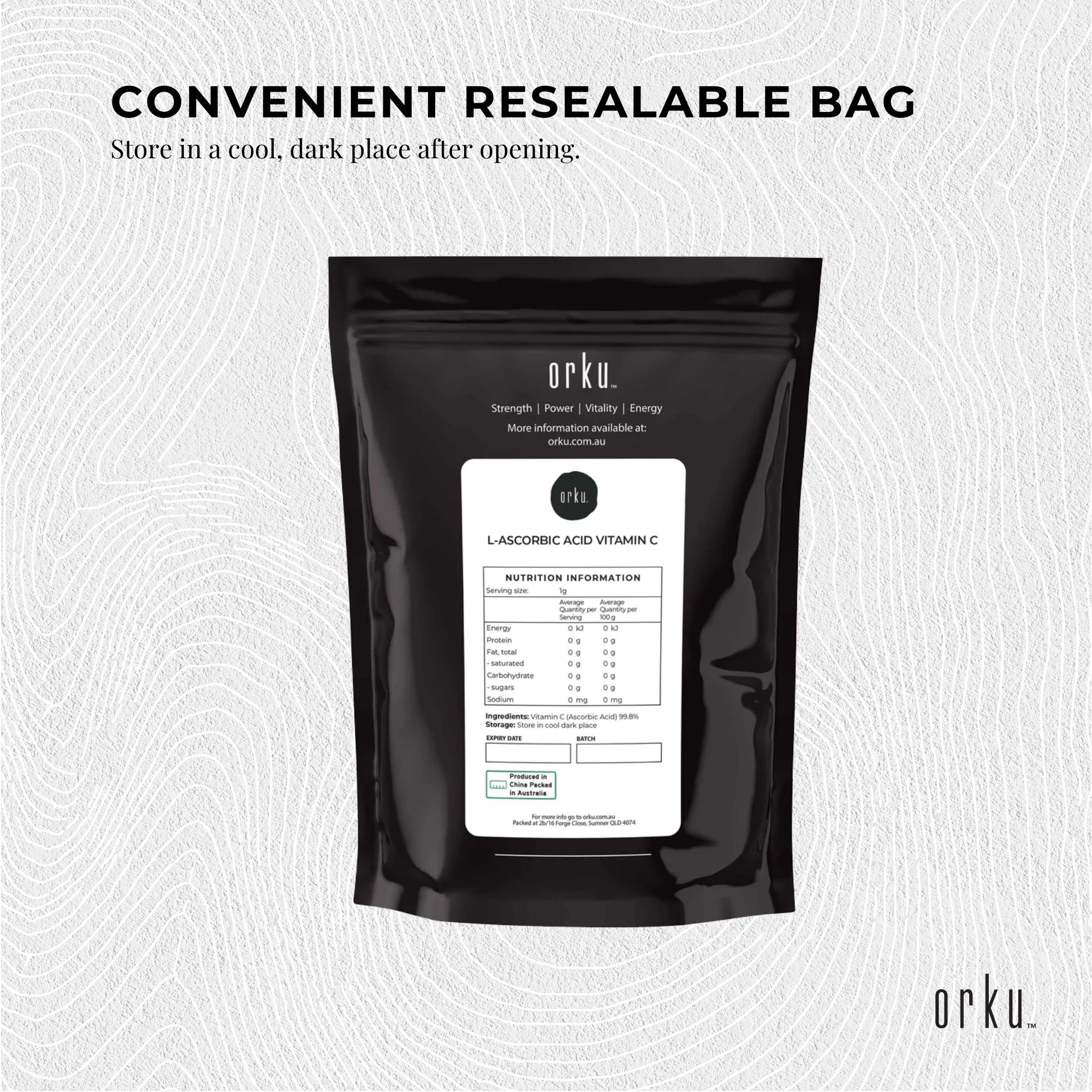 Pure Vitamin C Powder available in in resealable bags.