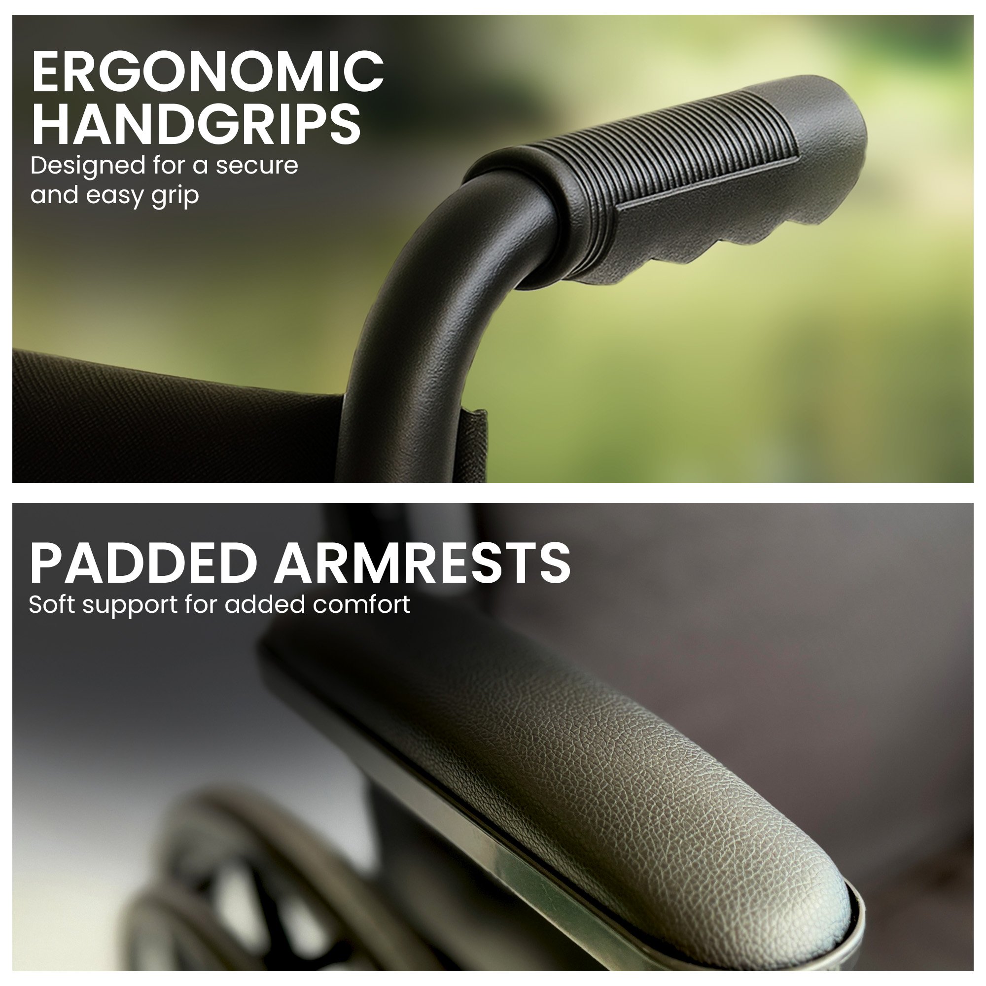 Move comfortably and stay in control. The Orthonica 24-Inch Wheelchair is lightweight, foldable and ready to go wherever you need it. A strong steel frame supports padded armrests and adjustable footrests for added comfort on the move.
