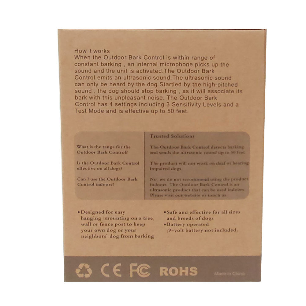 This Ultrasonic Bark Control Device is designed to control nuisance barking. Designed specifically for outdoor use, this Deluxe Outdoor Ultrasonic Bark Control device is durable and weatherproof.