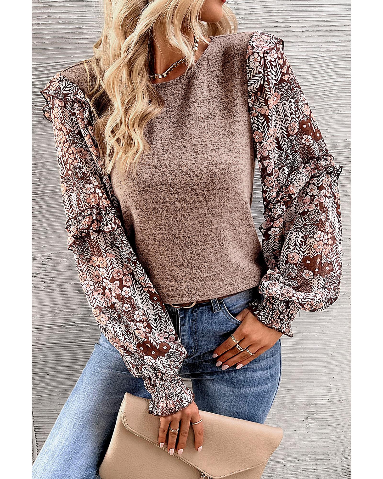 Pale Chestnut Ruffle Tiered Floral Sleeve Crew Neck Blouse – M