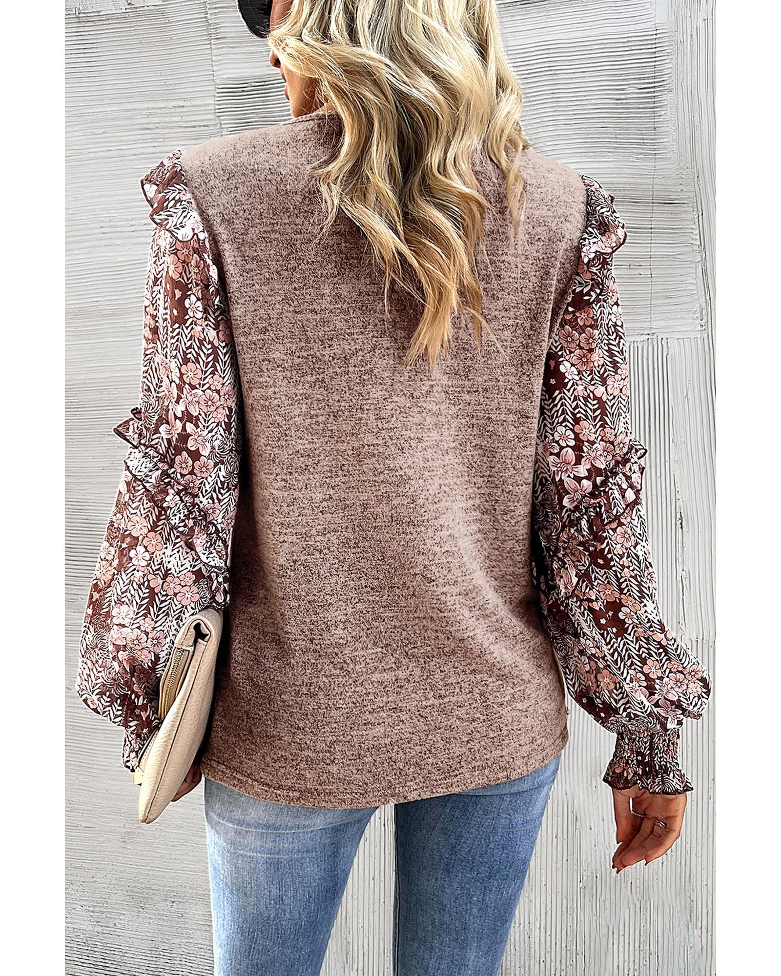 Pale Chestnut Ruffle Tiered Floral Sleeve Crew Neck Blouse – S