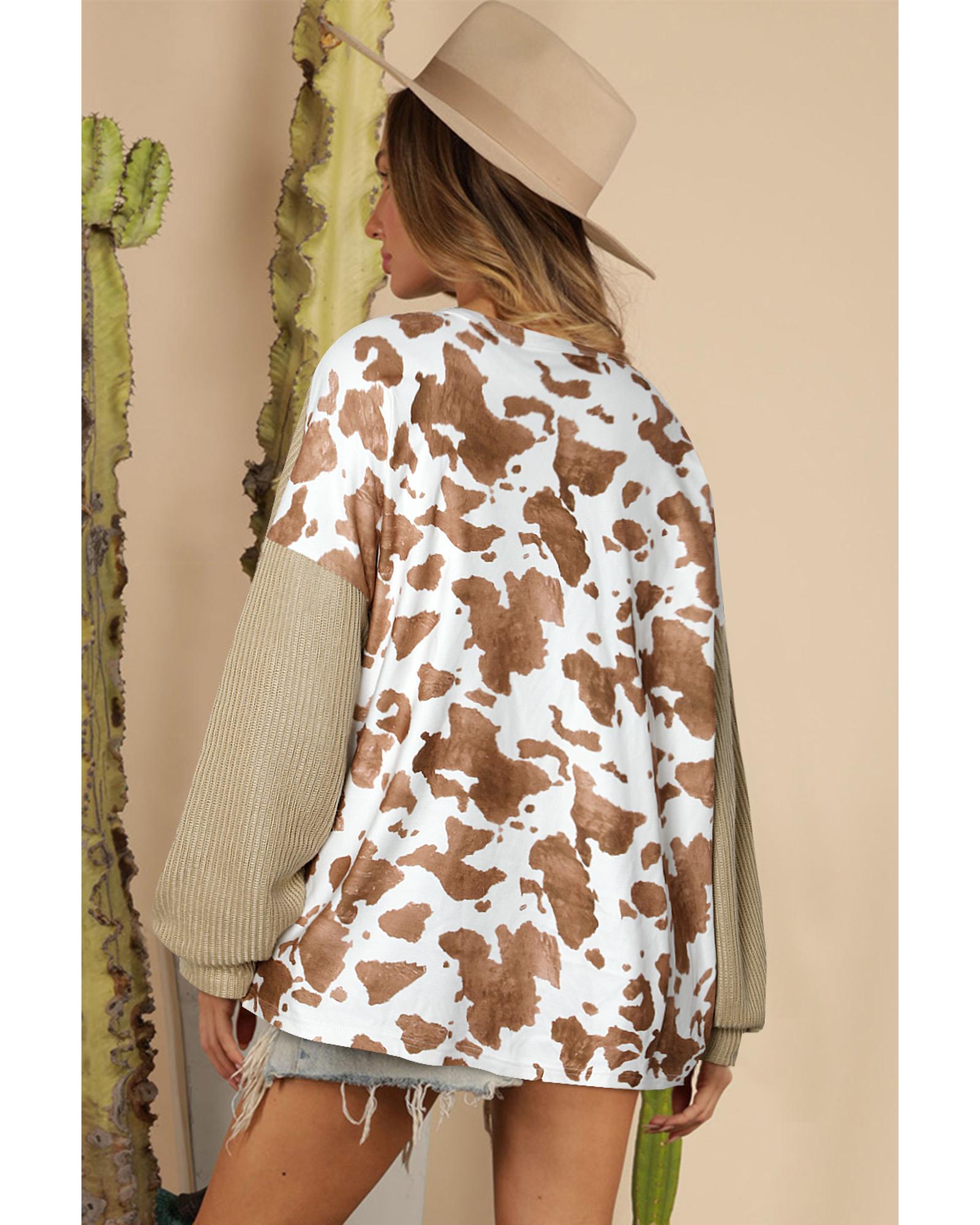 Pale Khaki Animal Print Textured Patch Lantern Sleeve Henley Blouse – S