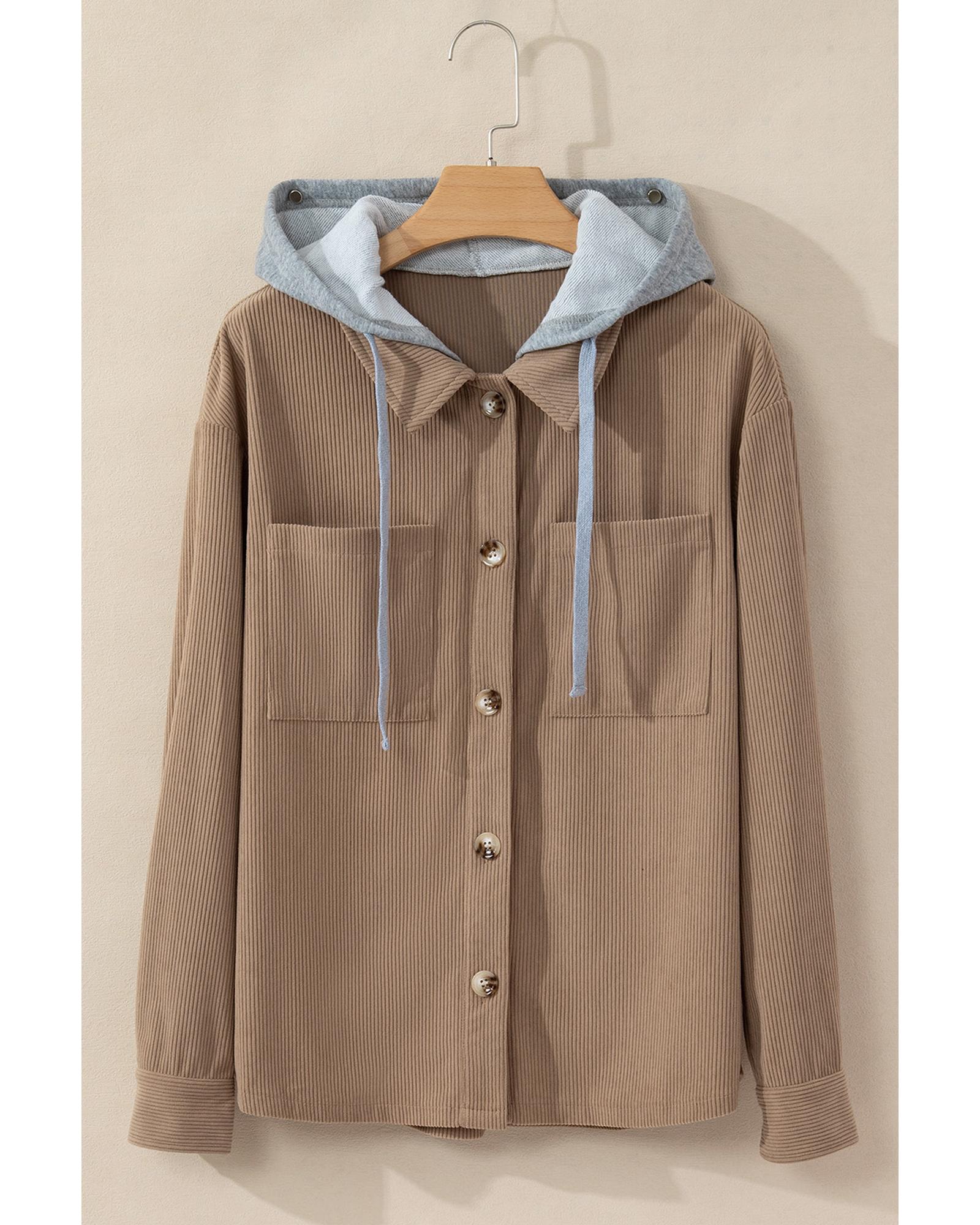 Pale Khaki Hooded Drawstring Pockets Corduroy Shacket – L